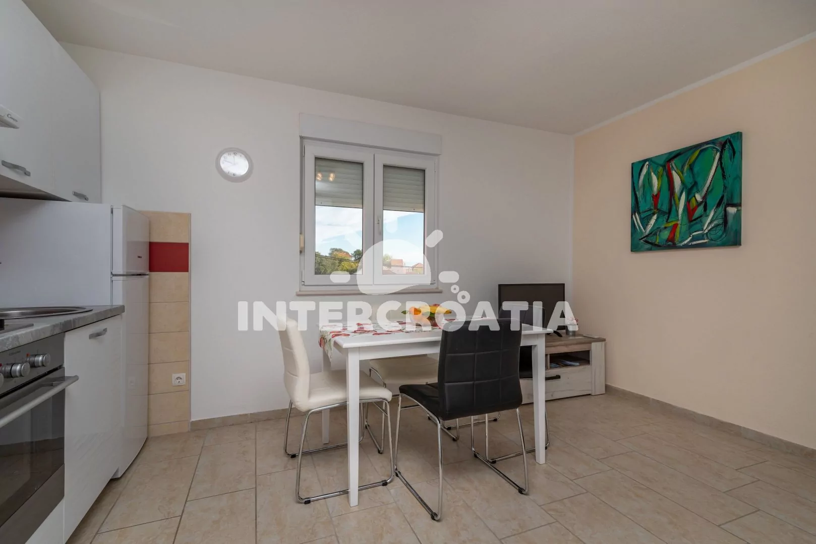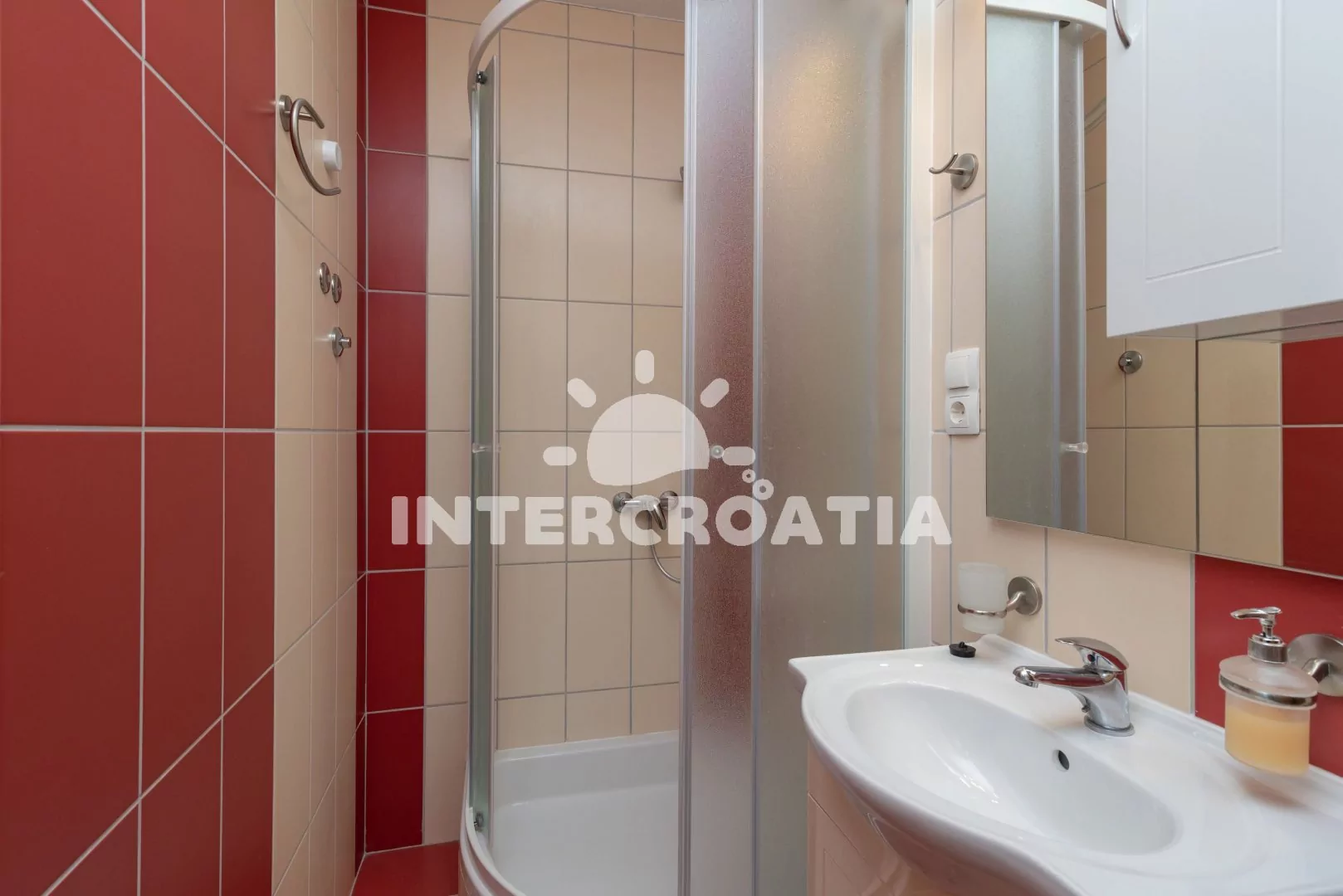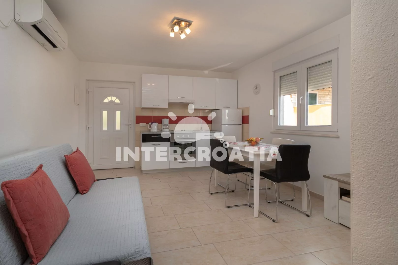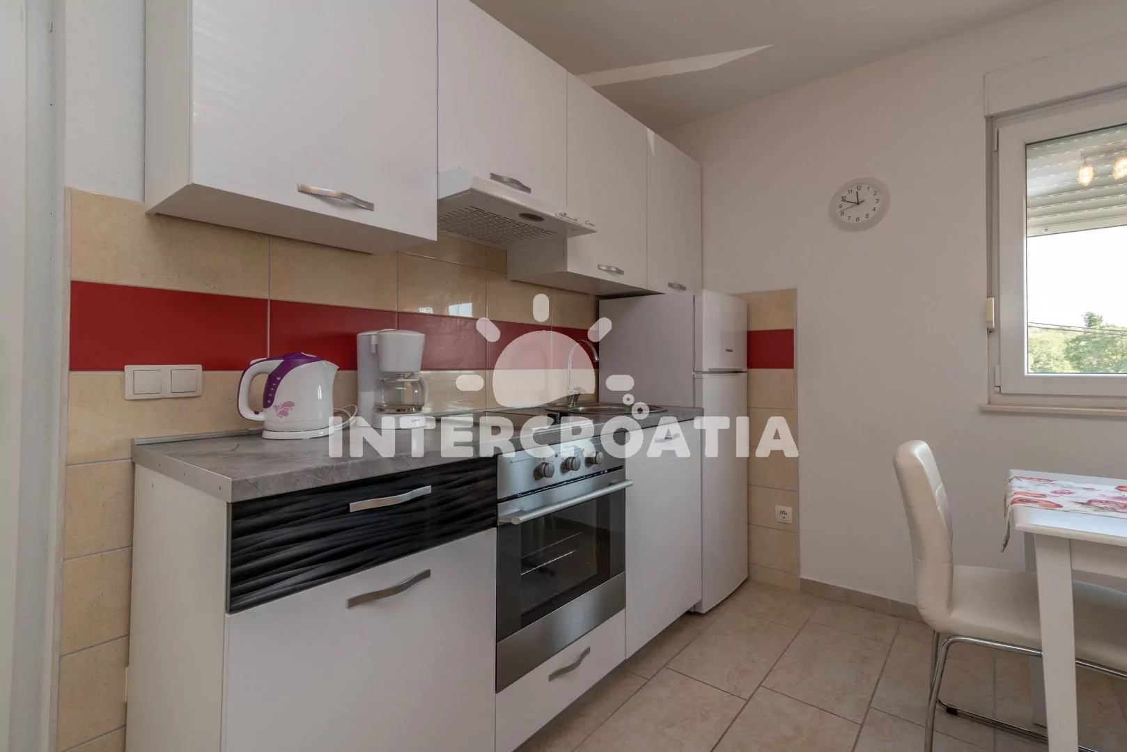 Apartmán (60 m2) s terasou, posezením a výhledem na moře se nachází v 1. patře vily. Apartmán má 2 ložnice a je vhodný pro 4 až 5 osob. Obývací pokoj je spojený s kuchyní. Kuchyňská linka je vybavena dvouplotýnkovým vařičem, digestoří, vestavěnou troubou, kávovarem, toustovačem, nádobím a lednicí s mrazákem. Obývací pokoj s jídelním stolem pro 4 osoby, pohovkou (rozložitelná na extra lůžko pro 1 osobu), televizí se satelitním programem a klimatizací. První ložnice s dvoulůžkem a vstupem na terasu. Druhá ložnice s dvoulůžkem. Koupelna se sprchovým koutem, umyvadlem, fénem a wc. Hostům je k dispozici parkování u objektu zdarma.