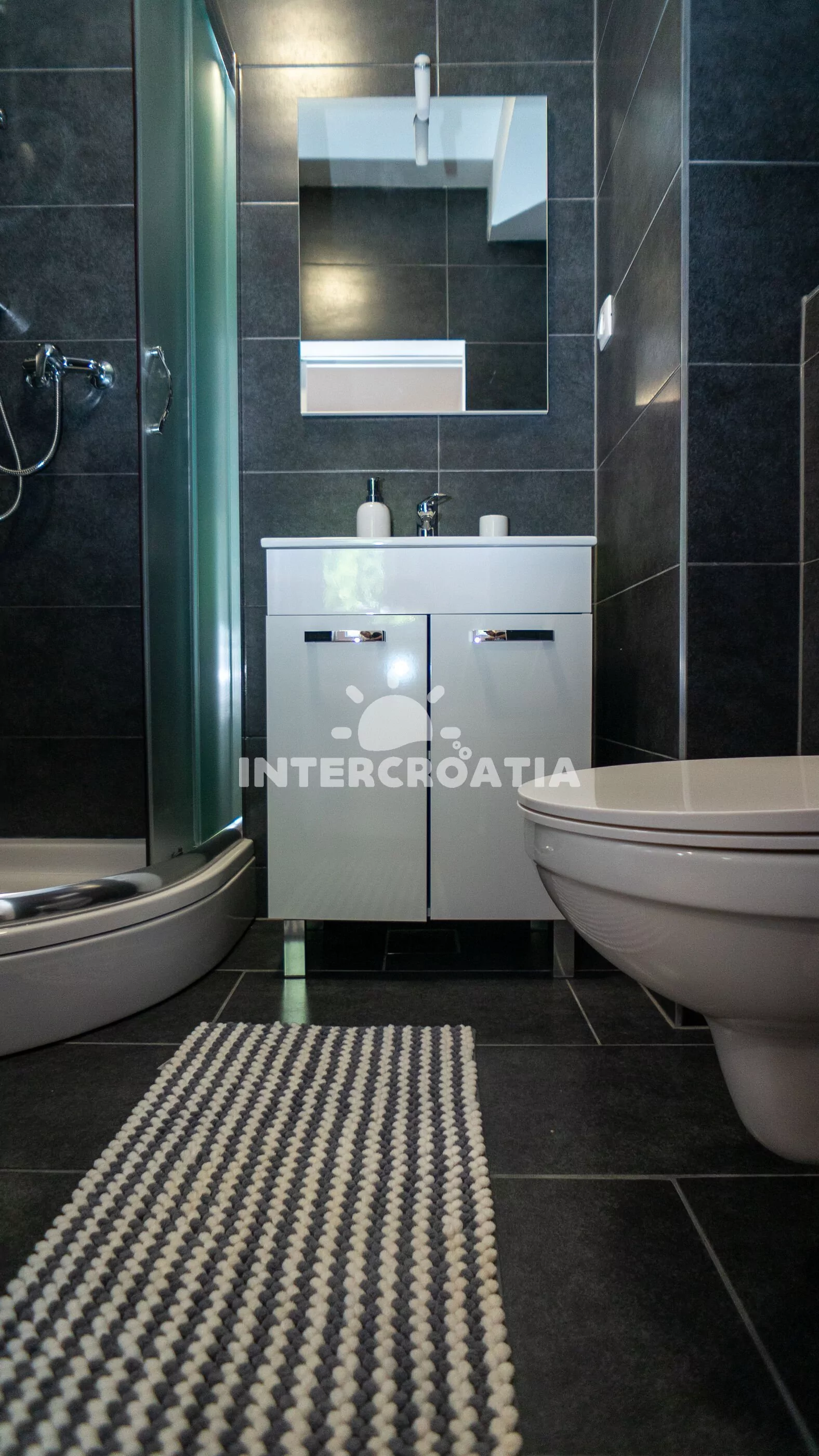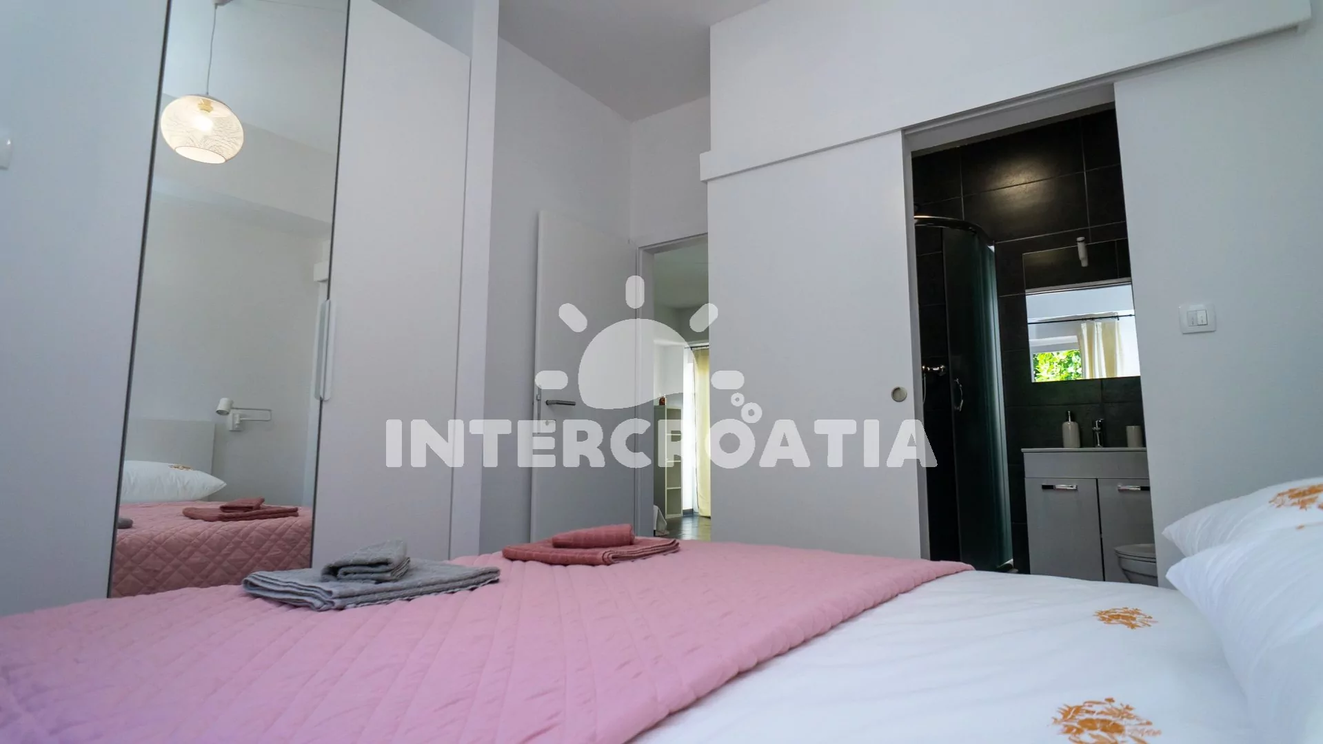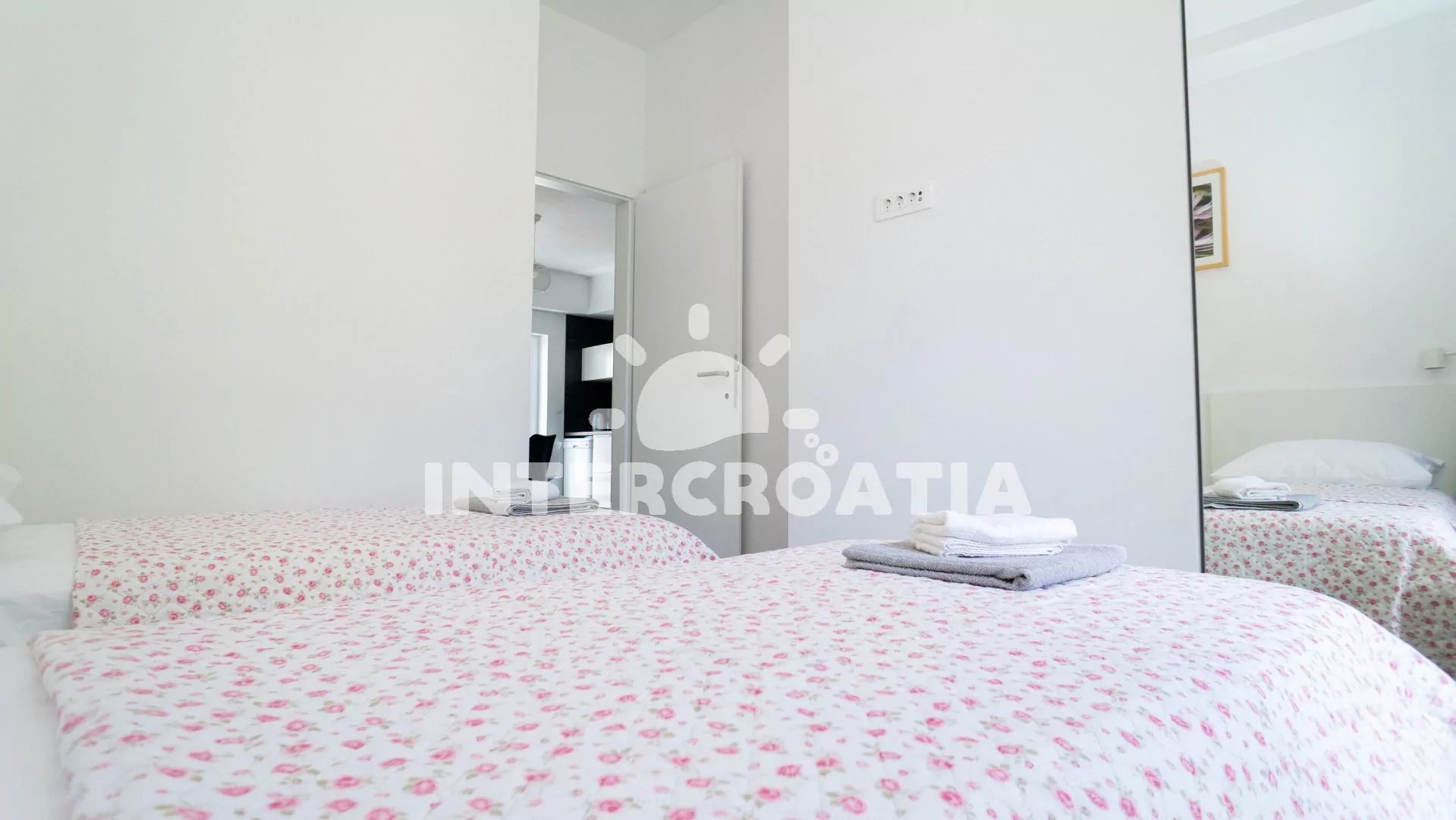 Apartmán (56 m2) s terasou a výhledem na moře se nachází v přízemí vily. Apartmán má 2 ložnice, 2 koupelny a je vhodný pro 4 až 5 osob. Obývací pokoj je spojený s kuchyní. Kuchyňská linka je vybavena sporákem s troubou, digestoří, myčkou na nádobí, rychlovarnou konvicí, kávovarem, nádobím a lednicí s mrazákem. Obývací pokoj s jídelním stolem, pohovkou (rozložitelná na extra lůžko pro 1 osobu), televizí se satelitním programem, klimatizací a vstupem na terasu. První ložnice s dvoulůžkem. Druhá ložnice s dvěma jednolůžky. Dvě koupelny se sprchovým koutem, umyvadlem a wc. Dále k dispozici fén, žehlička a pračka. Hostům je k dispozici parkování u objektu zdarma.