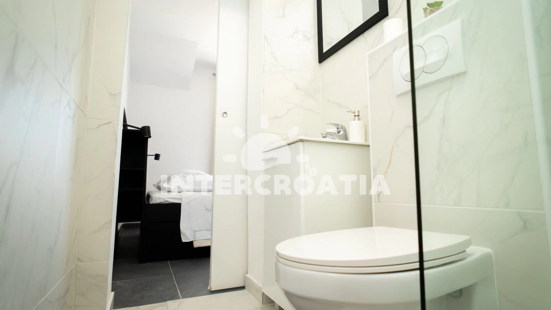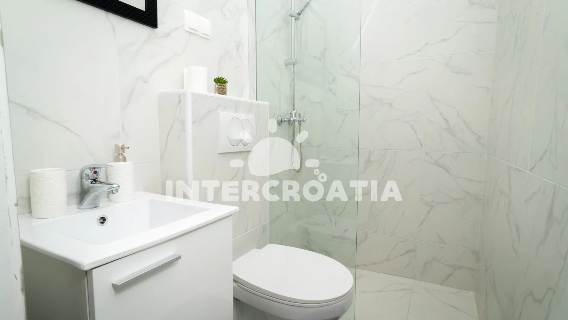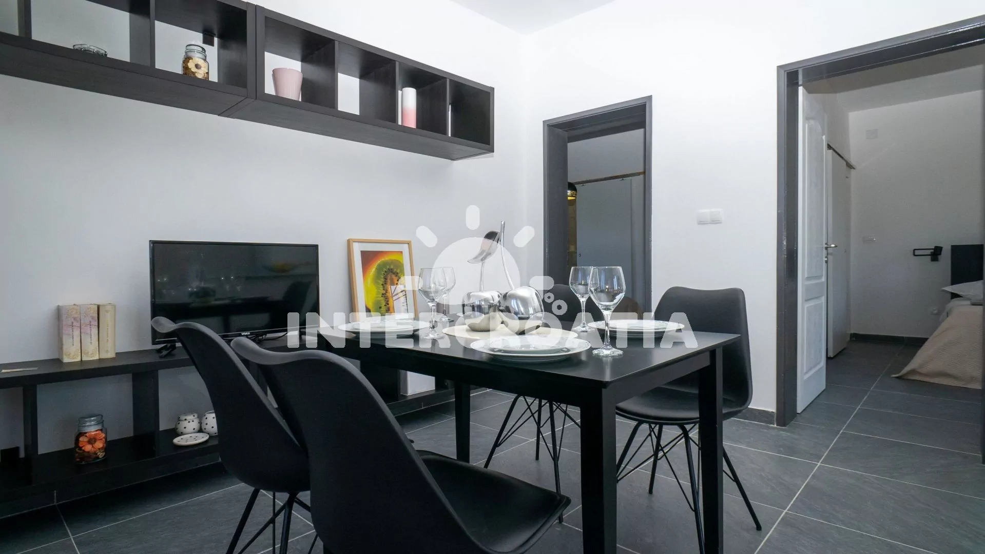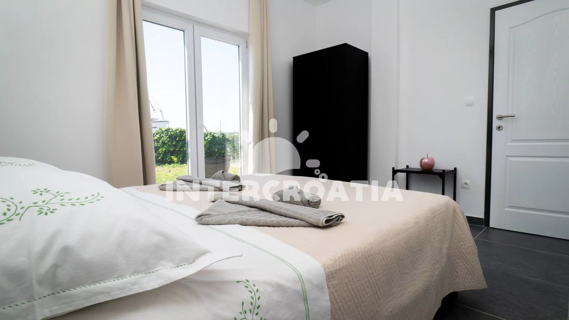 Apartmán (60 m2) s terasou a výhledem na moře se nachází v přízemí vily. Apartmán má 2 ložnice, 2 koupelny a je vhodný pro 4 až 5 osob. Obývací pokoj je spojený s kuchyní. Kuchyňská linka je vybavena sporákem s troubou, digestoří, myčkou na nádobí, rychlovarnou konvicí, kávovarem, nádobím a lednicí s mrazákem. Obývací pokoj s jídelním stolem, pohovkou (rozložitelná na extra lůžko pro 1 osobu), televizí se satelitním programem, klimatizací a vstupem na terasu. První i druhá ložnice je vybavena vždy s jedním dvoulůžkem. Dvě koupelny se sprchovým koutem, umyvadlem a wc. Dále k dispozici fén, žehlička a pračka. Hostům je k dispozici parkování u objektu zdarma.