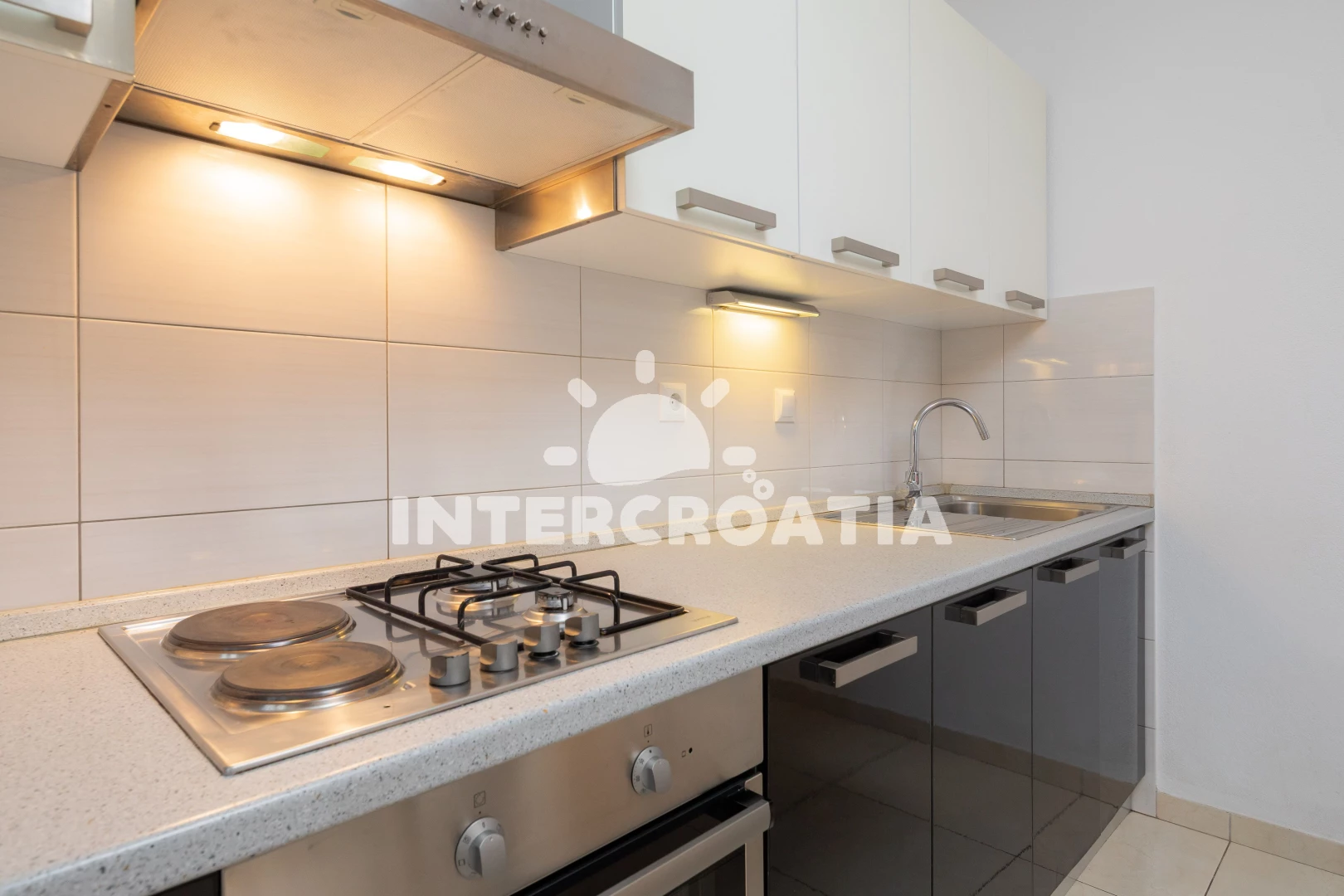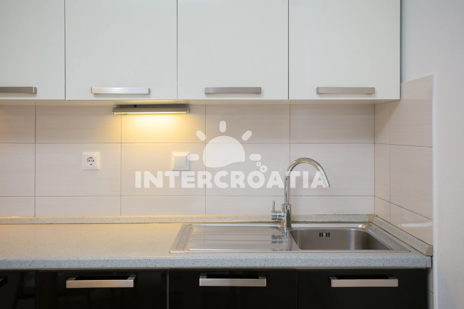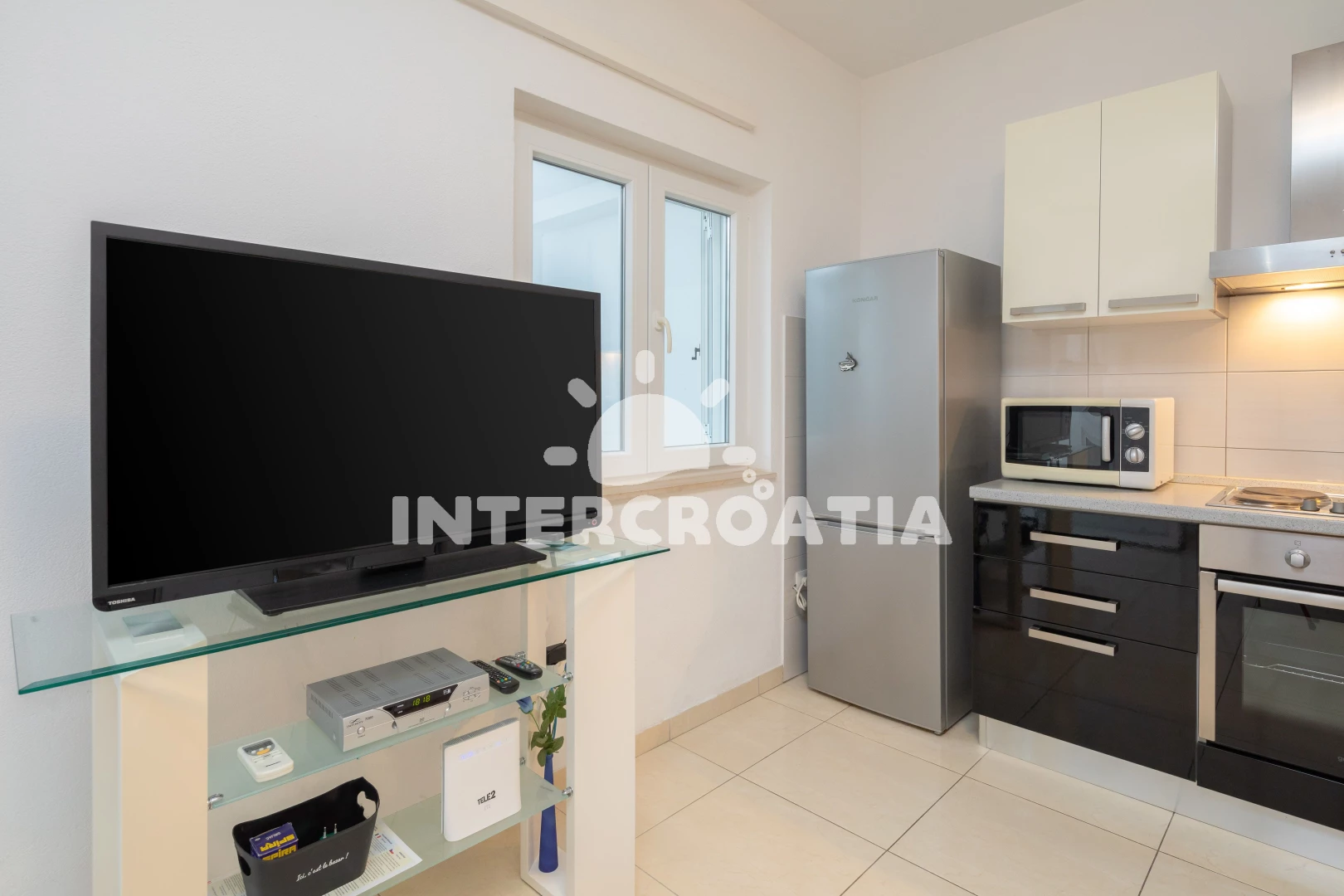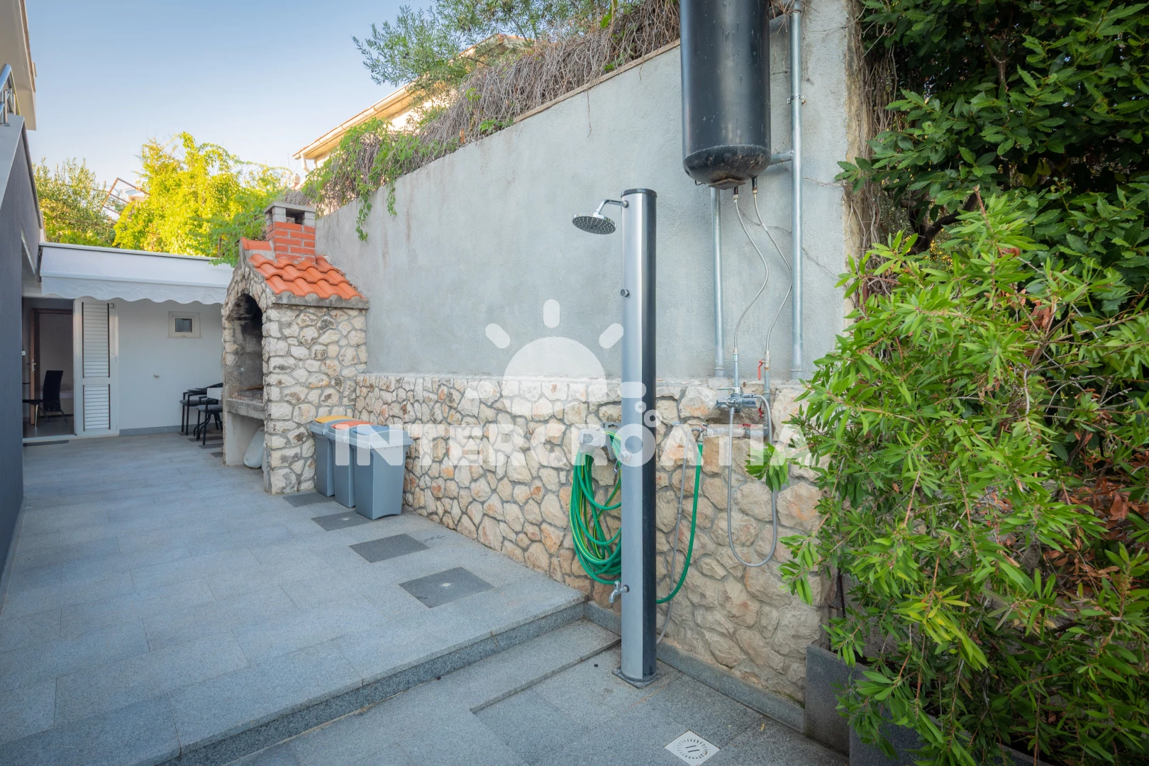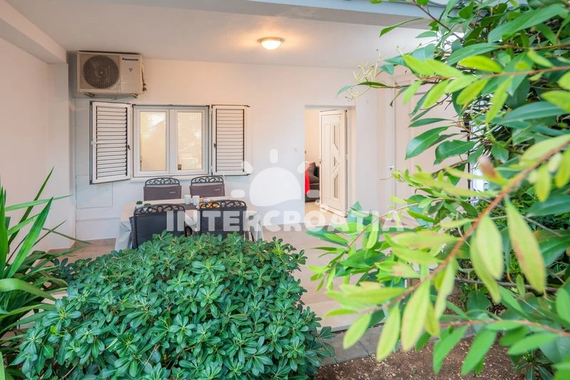 Apartmán se nachází 60 m od moře a pláže. Pláž je kamenné a betonové desky. U objektu je k dispozici společná zahrada s posezením a grilem.
