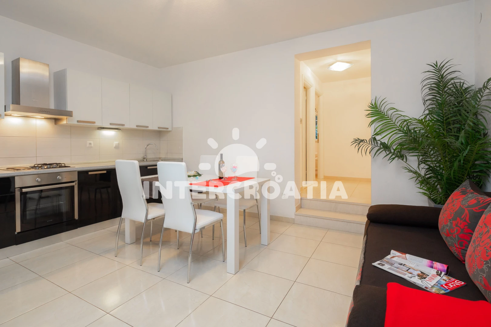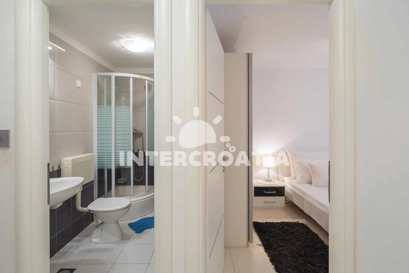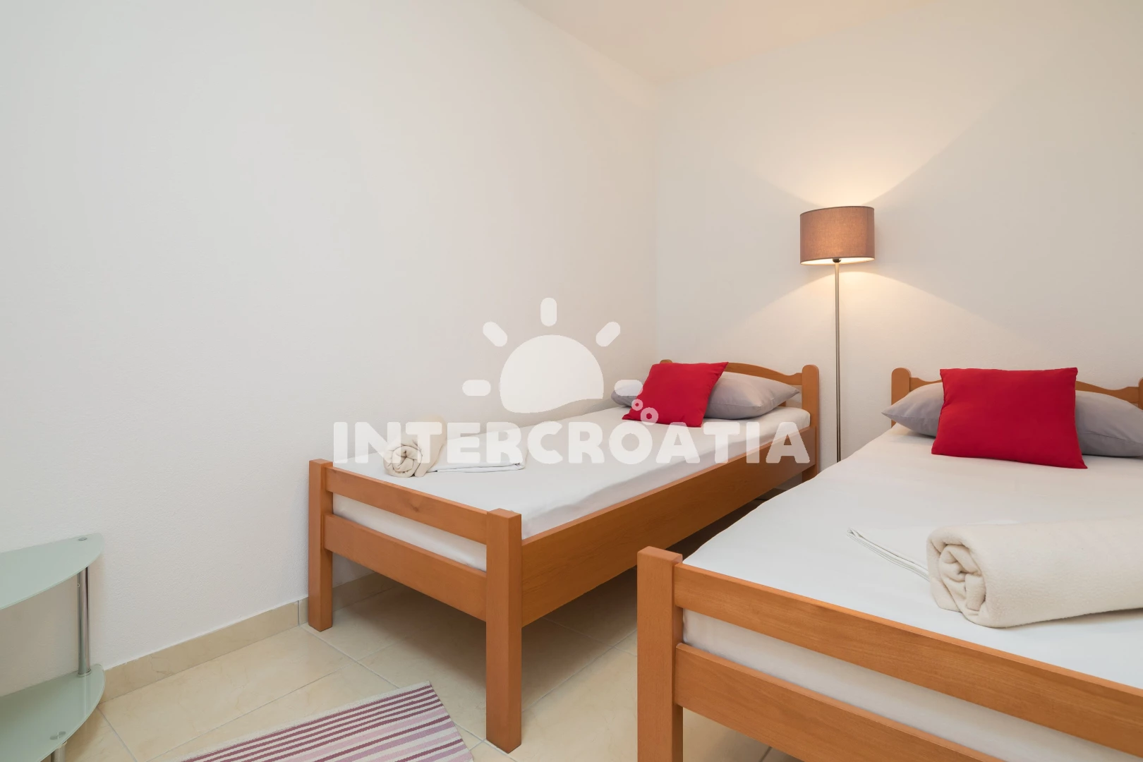 Vzdálenosti: Moře 40 m, pláž 60 m (kamenné a betonové desky), supermarket 300 m, centrum 400 m, restaurace 400 m, bar 400 m, půjčovna kol 500 m, diskotéka 500 m, mini golf 500 m, veřejná doprava 700 m, pošta 2,5 km, banka 2,5 km, ambulance 2,5 km, lékárna 2,5 km, čerpací stanice 3 km, trajekt (Trogir) 4 km, letiště (Split) 5 km,