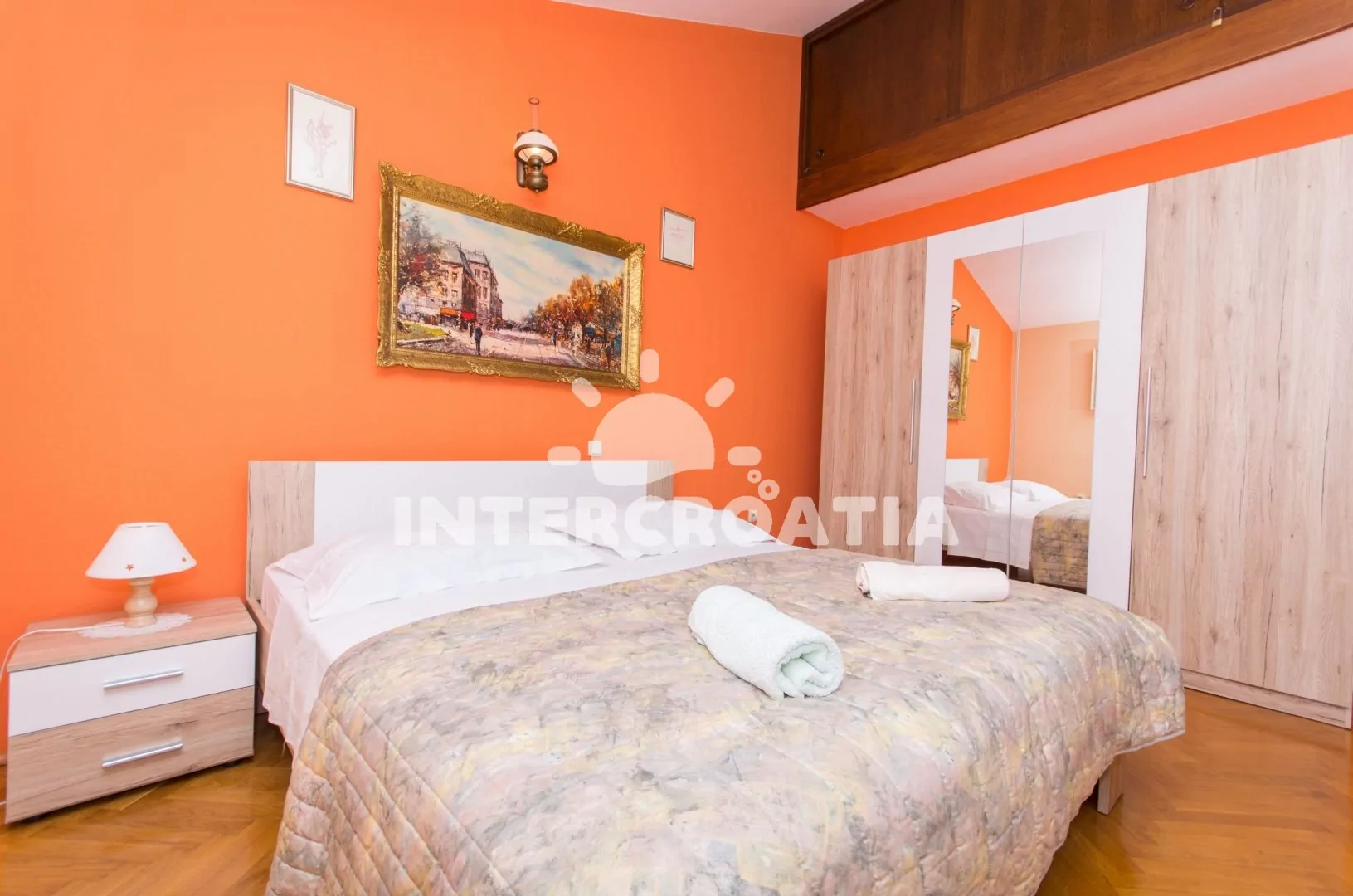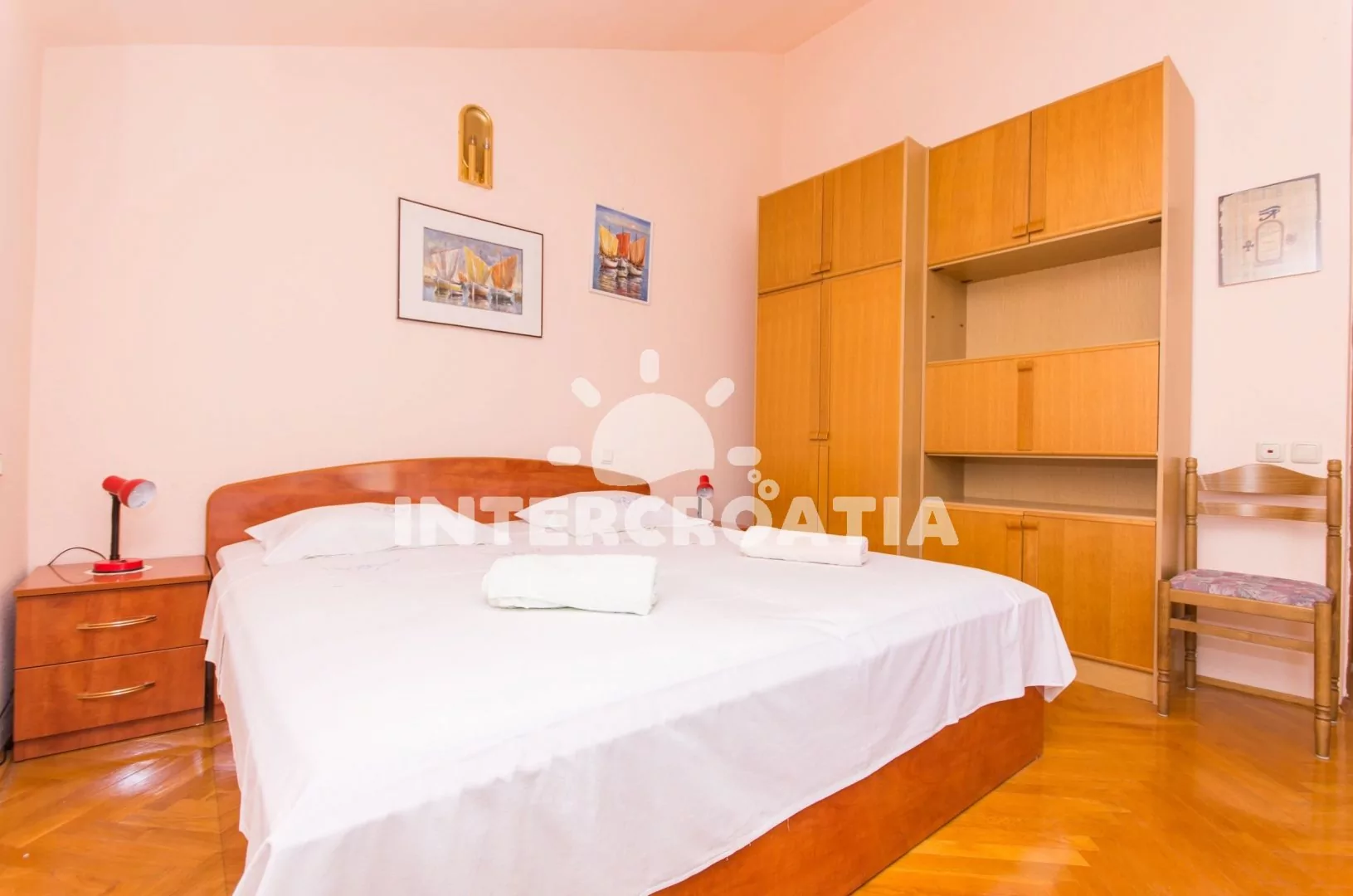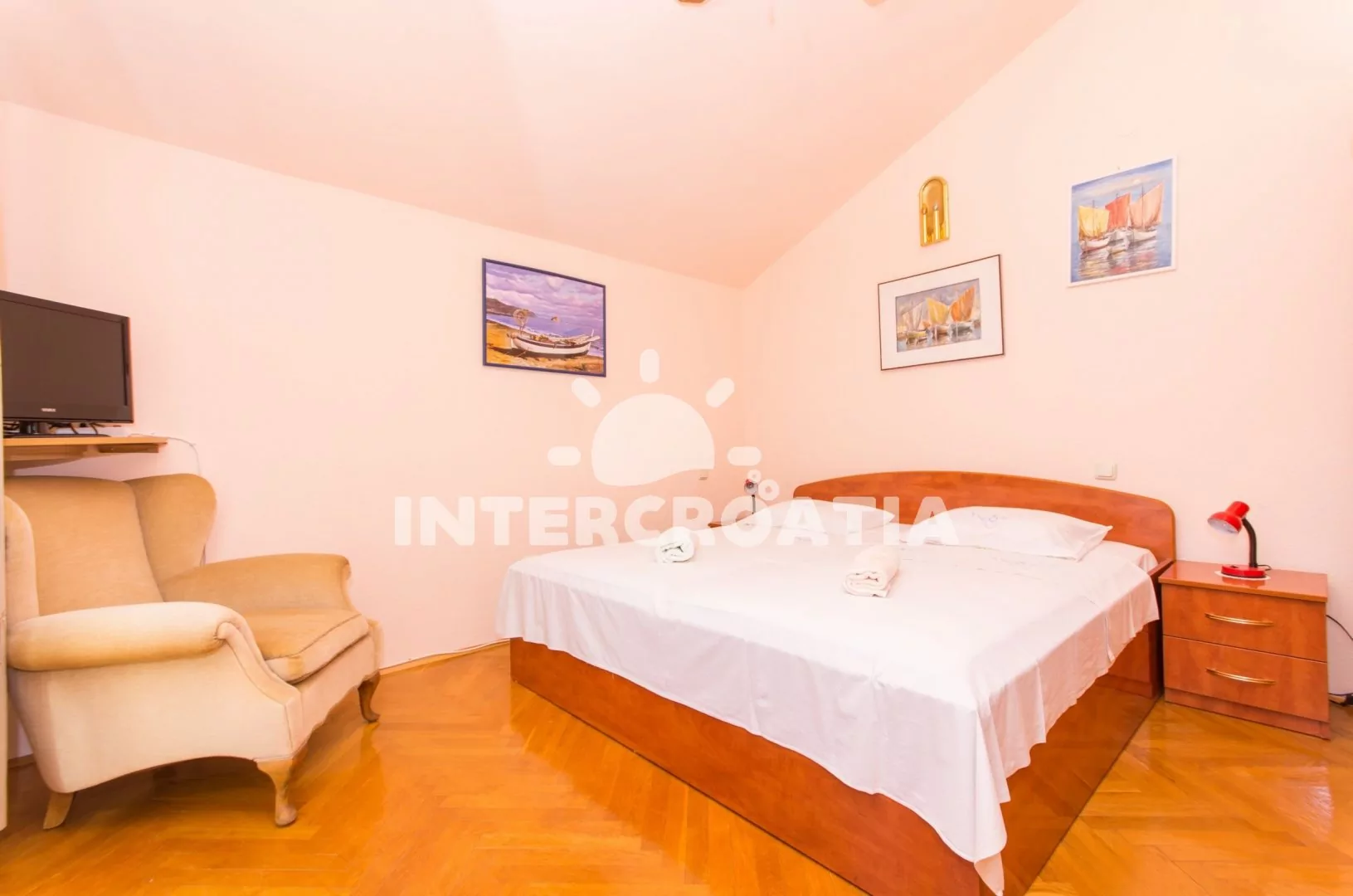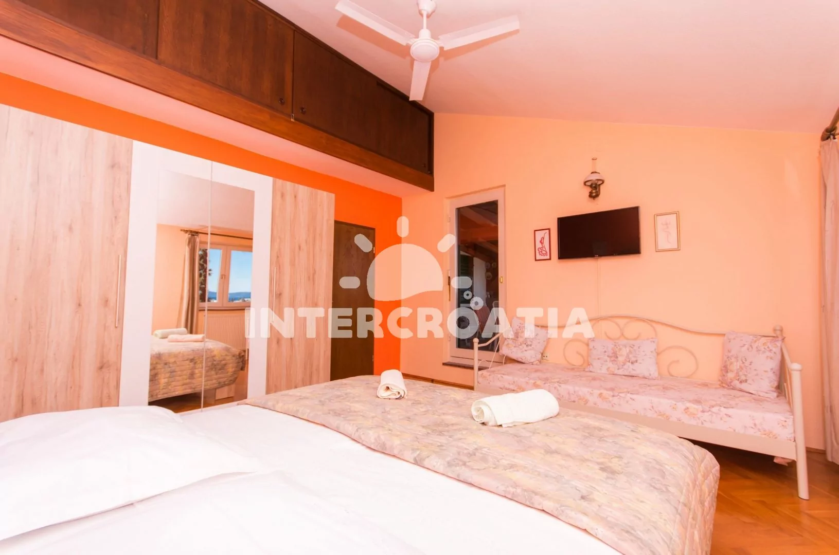 Prostorný a pohodlně zařízený čtyřpokojový apartmán se třemi ložnicemi a terasou s posezením, nacházející se v 1. patře domu. Vstup, kuchyně spojená s jídelnou. Kuchyňská linka se sklokeramickou varnou deskou, mikrovlnnou troubou, lednicí s mrazákem, kávovarem, rychlovarnou konvicí, toustovačem, nádobím a myčkou na nádobí. První ložnice s dvoulůžkem, pohovkou a LCD televizí. Druhá ložnice s dvoulůžkem. Třetí ložnice s extra lůžkem pro 2 osoby a LCD televizí. Tři koupelny, každá se sprchovým koutem, umyvadlem a wc. Hosté mají k dispozici terasu s posezením, krásným výhledem na moře a v zahradě gril. Parkování u objektu.
