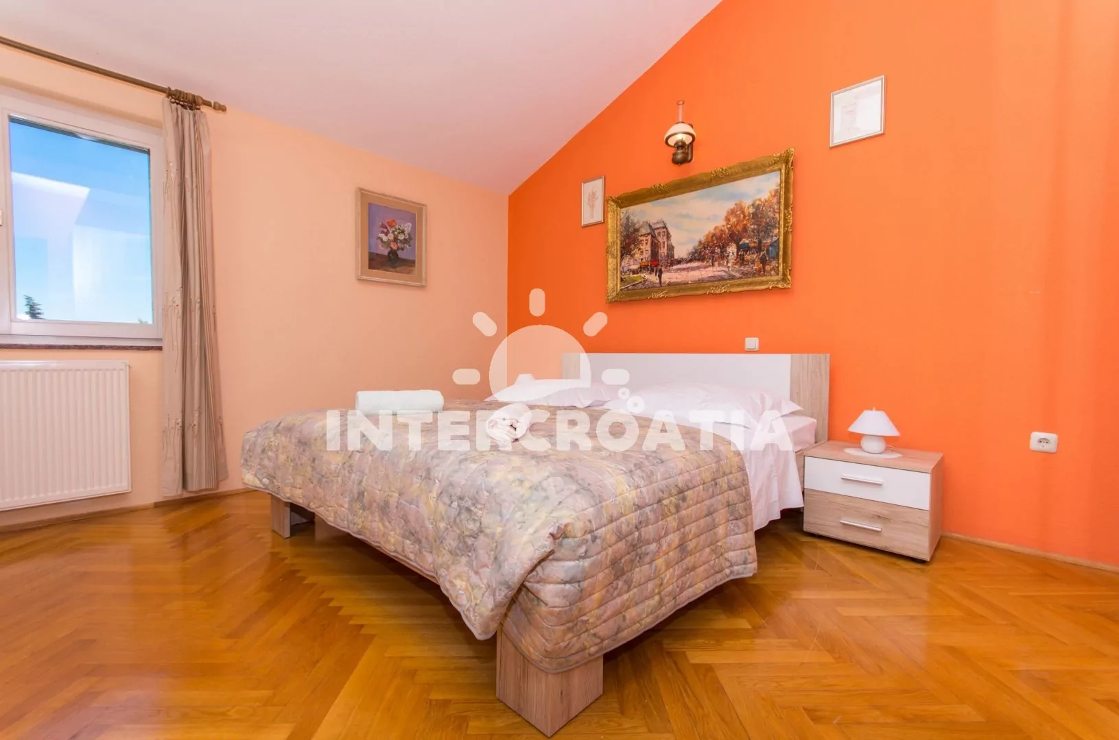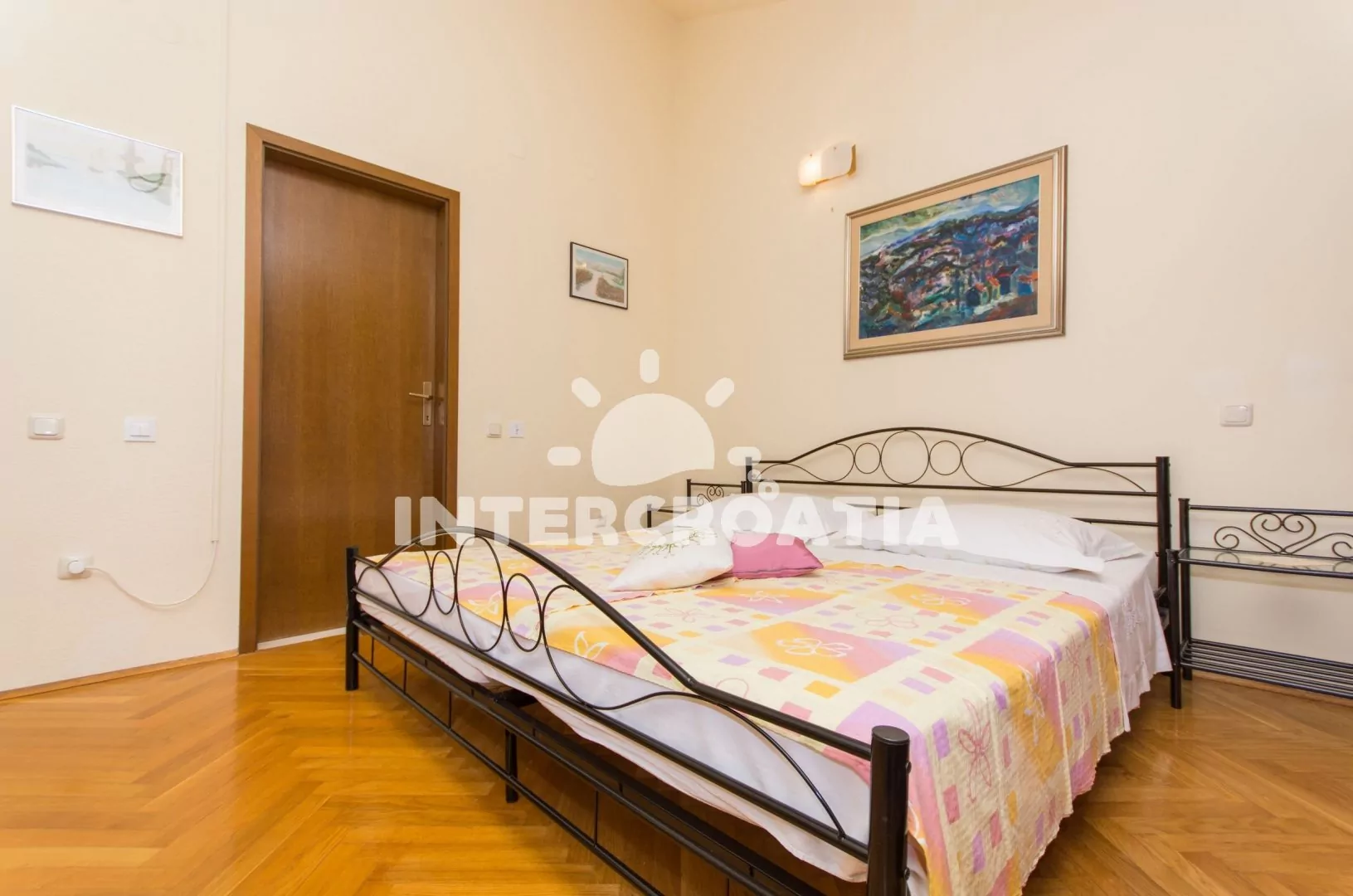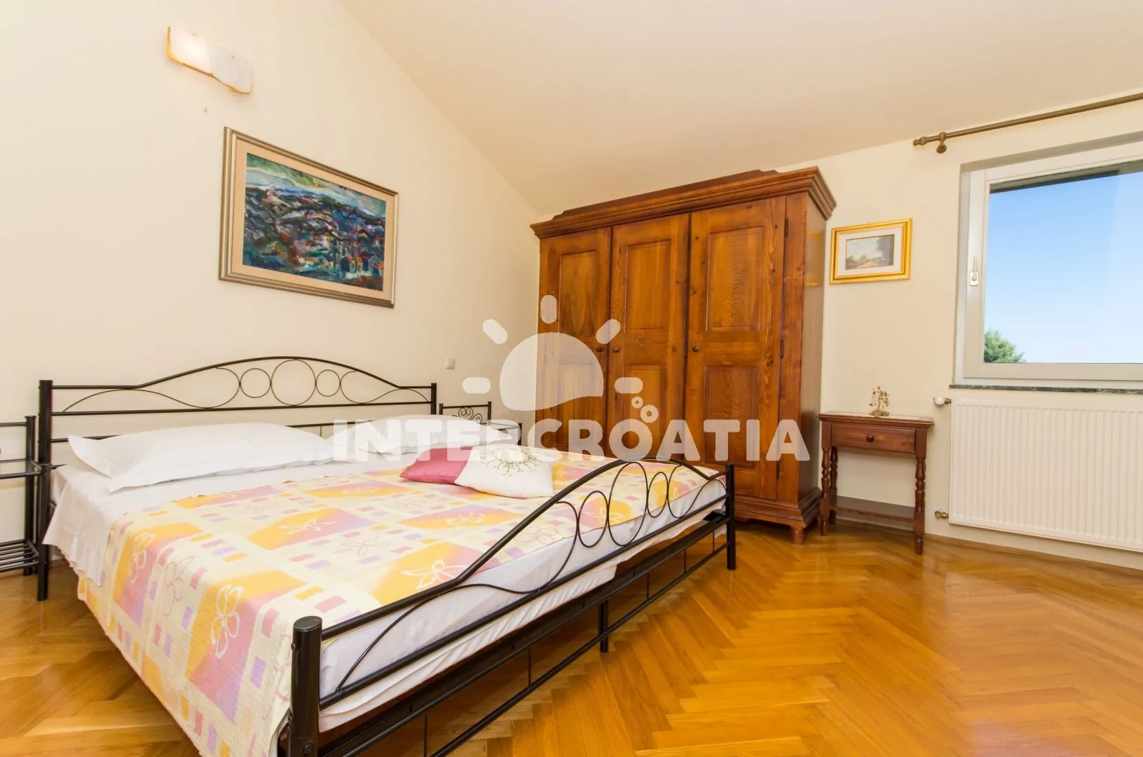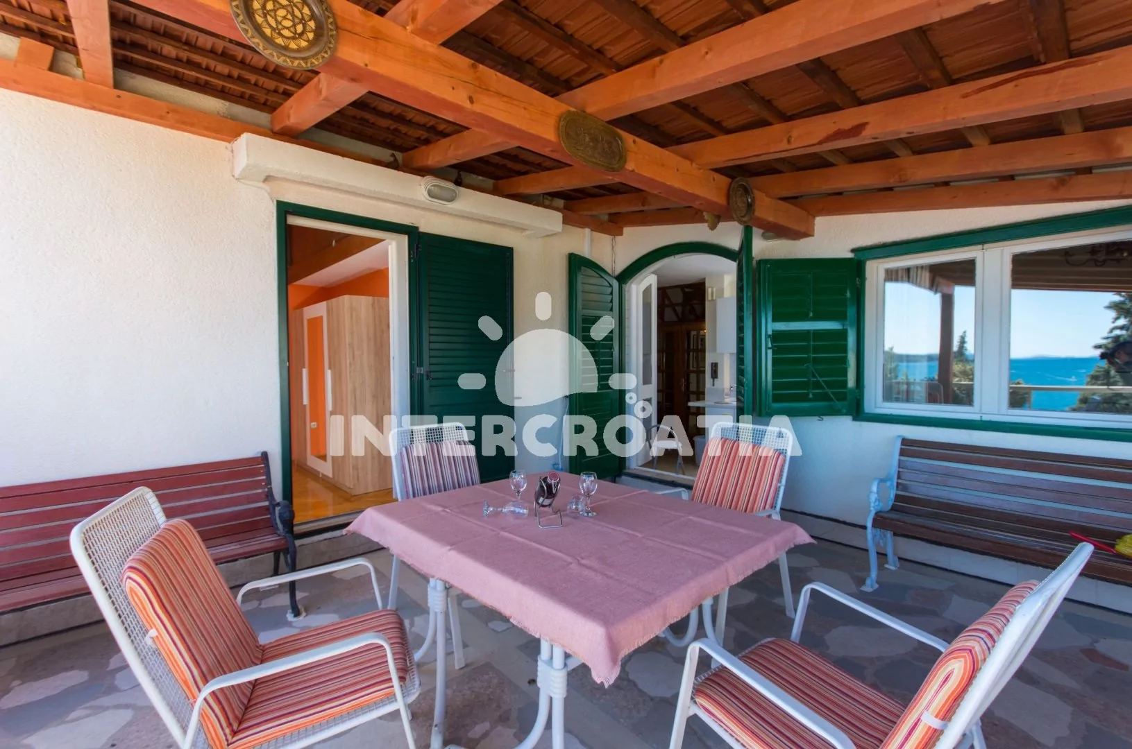 Prostorný a pohodlně zařízený čtyřpokojový apartmán se třemi ložnicemi a terasou s posezením, nacházející se v 1. patře domu. Vstup, kuchyně spojená s jídelnou. Kuchyňská linka se sklokeramickou varnou deskou, mikrovlnnou troubou, lednicí s mrazákem, kávovarem, rychlovarnou konvicí, toustovačem, nádobím a myčkou na nádobí. První ložnice s dvoulůžkem, pohovkou a LCD televizí. Druhá ložnice s dvoulůžkem. Třetí ložnice s extra lůžkem pro 2 osoby a LCD televizí. Tři koupelny, každá se sprchovým koutem, umyvadlem a wc. Hosté mají k dispozici terasu s posezením, krásným výhledem na moře a v zahradě gril. Parkování u objektu.