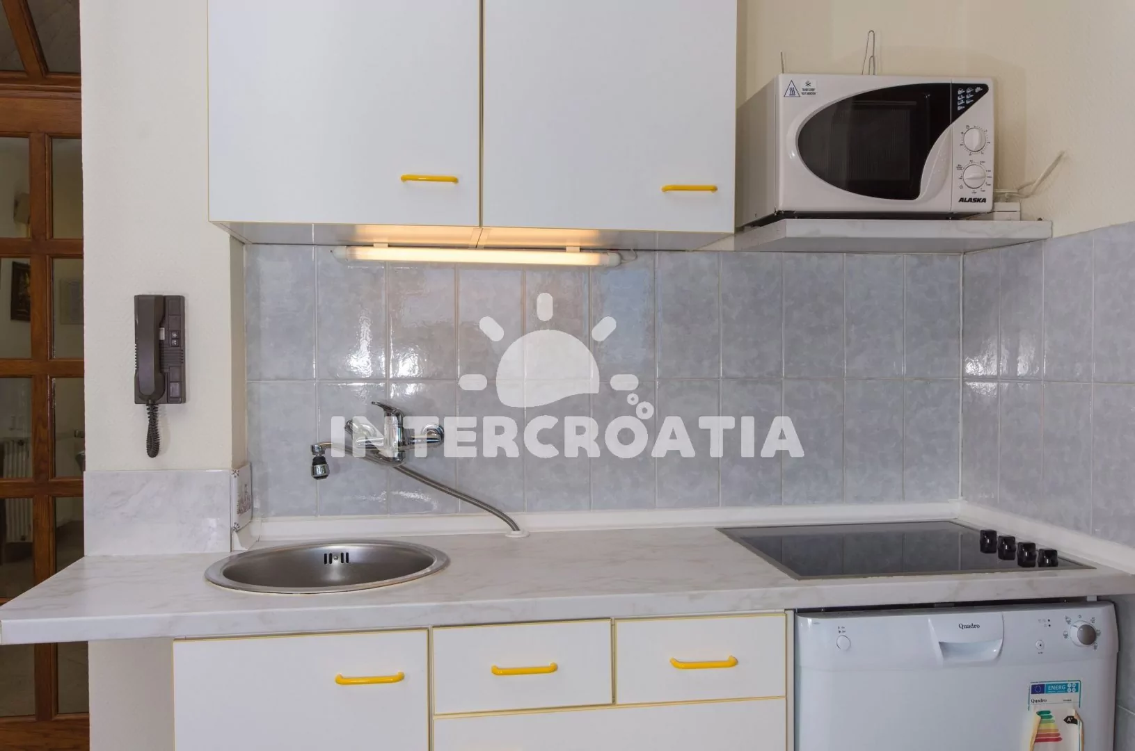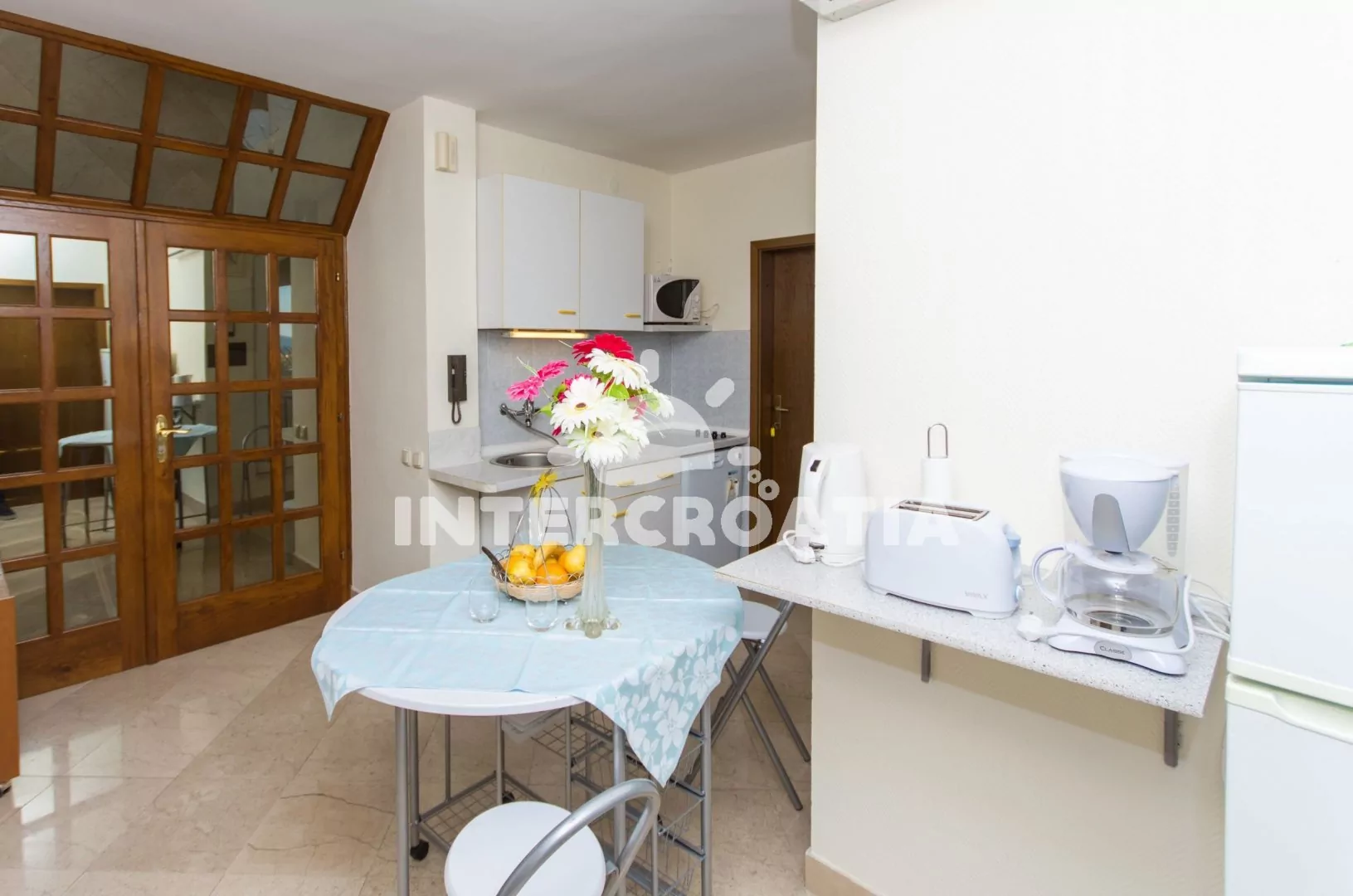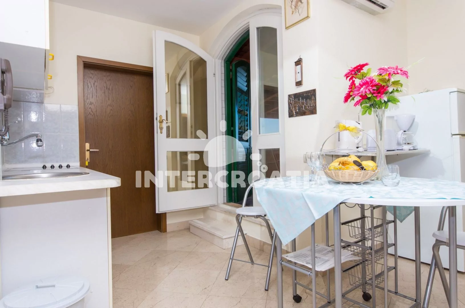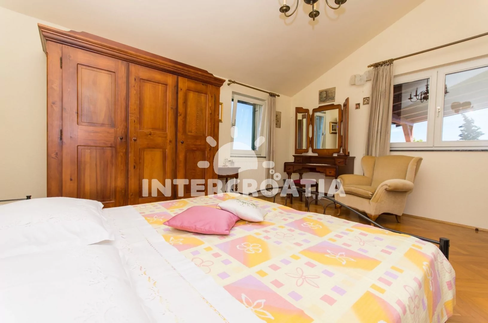Prostorný a pohodlně zařízený čtyřpokojový apartmán se třemi ložnicemi a terasou s posezením, nacházející se v 1. patře domu. Vstup, kuchyně spojená s jídelnou. Kuchyňská linka se sklokeramickou varnou deskou, mikrovlnnou troubou, lednicí s mrazákem, kávovarem, rychlovarnou konvicí, toustovačem, nádobím a myčkou na nádobí. První ložnice s dvoulůžkem, pohovkou a LCD televizí. Druhá ložnice s dvoulůžkem. Třetí ložnice s extra lůžkem pro 2 osoby a LCD televizí. Tři koupelny, každá se sprchovým koutem, umyvadlem a wc. Hosté mají k dispozici terasu s posezením, krásným výhledem na moře a v zahradě gril. Parkování u objektu.