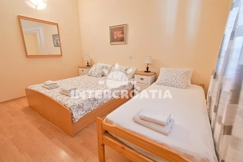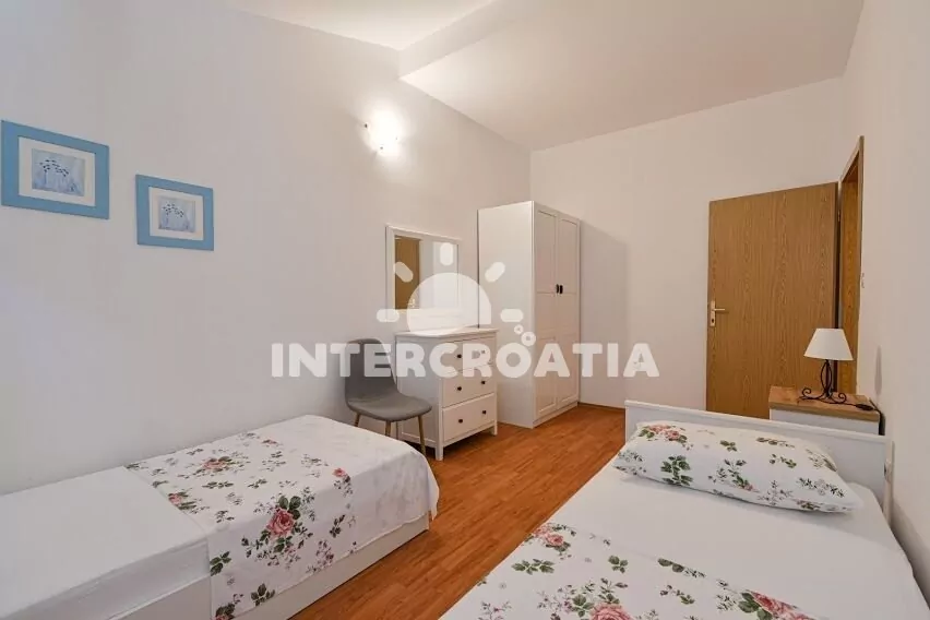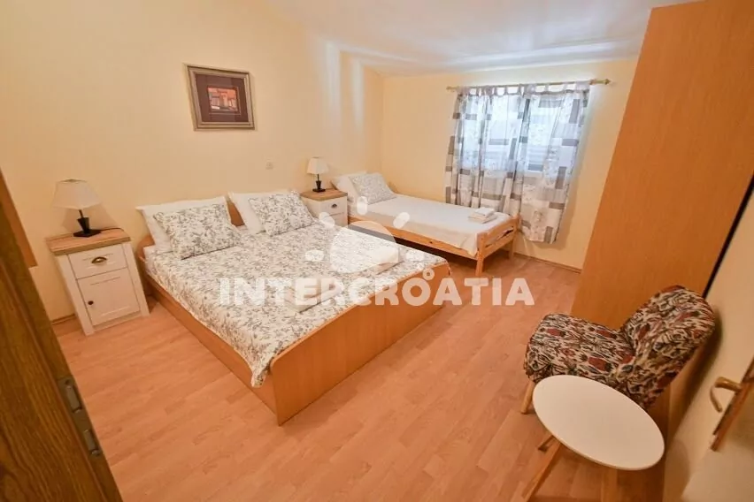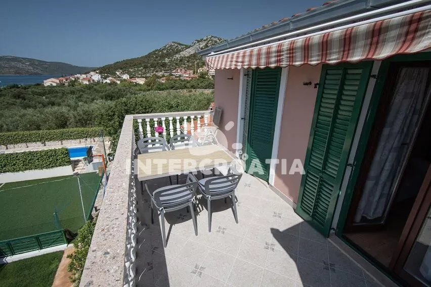 Apartmán pro 4 až 5 osob, s balkonem, venkovním posezením a výhledem na moře je umístěný v druhém patře. Obývací pokoj je spojený s kuchyní. Kuchyňská linka se sporákem, rychlovarnou konvicí, mikrovlnnou troubou, kávovarem, toustovačem, nádobím a lednicí s mrazákem. Obývací pokoj s jídelním stolem pro 3 osoby, pohovkou, televizí se satelitním programem a klimatizací. První ložnice s jedním dvoulůžkem a jedním jednolůžkem. Druhá ložnice s dvěma jednolůžky. Koupelna se sprchovým koutem, umyvadlem a wc. Hostům je k dispozici zahradní domek s grilem a posezením na zahradě.