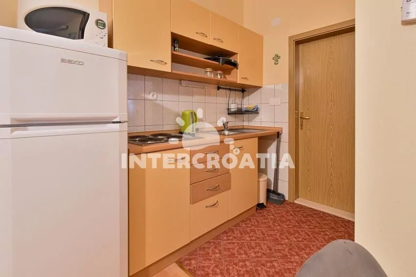 Apartmán pro 4 až 5 osob, s balkonem, venkovním posezením a výhledem na moře je umístěný v druhém patře. Obývací pokoj je spojený s kuchyní. Kuchyňská linka se sporákem, rychlovarnou konvicí,…