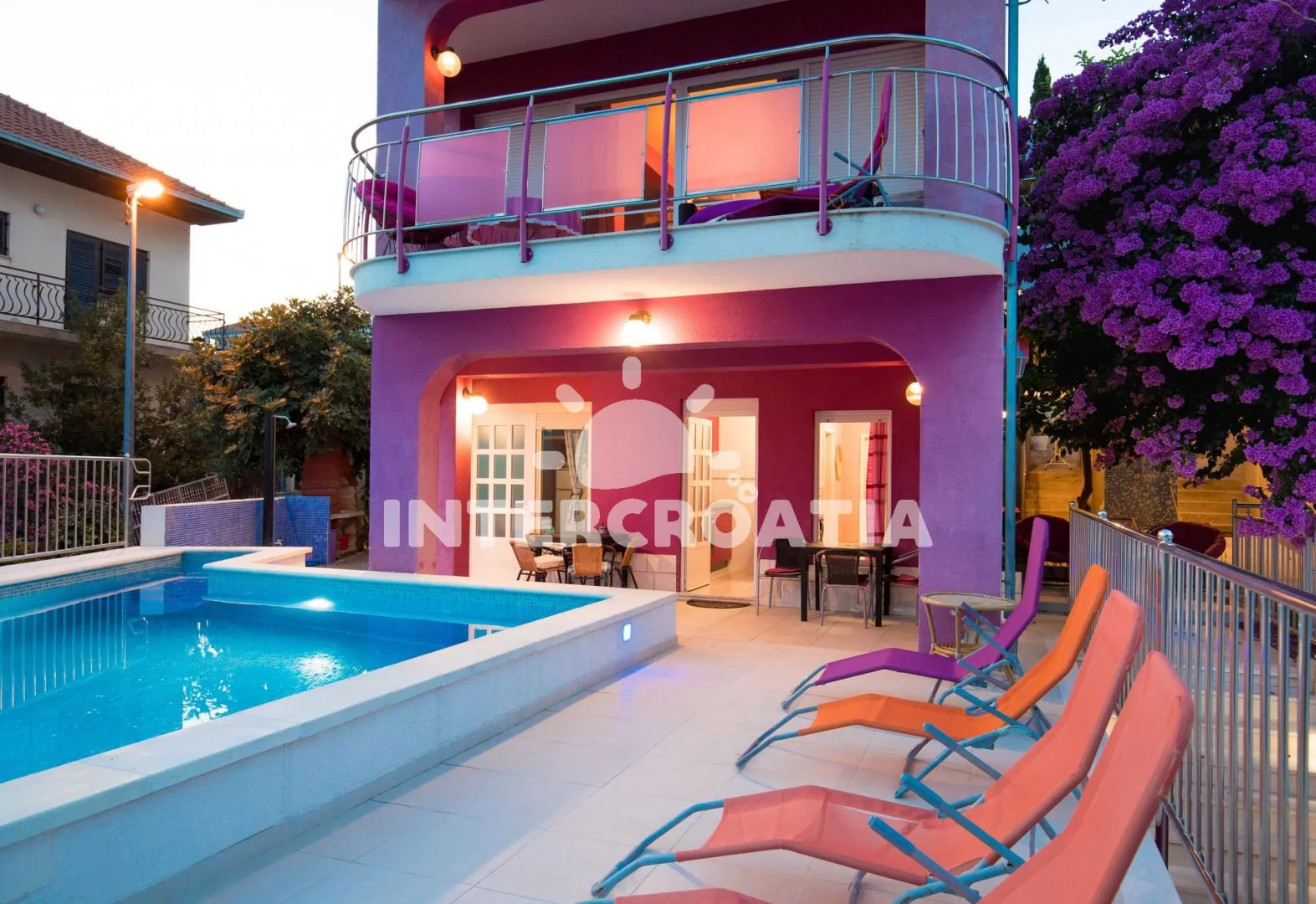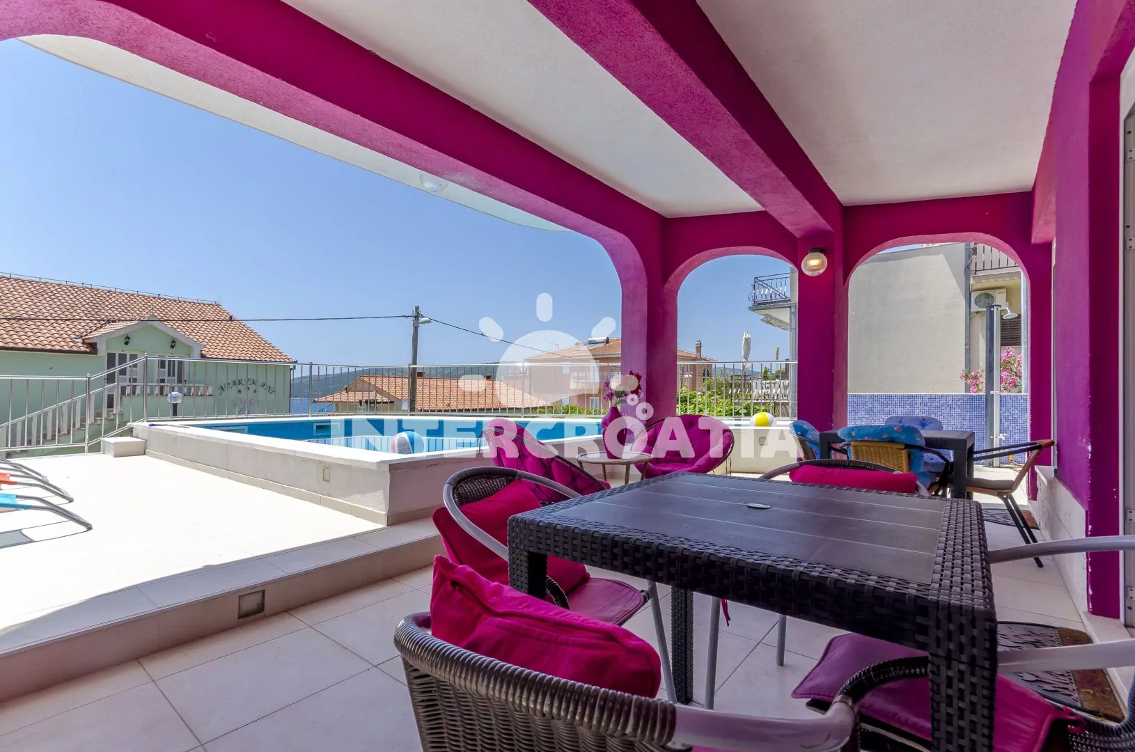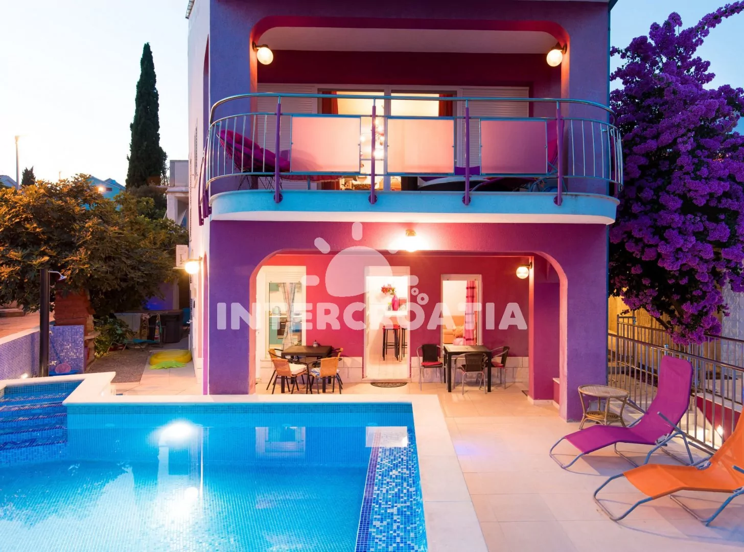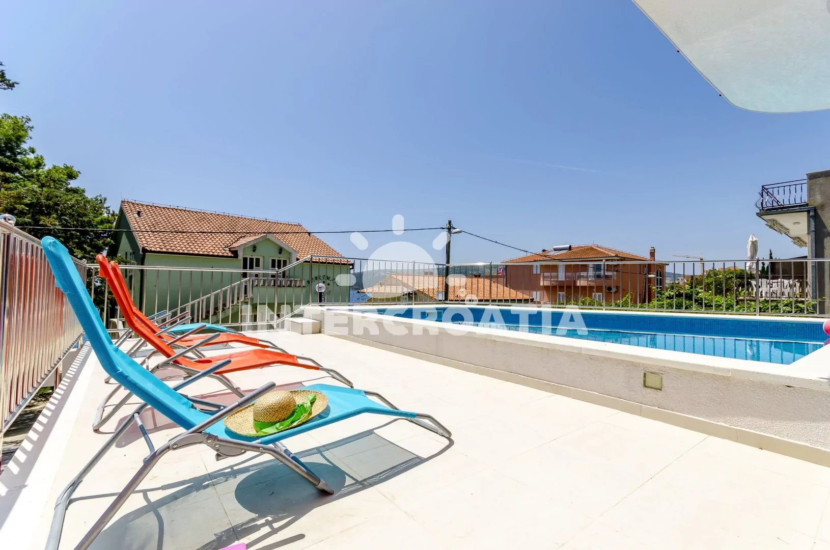 Luxusní apartmánová vila se zapuštěným bazénem, vířivkou, terasou s posezením a polohou téměř u moře.