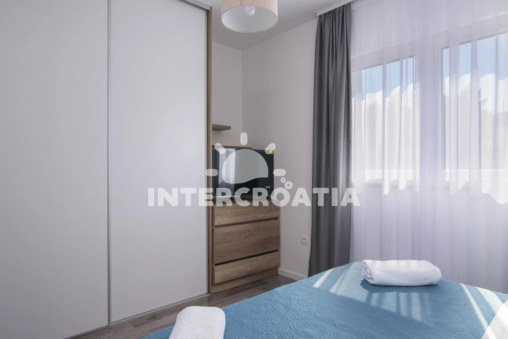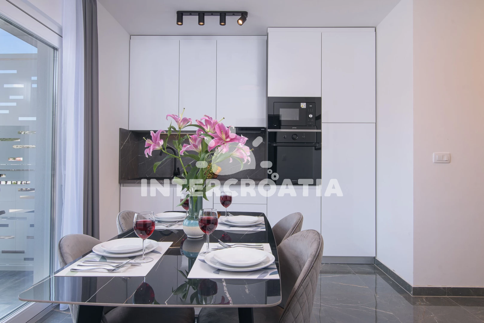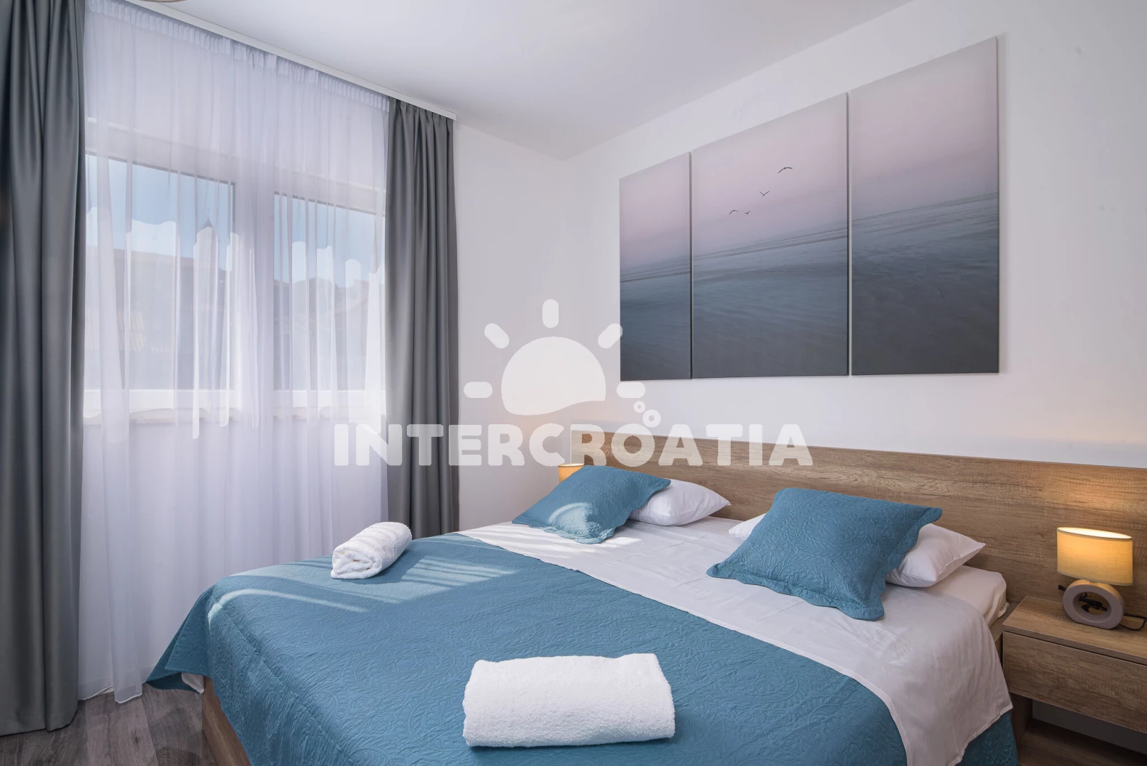 Apartmán (50 m2) s terasou, posezením a výhledem na moře se nachází ve 3. patře vily. Apartmán má 1 ložnici a je vhodný pro až 3 osoby. Obývací pokoj je spojený s kuchyní. Kuchyňská linka je vybavena varnou deskou, digestoří, vestavěnou troubou, myčkou na nádobí, mikrovlnnou troubou, rychlovarnou konvicí, kávovarem, toustovačem, nádobím a lednicí s mrazákem. Obývací pokoj s jídelním stolem, pohovkou (rozložitelná na extra lůžko pro 1 osobu), televizí se satelitním programem, klimatizací a vstupem na terasu. Ložnice s dvoulůžkem, sejfem a televizí. Koupelna se sprchovým koutem, umyvadlem, fénem a wc. Hostům je k dispozici parkování u objektu zdarma.