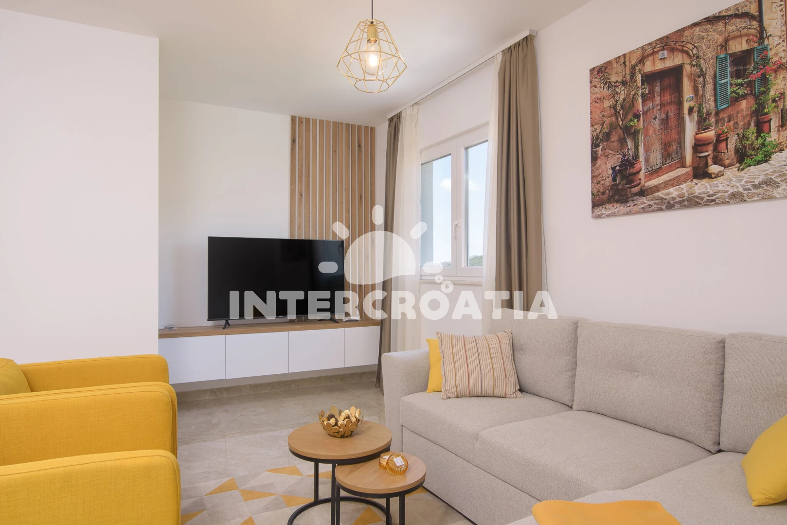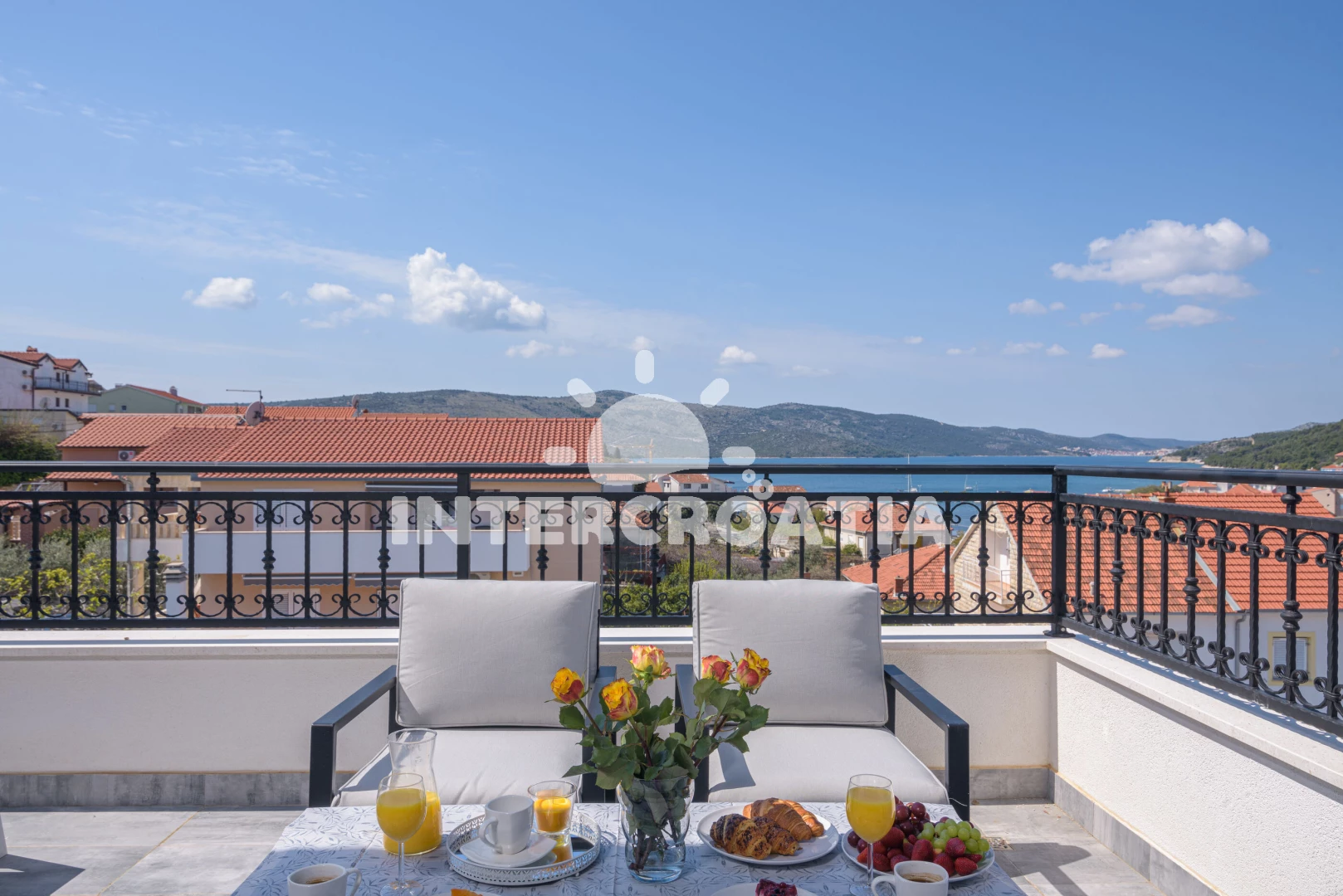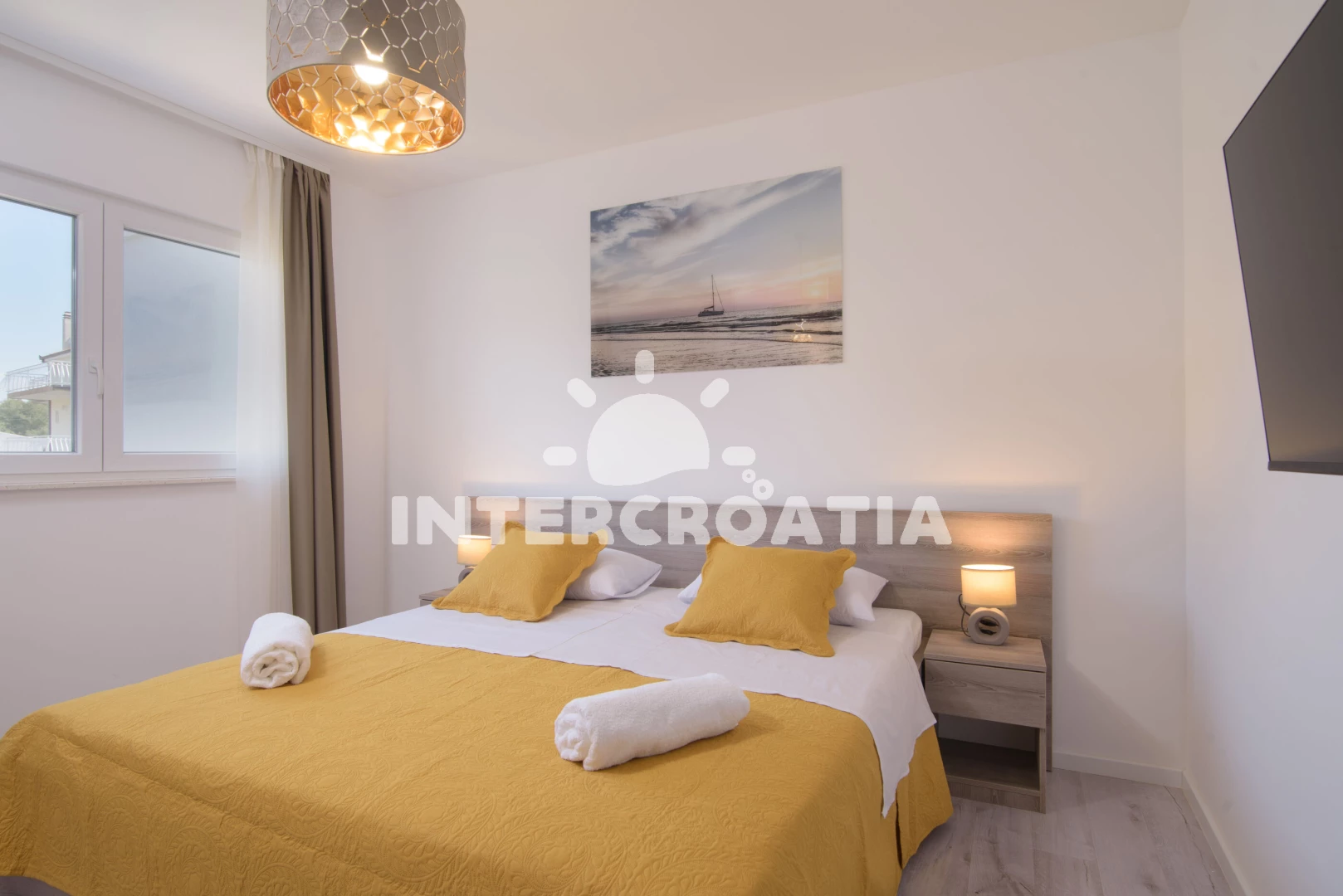 Apartmán (50 m2) s terasou, posezením a výhledem na moře se nachází ve 3. patře vily. Apartmán má 1 ložnici a je vhodný pro až 3 osoby. Obývací pokoj je spojený s kuchyní. Kuchyňská linka je vybavena varnou deskou, digestoří, vestavěnou troubou, myčkou na nádobí, mikrovlnnou troubou, rychlovarnou konvicí, kávovarem, toustovačem, nádobím a lednicí s mrazákem. Obývací pokoj s jídelním stolem, pohovkou (rozložitelná na extra lůžko pro 1 osobu), televizí se satelitním programem, klimatizací a vstupem na terasu. Ložnice s dvoulůžkem, sejfem a televizí. Koupelna se sprchovým koutem, umyvadlem, fénem a wc. Hostům je k dispozici parkování u objektu zdarma.