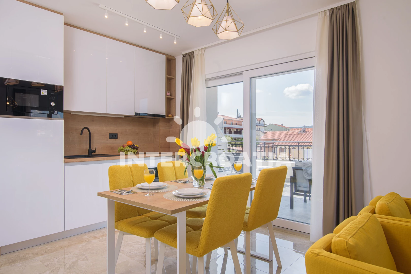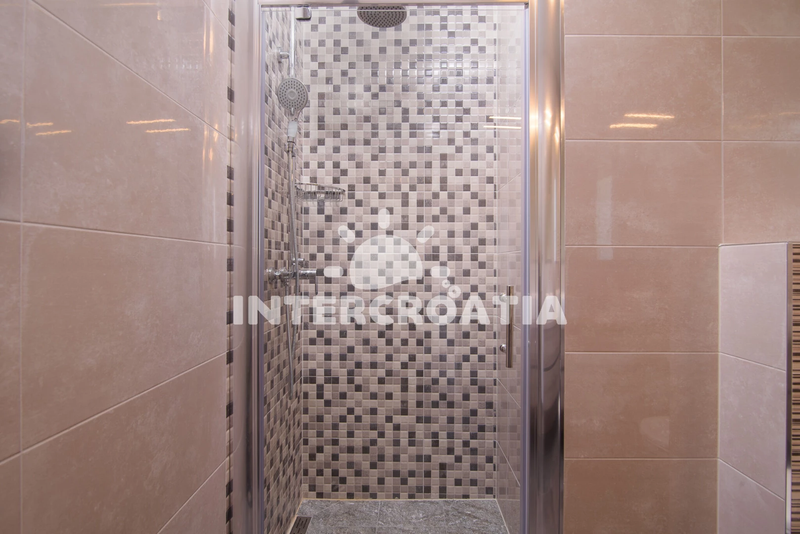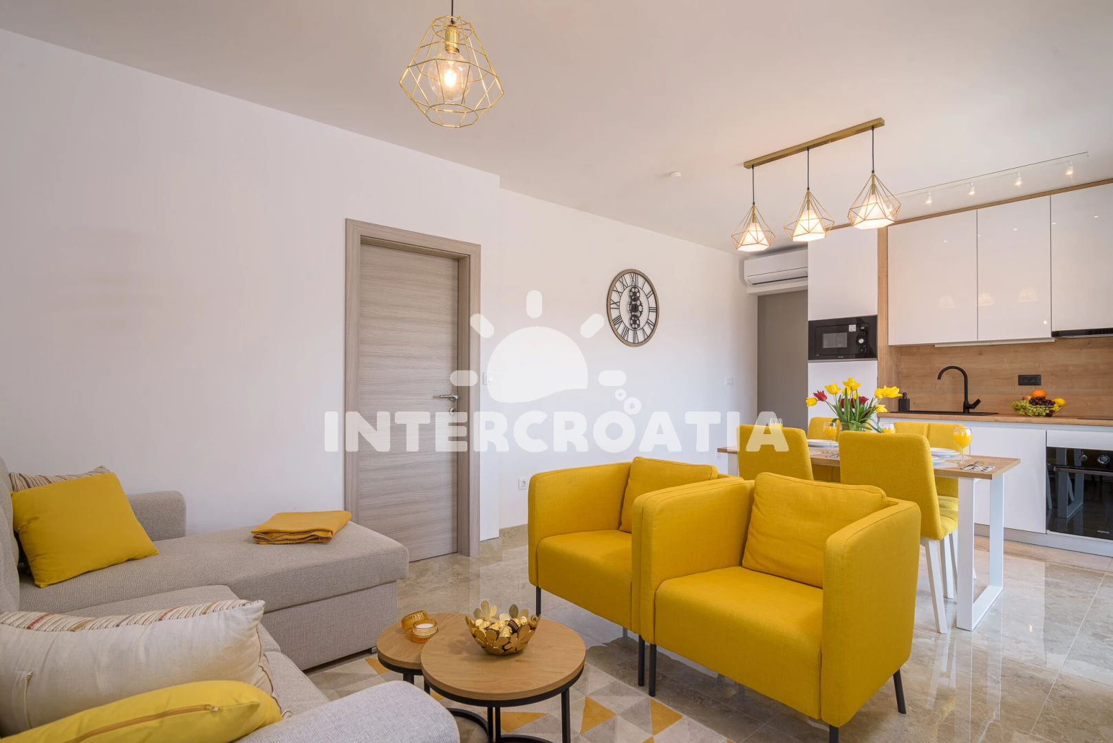 Apartmán (50 m2) s terasou, posezením a výhledem na moře se nachází ve 3. patře vily. Apartmán má 1 ložnici a je vhodný pro až 3 osoby. Obývací pokoj je spojený s kuchyní. Kuchyňská linka je vybavena varnou deskou, digestoří, vestavěnou troubou, myčkou na nádobí, mikrovlnnou troubou, rychlovarnou konvicí, kávovarem, toustovačem, nádobím a lednicí s mrazákem. Obývací pokoj s jídelním stolem, pohovkou (rozložitelná na extra lůžko pro 1 osobu), televizí se satelitním programem, klimatizací a vstupem na terasu. Ložnice s dvoulůžkem, sejfem a televizí. Koupelna se sprchovým koutem, umyvadlem, fénem a wc. Hostům je k dispozici parkování u objektu zdarma.