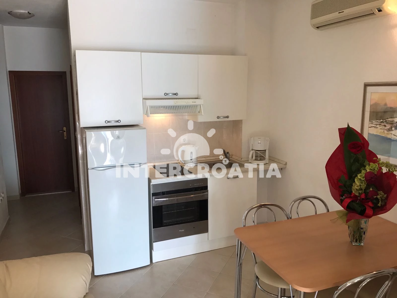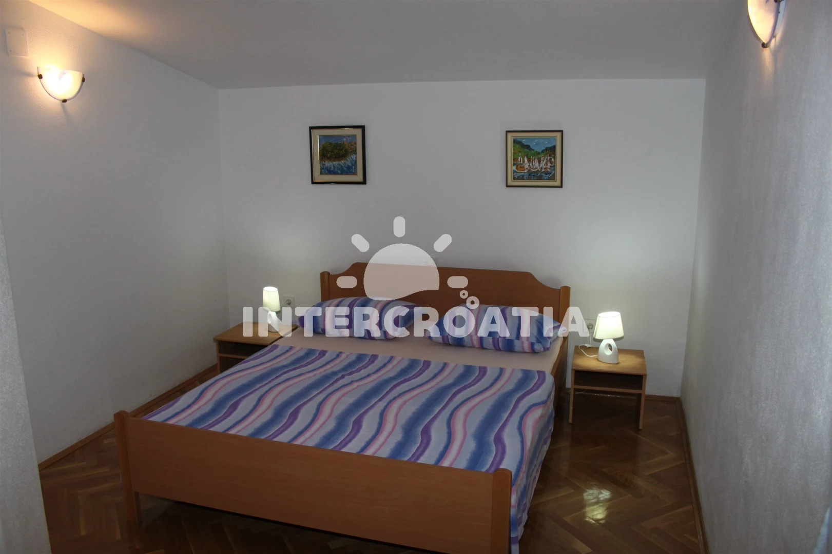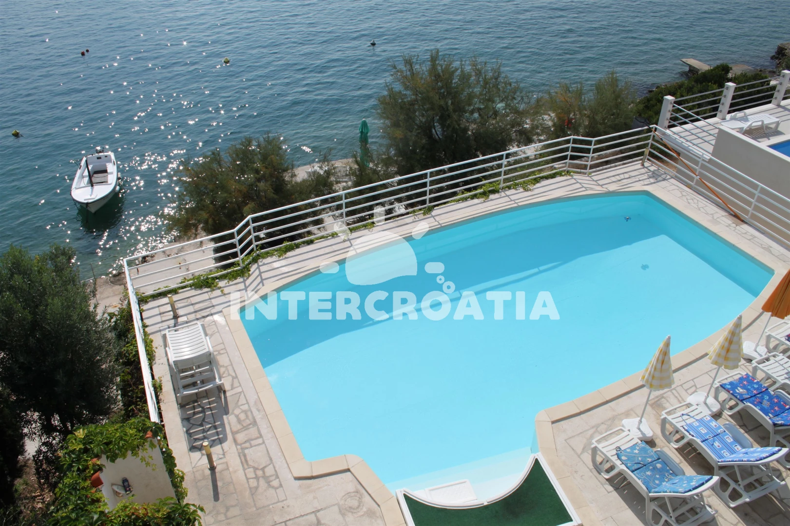 Apartmán se nachází 10 m od moře a pláže. Pláž je betonové desky. Apartmán disponuje bazénem s lehátky pro ubytované hosty. Parkování je před domem.