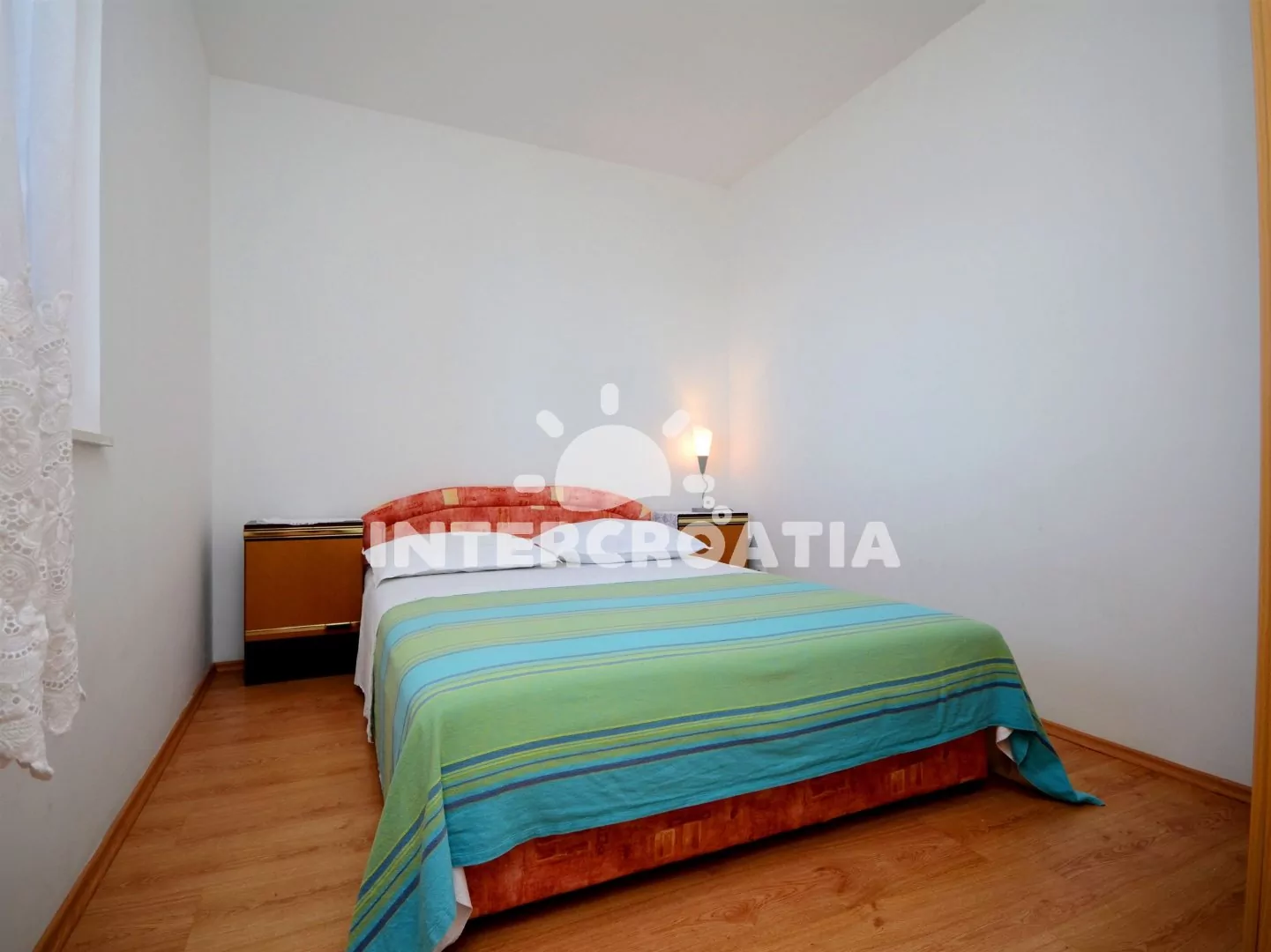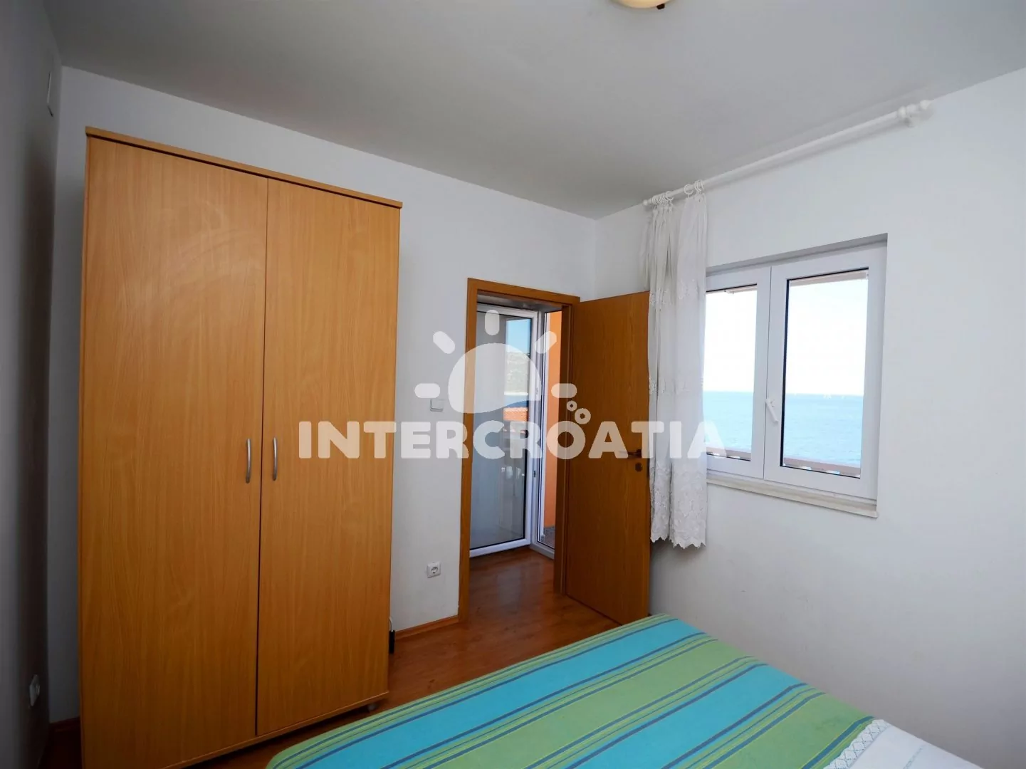 Apartmán s výhledem na moře a balkonem s posezením se nachází v prvním patře a je vhodný pro 4 osoby. Obývací místnost je spojena s kuchyní. Kuchyňská linka je vybavena dvouplotýnkovým sporákem, rychlovarnou konvicí, nádobím a lednicí s mrazákem. Obývací místnost s jídelním stolem pro 4 osoby, televizí se satelitním programem, klimatizací a vstupem na balkon. První i druhá ložnice je vybavena vždy s jedním dvoulůžkem. Koupelna se sprchovým koutem, umyvadlem, fénem a wc. Hostům je k dispozici parkování u objektu zdarma.