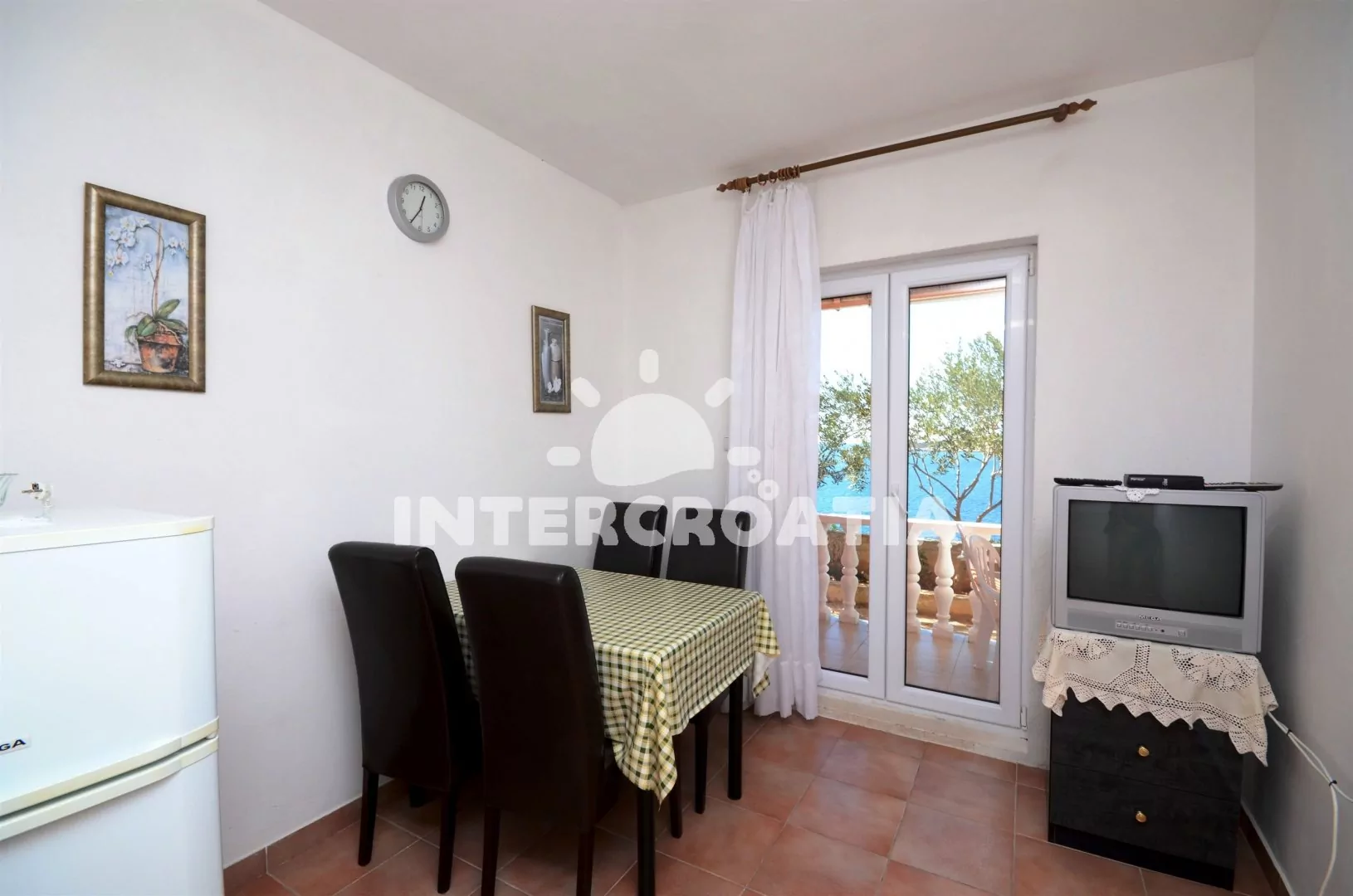 Apartmán s výhledem na moře a balkonem s posezením se nachází v přízemí a je vhodný pro 4 osoby. Obývací místnost je spojena s kuchyní. Kuchyňská linka je vybavena dvouplotýnkovým sporákem, rychlovarnou konvicí, nádobím a lednicí s mrazákem. Obývací místnost s jídelním stolem pro 4 osoby, televizí se satelitním programem, klimatizací a vstupem na balkon. První ložnice je vybavena jedním dvoulůžkem. Druhá ložnice s dvěma jednolůžky. Koupelna se sprchovým koutem, umyvadlem, fénem a wc. Hostům je k dispozici parkování u objektu zdarma.