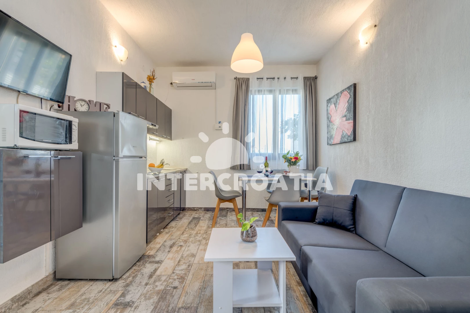 Apartmán (35 m2) s terasou. Nachází se v přízemí objektu. Apartmán má 1 ložnici a je vhodný pro až 4 osoby. Kuchyňská linka je vybavena varnou deskou, troubou, mikrovlnnou troubou, rychlovarnou konvicí, nádobím, lednicí, mrazákem. V obývací místnosti je rozložitelná pohovka (extra lůžko pro 2 osoby). K dispozici televize se satelitním programem, žehlička. Ložnice s dvoulůžkem. Koupelna se sprchovým koutem, umyvadlem, fénem a WC.