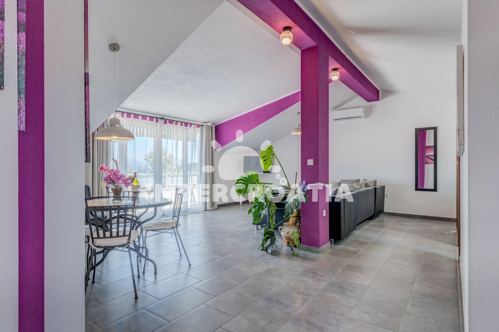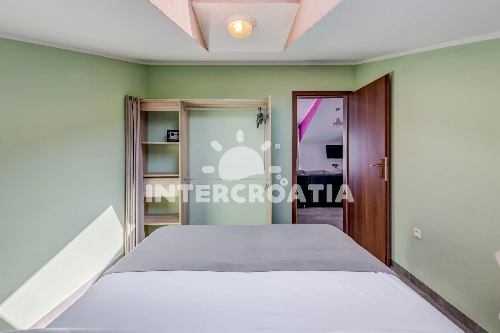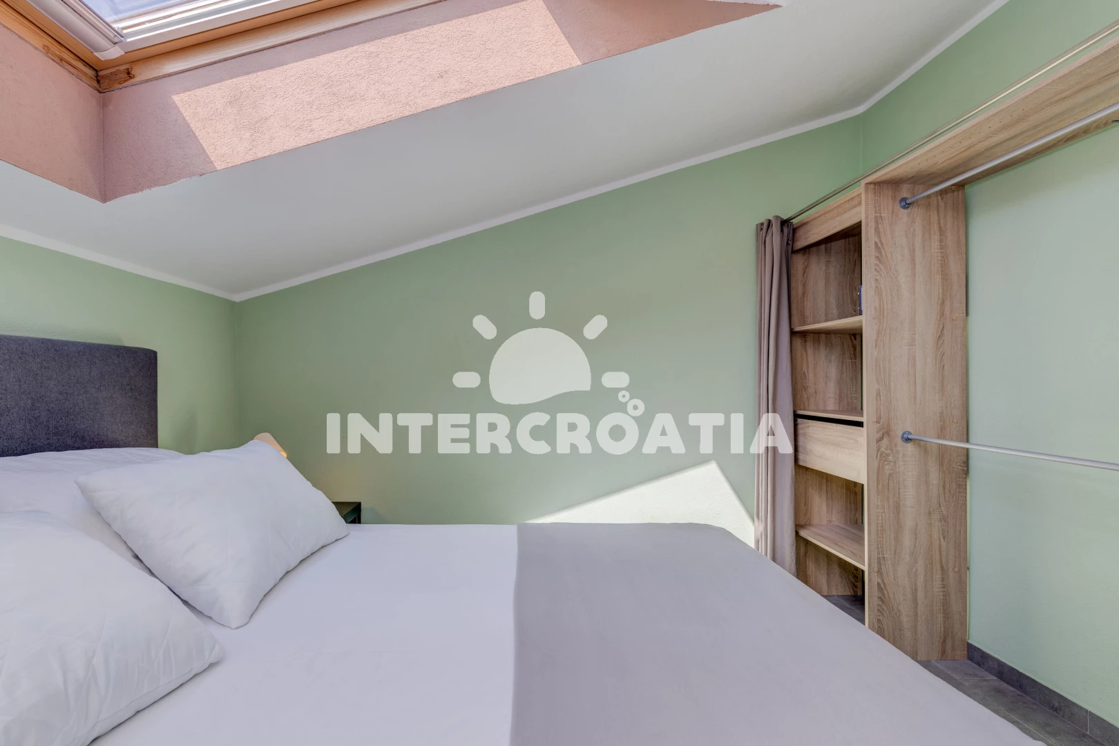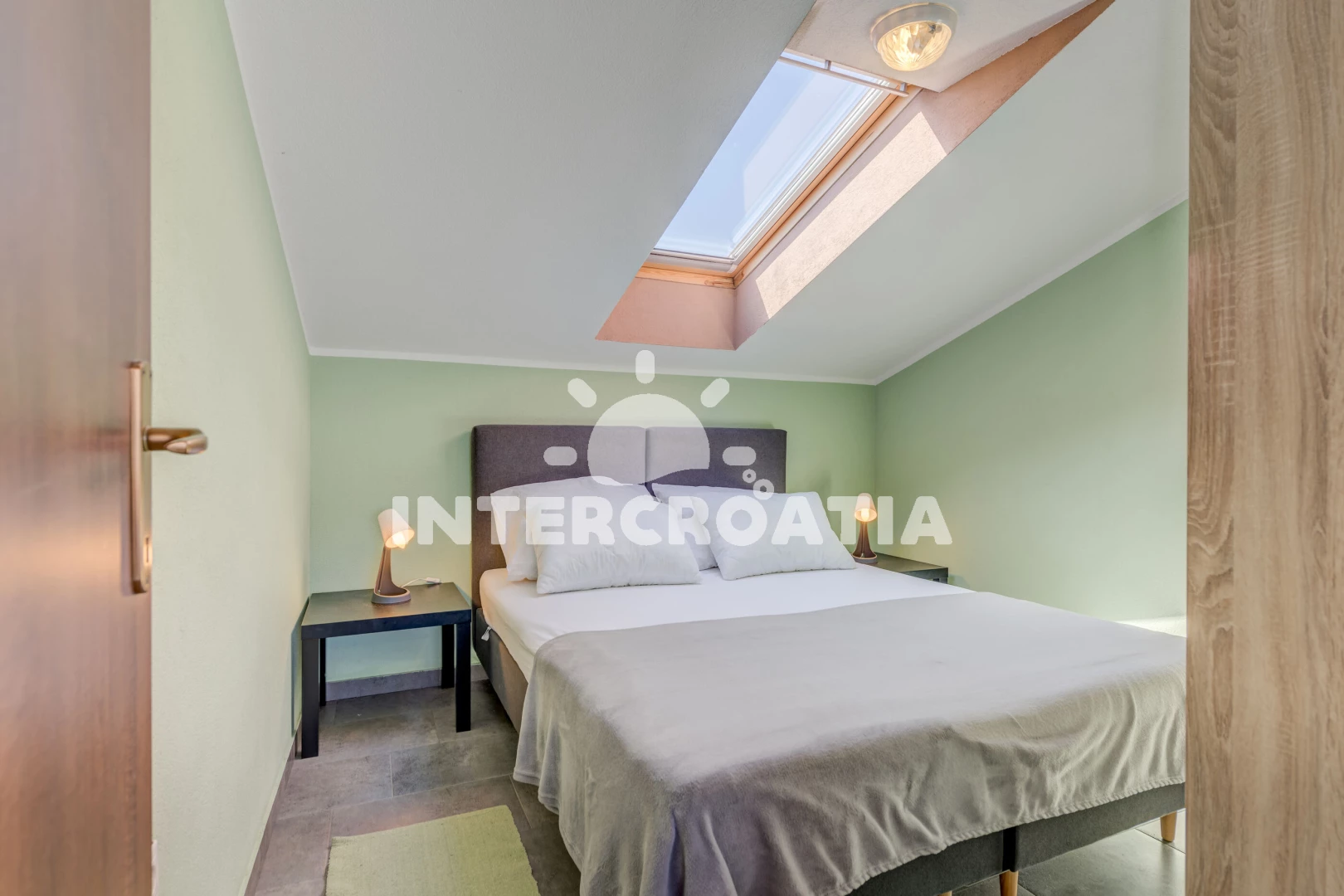 Apartmán (77 m2) s balkonem, a výhledem na moře. Nachází se ve 2. patře objektu. Apartmán má 1 ložnici a je vhodný pro až 4 osoby. Kuchyňská linka je vybavena varnou deskou, troubou, mikrovlnnou troubou, rychlovarnou konvicí, nádobím, lednicí, mrazákem. V obývací místnosti je rozložitelná pohovka (extra lůžko pro 2 osoby). K dispozici televize se satelitním programem, žehlička. Ložnice s dvoulůžkem. Koupelna s vanou, umyvadlem, fénem a WC.