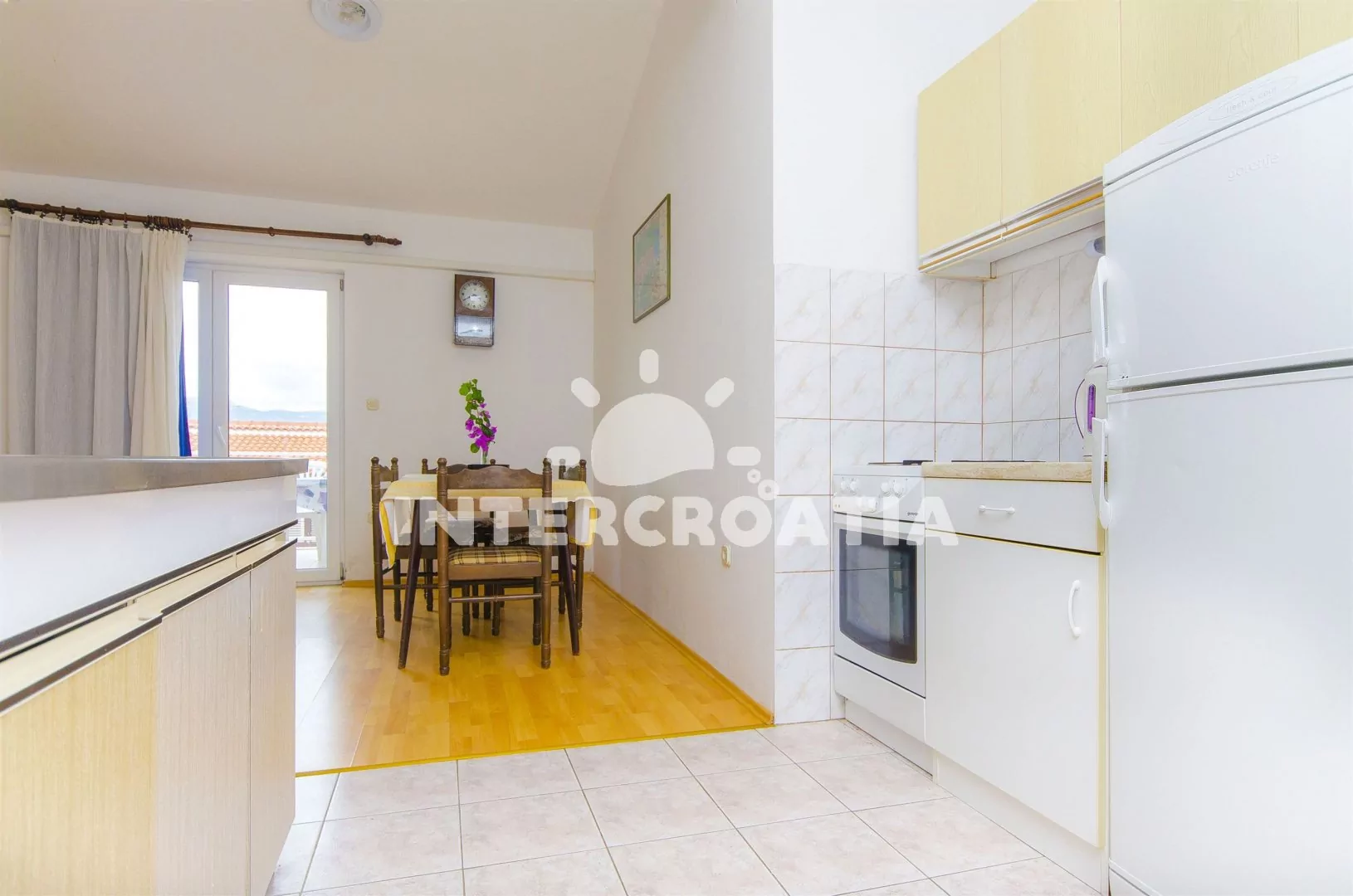 Světlý apartmán se třemi pokoji a terasou, posezením a výhledem na moře, nacházející se v 1. patře domu. Vstup, obývací pokoj spojený s kuchyní. Kuchyňská linka se sporákem, troubou, lednicí s…