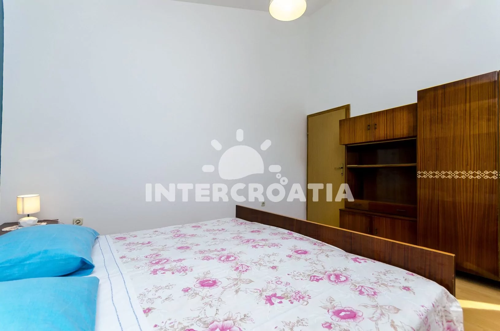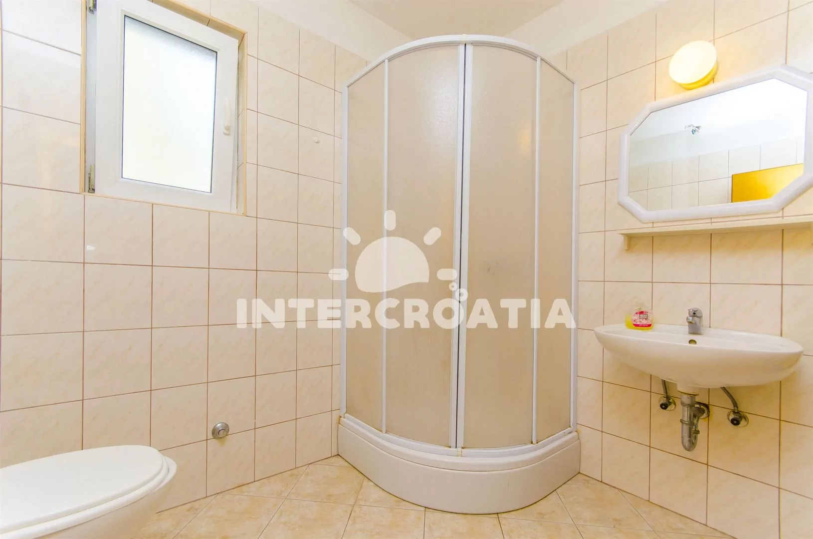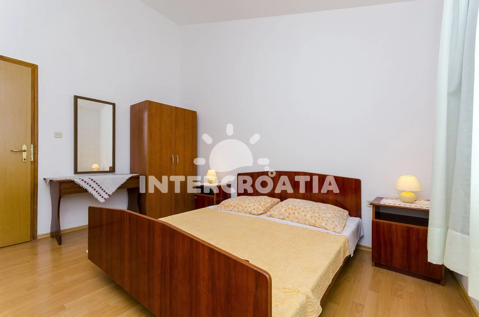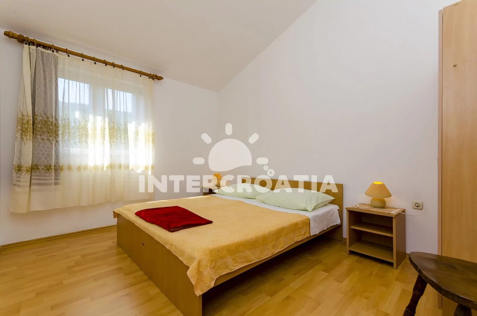 Světlý apartmán se třemi pokoji a terasou, posezením a výhledem na moře, nacházející se v 1. patře domu. Vstup, obývací pokoj spojený s kuchyní. Kuchyňská linka se sporákem, troubou, lednicí s mrazákem, kávovarem, rychlovarnou konvicí a nádobím. V obývacím pokoji jídelní stůl pro 4 osoby, pohovka a LCD televize se satelitem. Dvě ložnice, každá s dvoulůžkem. Koupelna se sprchovým koutem, umyvadlem a wc. Hosté mají k dispozici terasu s posezením a v zahradě společný gril. Parkování u objektu.