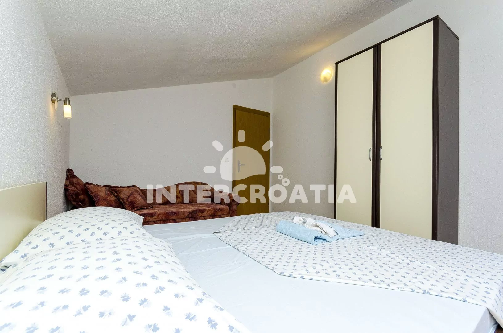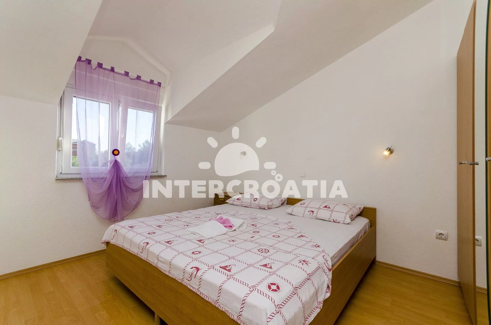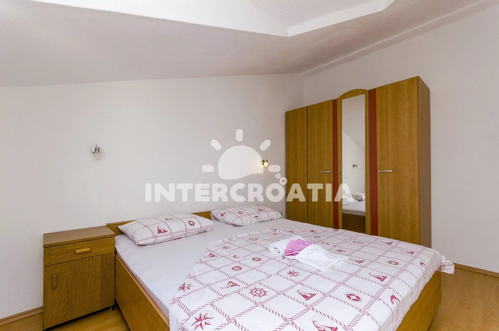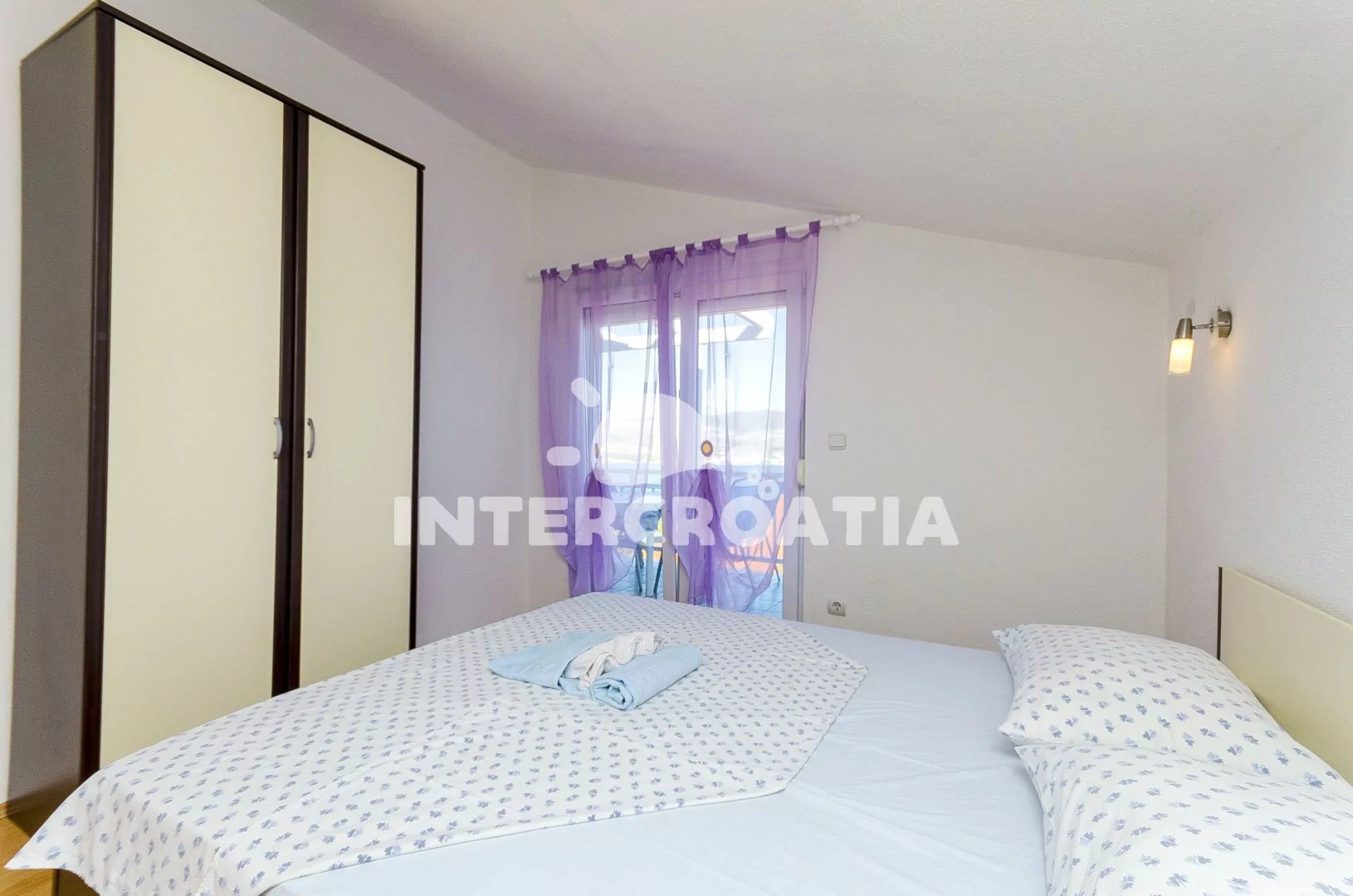Podkrovní apartmán (60 m2) s terasou, posezením a výhledem na moře. Apartmán má 2 ložnice a je vhodný pro 4 až 5 osob. Obývací místnost je spojena s kuchyní. Kuchyňská linka je vybavena sporákem s troubou, mikrovlnnou troubou, rychlovarnou konvicí, kávovarem, nádobím a lednicí s mrazákem. Obývací místnost s jídelním stolem, televizí se satelitním programem, klimatizací a vstupem na terasu. První ložnice s dvoulůžkem. Druhá ložnice s dvoulůžkem, přistýlkou a vstupem na terasu. Koupelna se sprchovým koutem, umyvadlem a wc. Hostům je k dispozici parkování u objektu zdarma.