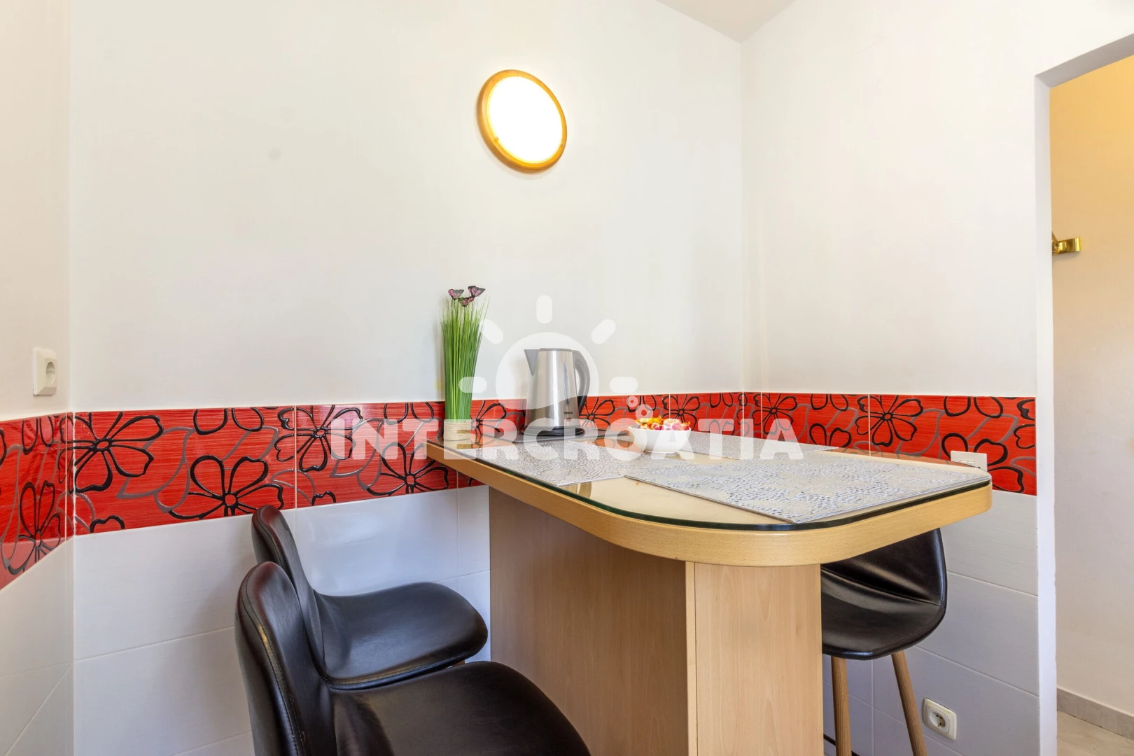 Vzdálenosti: Moře 100 m, pláž 900 m (písčitá a betonové desky), centrum 20 m, bar 20 m, restaurace 20 m, supermarket 80 m, veřejná doprava 200 m, lékárna 200 m, směnárna 400 m, banka 400 m, trajekt (Split) 500 m, ambulance 500 m, pošta 500 m, čerpací stanice 1 km, letiště (Split) 23 km,