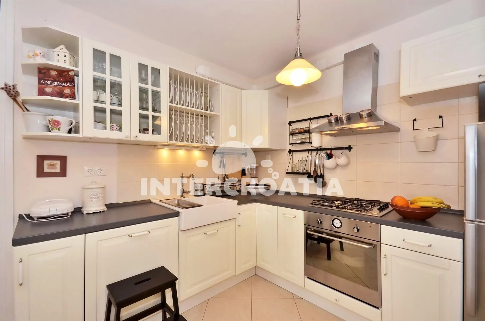 Apartmán (47 m2) s výhledem do klidné ulice se nachází ve 3. patře domu. Apartmán má 1 ložnici a je vhodný pro 2 až 3 osoby. Obývací pokoj je spojený s kuchyní. Kuchyňská linka je vybavena varnou deskou, digestoří, vestavěnou troubou, myčkou na nádobí, mikrovlnnou troubou, rychlovarnou konvicí, kávovarem, toustovačem, nádobím a lednicí s mrazákem. Obývací pokoj s jídelním stolem, pohovkou (rozložitelná na extra lůžko pro 1 osobu), televizí se satelitním programem, DVD přehrávačem, rádiem a klimatizací. Ložnice s jedním dvoulůžkem. Koupelna se sprchovým koutem, umyvadlem, fénem, pračkou a wc. Hostům je k dispozici parkování u objektu zdarma.