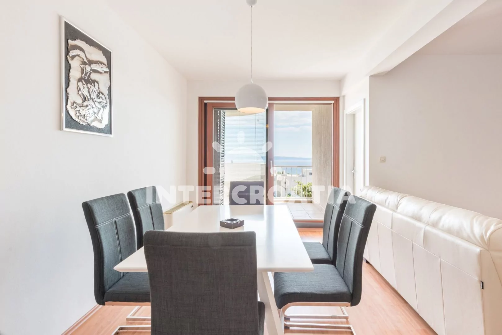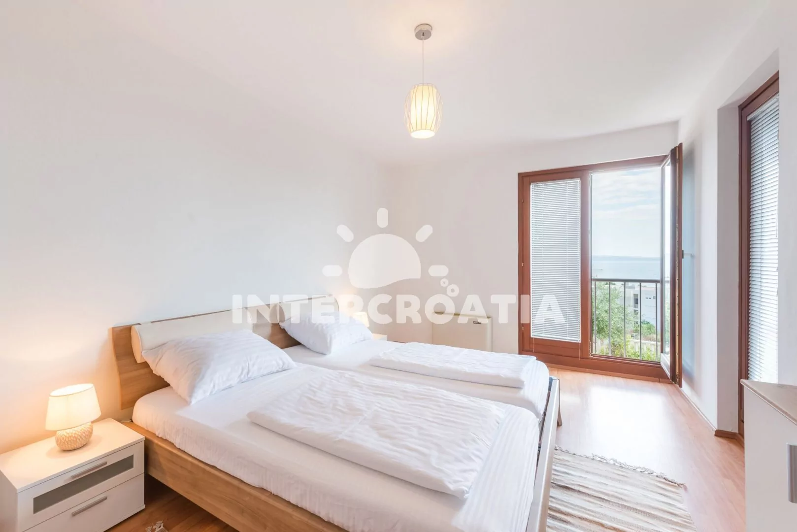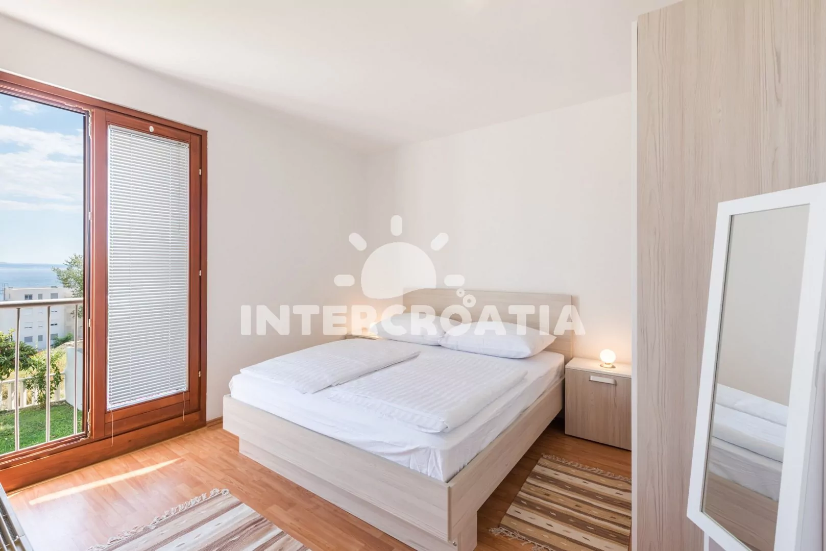 Apartmán (100 m2) s terasou a výhledem na moře se nachází v 1. patře domu. Apartmán má 3 ložnice a je vhodný pro až 6 osob. Obývací pokoj je spojený s kuchyní. Kuchyňská linka je vybavena sklokeramickou varnou deskou, digestoří, vestavěnou troubou, myčkou na nádobí, rychlovarnou konvicí, kávovarem, toustovačem, nádobím a lednicí s mrazákem. Obývací pokoj s jídelním stolem pro 6 osob, sedací soupravou s pohovkou, televizí se satelitním programem, klimatizací a vstupem na terasu. První, druhá i třetí ložnice je vybavena vždy s jedním dvoulůžkem a klimatizací. Koupelna s vířivou vanou, sprchovým koutem, umyvadlem, fénem, pračkou, bidetem a wc. Dále samostatné wc s umyvadlem. Hostům je k dispozici parkování u objektu zdarma.