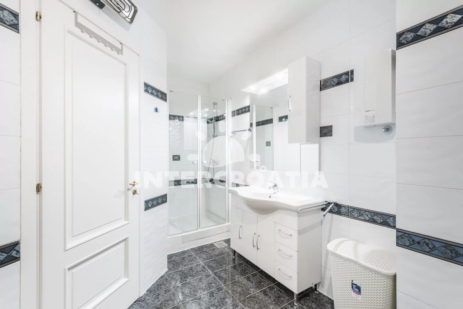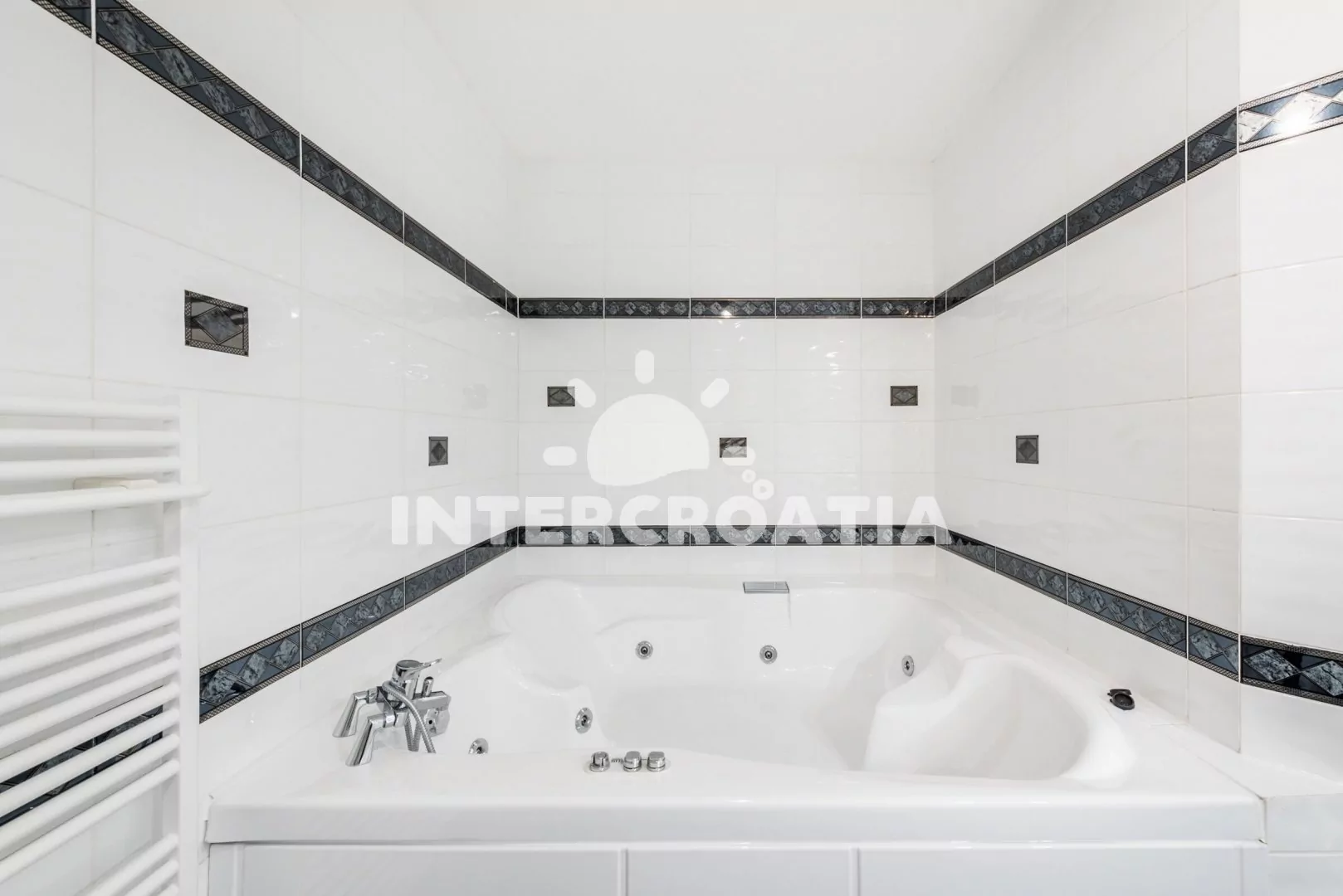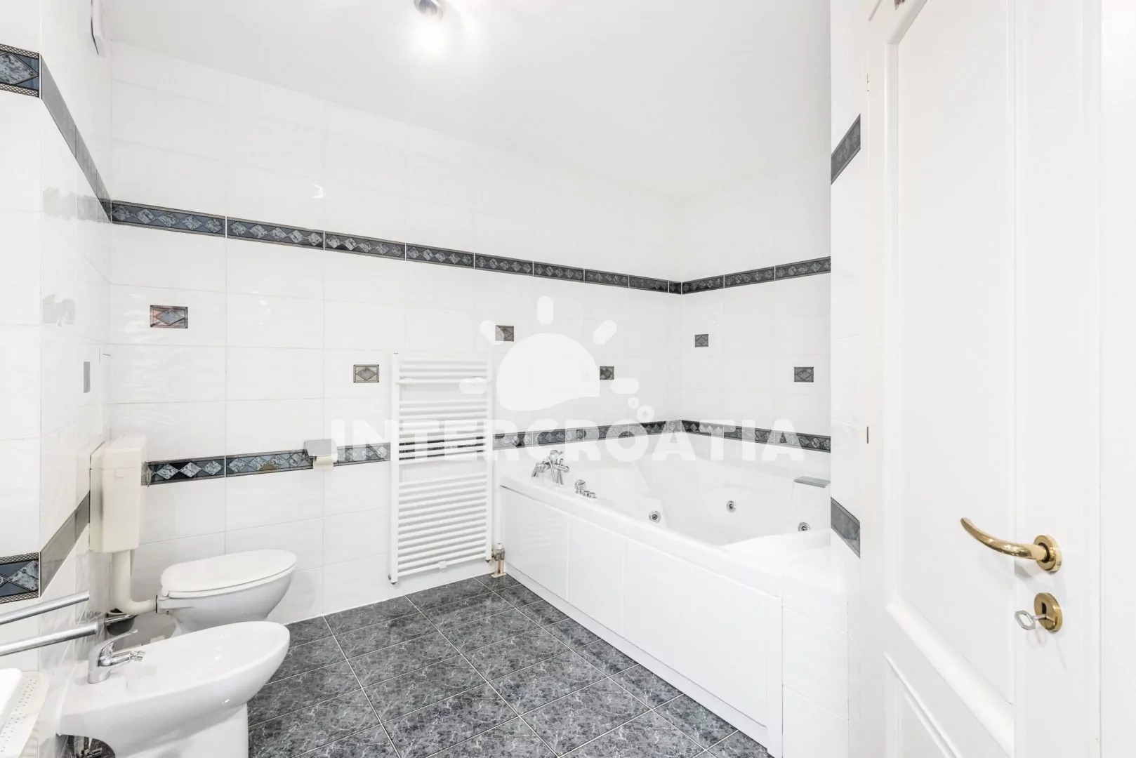 Apartmán (100 m2) s terasou a výhledem na moře se nachází v 1. patře domu. Apartmán má 3 ložnice a je vhodný pro až 6 osob. Obývací pokoj je spojený s kuchyní. Kuchyňská linka je vybavena sklokeramickou varnou deskou, digestoří, vestavěnou troubou, myčkou na nádobí, rychlovarnou konvicí, kávovarem, toustovačem, nádobím a lednicí s mrazákem. Obývací pokoj s jídelním stolem pro 6 osob, sedací soupravou s pohovkou, televizí se satelitním programem, klimatizací a vstupem na terasu. První, druhá i třetí ložnice je vybavena vždy s jedním dvoulůžkem a klimatizací. Koupelna s vířivou vanou, sprchovým koutem, umyvadlem, fénem, pračkou, bidetem a wc. Dále samostatné wc s umyvadlem. Hostům je k dispozici parkování u objektu zdarma.