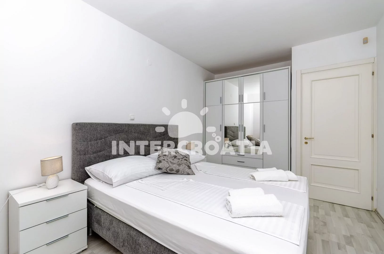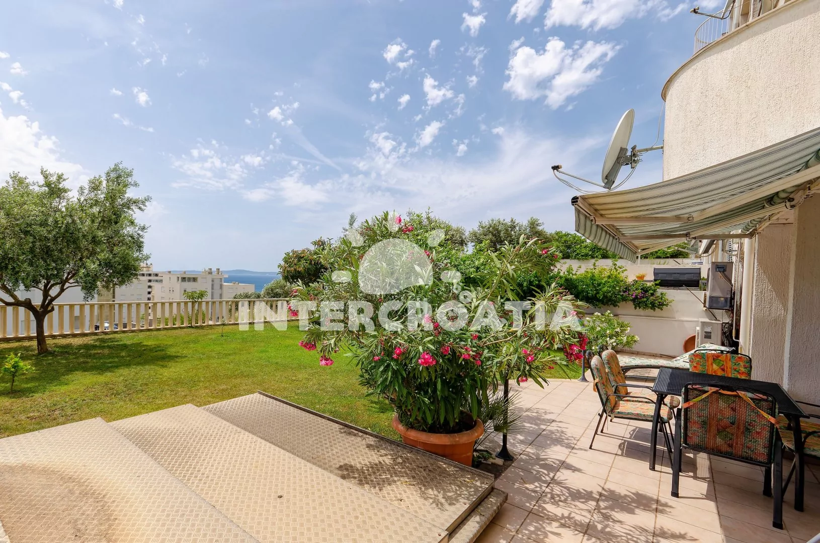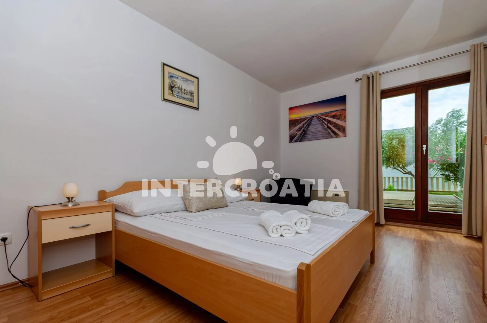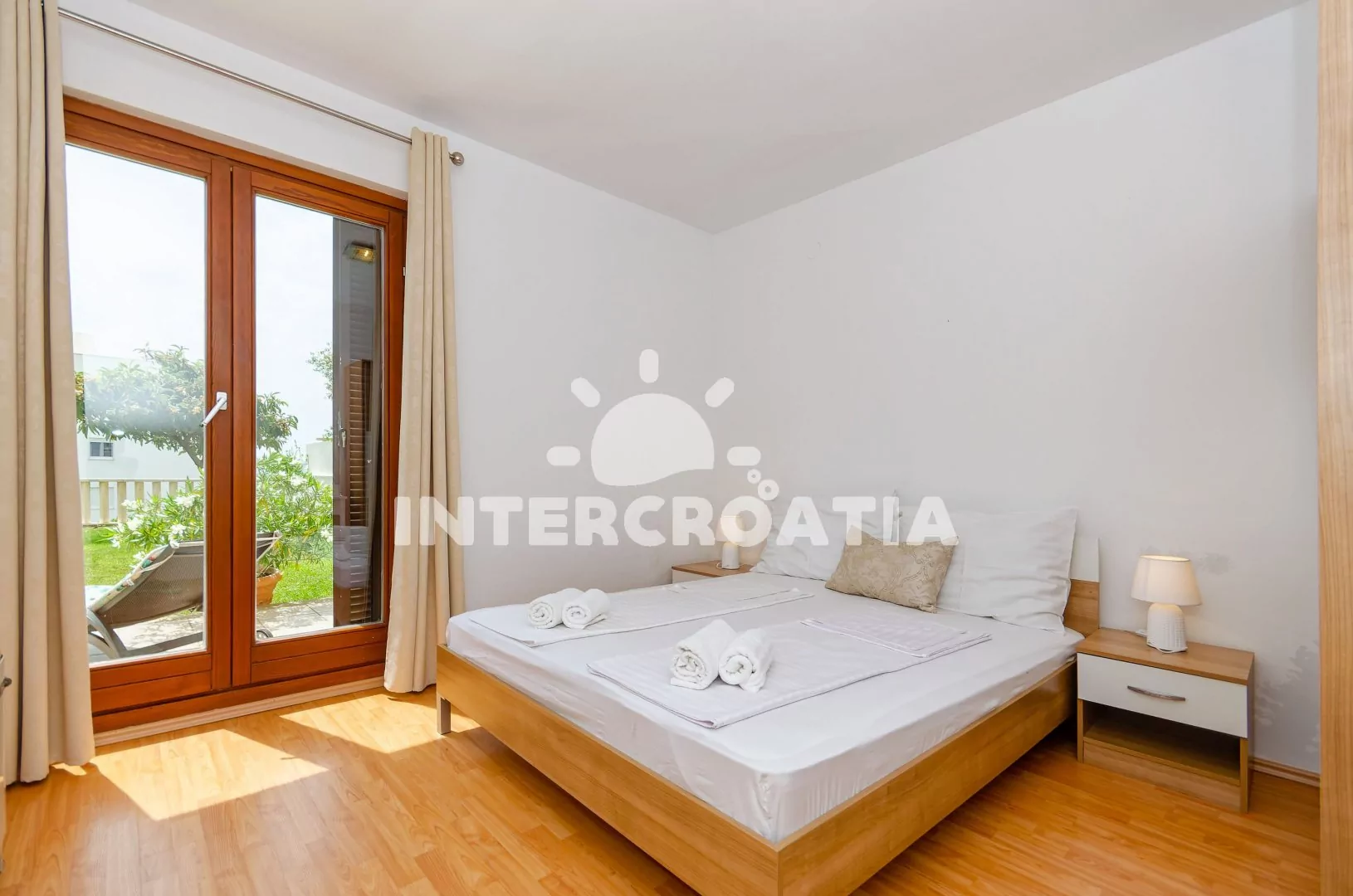 Apartmán (100 m2) s terasou, posezením a částečným výhledem na moře se nachází v přízemí domu. Apartmán má 3 ložnice a je vhodný pro až 6 osob. Obývací pokoj je spojený s kuchyní. Kuchyňská linka je vybavena sklokeramickou varnou deskou, digestoří, vestavěnou troubou, myčkou na nádobí, rychlovarnou konvicí, kávovarem, toustovačem, nádobím a lednicí s mrazákem. Obývací pokoj s jídelním stolem pro 6 osob, pohovkou, televizí se satelitním programem, klimatizací a vstupem na terasu. První, druhá i třetí ložnice je vybavena vždy s jedním dvoulůžkem, klimatizací a vstupem na terasu. Koupelna s vířivou vanou, sprchovým koutem, umyvadlem, fénem, pračkou, bidetem a wc. Dále samostatné wc s umyvadlem. Hostům je k dispozici parkování u objektu zdarma.