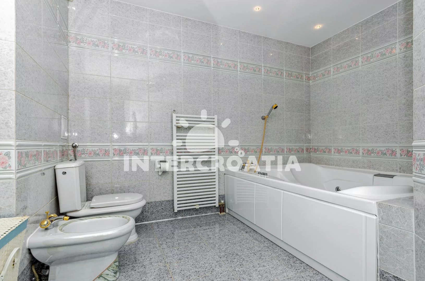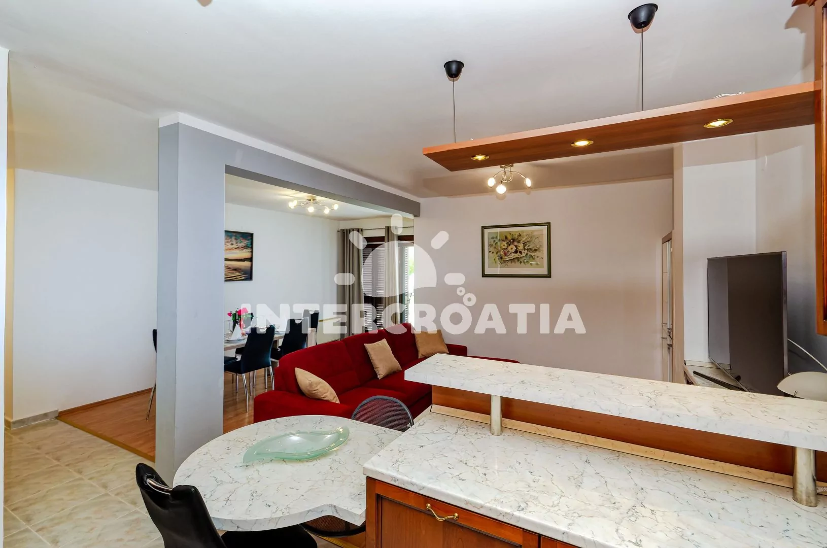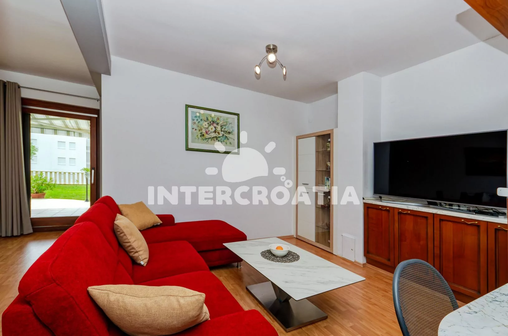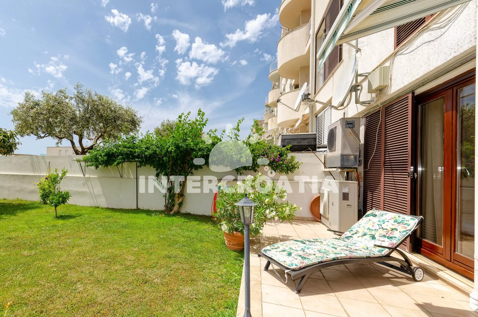 Apartmán (100 m2) s terasou, posezením a částečným výhledem na moře se nachází v přízemí domu. Apartmán má 3 ložnice a je vhodný pro až 6 osob. Obývací pokoj je spojený s kuchyní. Kuchyňská linka je vybavena sklokeramickou varnou deskou, digestoří, vestavěnou troubou, myčkou na nádobí, rychlovarnou konvicí, kávovarem, toustovačem, nádobím a lednicí s mrazákem. Obývací pokoj s jídelním stolem pro 6 osob, pohovkou, televizí se satelitním programem, klimatizací a vstupem na terasu. První, druhá i třetí ložnice je vybavena vždy s jedním dvoulůžkem, klimatizací a vstupem na terasu. Koupelna s vířivou vanou, sprchovým koutem, umyvadlem, fénem, pračkou, bidetem a wc. Dále samostatné wc s umyvadlem. Hostům je k dispozici parkování u objektu zdarma.