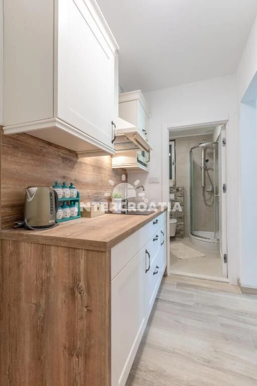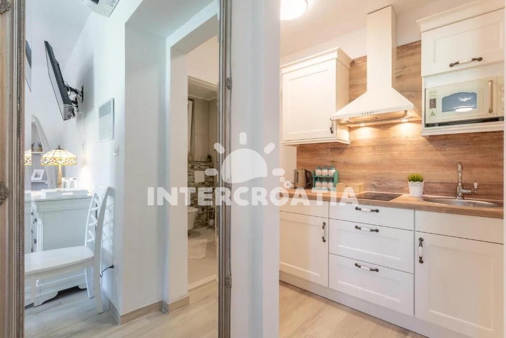 Apartmán (28 m2) se nachází ve 2. patře domu. Apartmán má 1 ložnici a je vhodný pro 2 osoby. Kuchyňská linka je vybavena dvouplotýnkovým vařičem, digestoří, mikrovlnnou troubou, rychlovarnou konvicí, toustovačem, nádobím a lednicí s mrazákem. Obývací místnost s jídelním stolem, pohovkou, televizí se satelitním programem, dvoulůžkem, šatní skříní a klimatizací. Koupelna se sprchovým koutem, umyvadlem, fénem a wc.