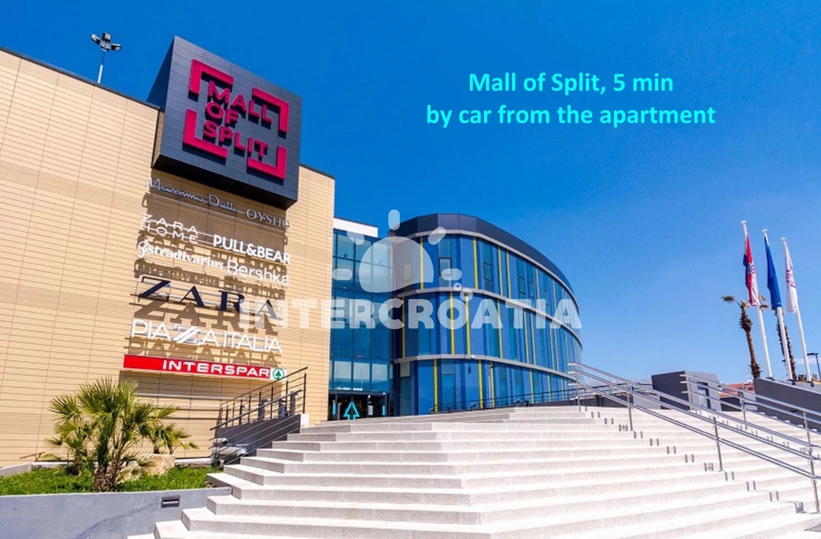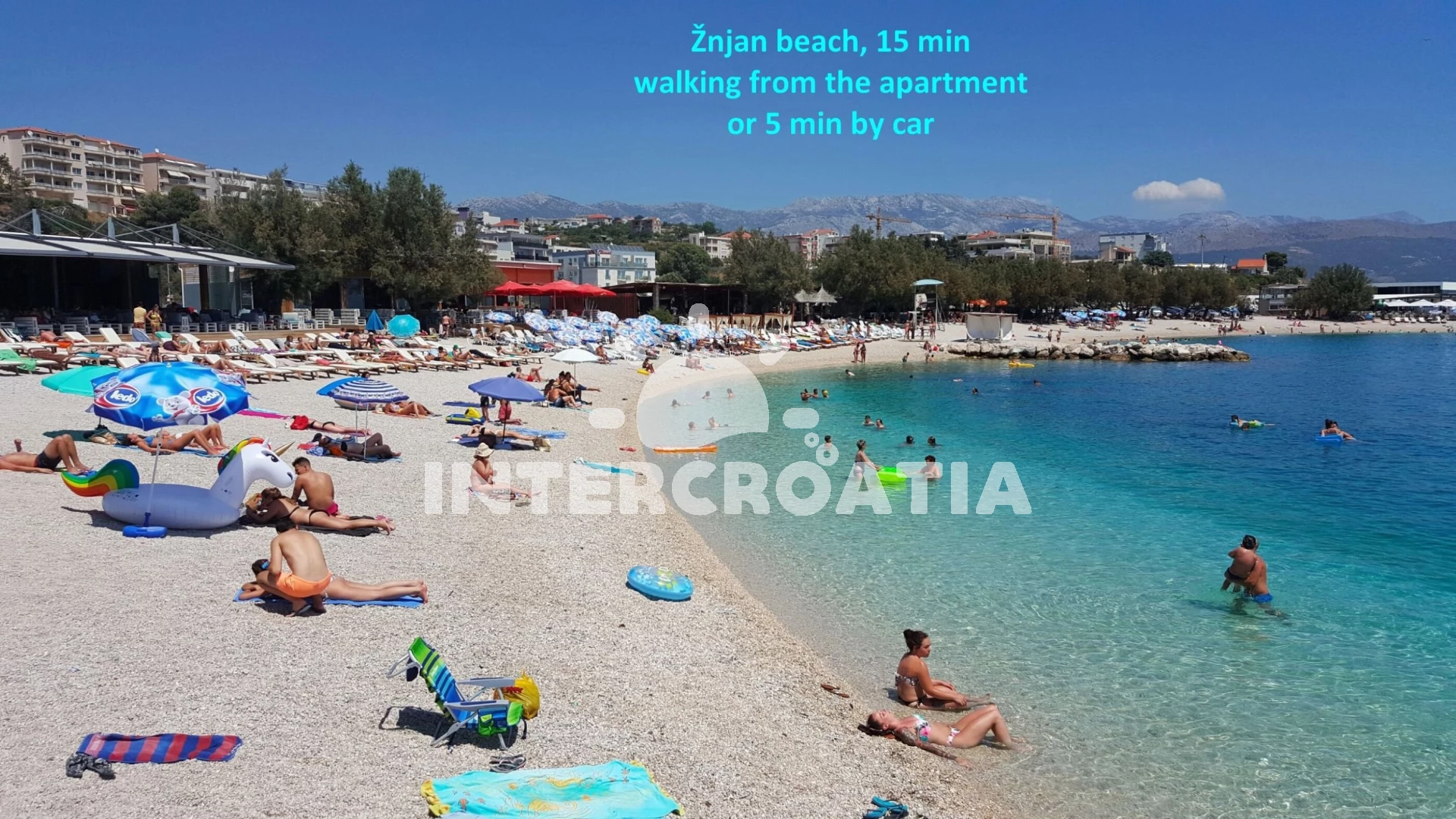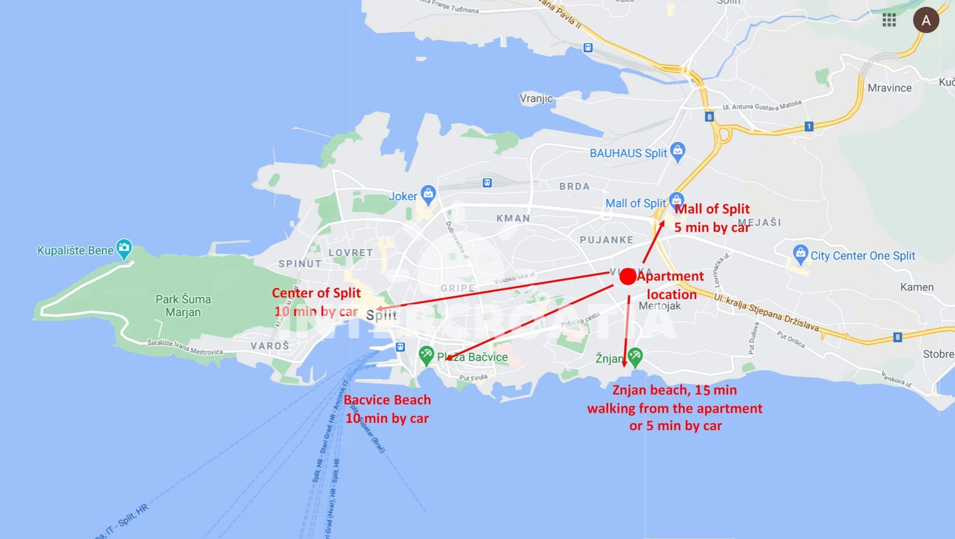 Vzdálenosti: Moře 1,5 km, pláž 1,9 km (skalnatá a oblázková), supermarket 30 m, bar 150 m, restaurace 150 m, veřejná doprava 300 m, diskotéka 1 km, lékárna 1 km, půjčovna kol 1 km, čerpací stanice 1 km, pošta 1 km, ambulance 1 km, banka 1,1 km, směnárna 1,1 km, tenisové kurty 2 km, centrum 3,5 km, trajekt (Split) 4 km, letiště (Split) 20 km,