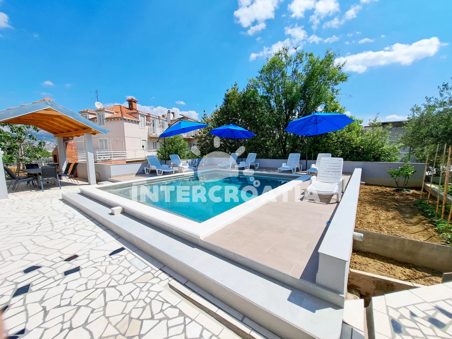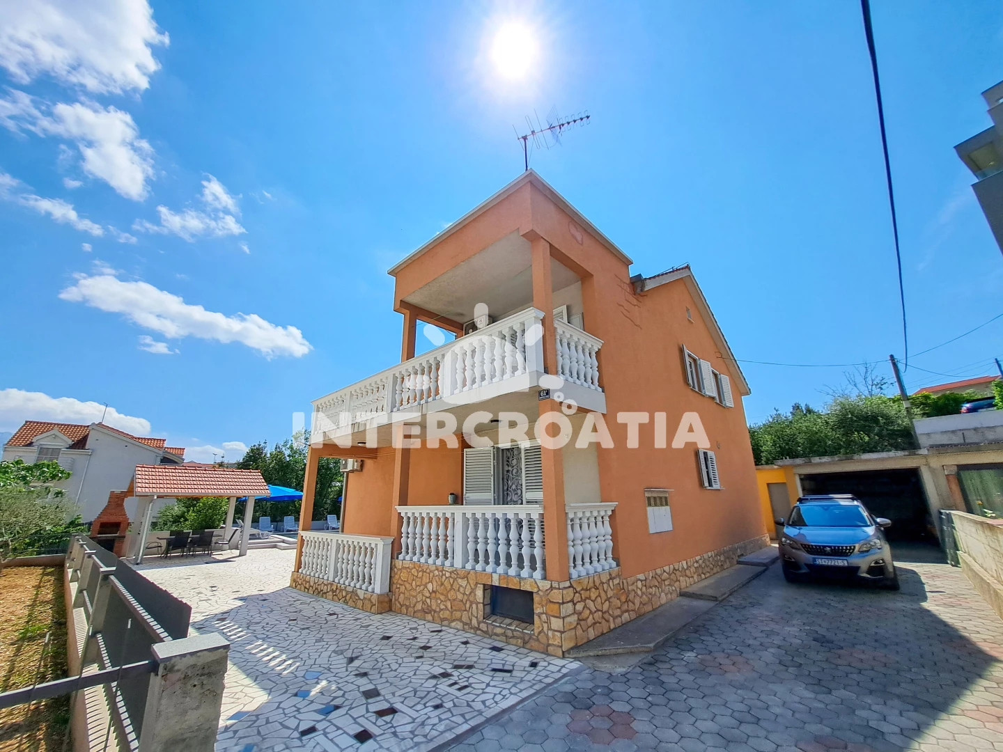 Apartmán se nachází 5000 m od moře a pláže. Pláž je oblázková. Apartmán disponuje bazénem s lehátky pro ubytované hosty. U objektu je k dispozici společná zahrada s posezením a grilem. Parkování je před domem.
