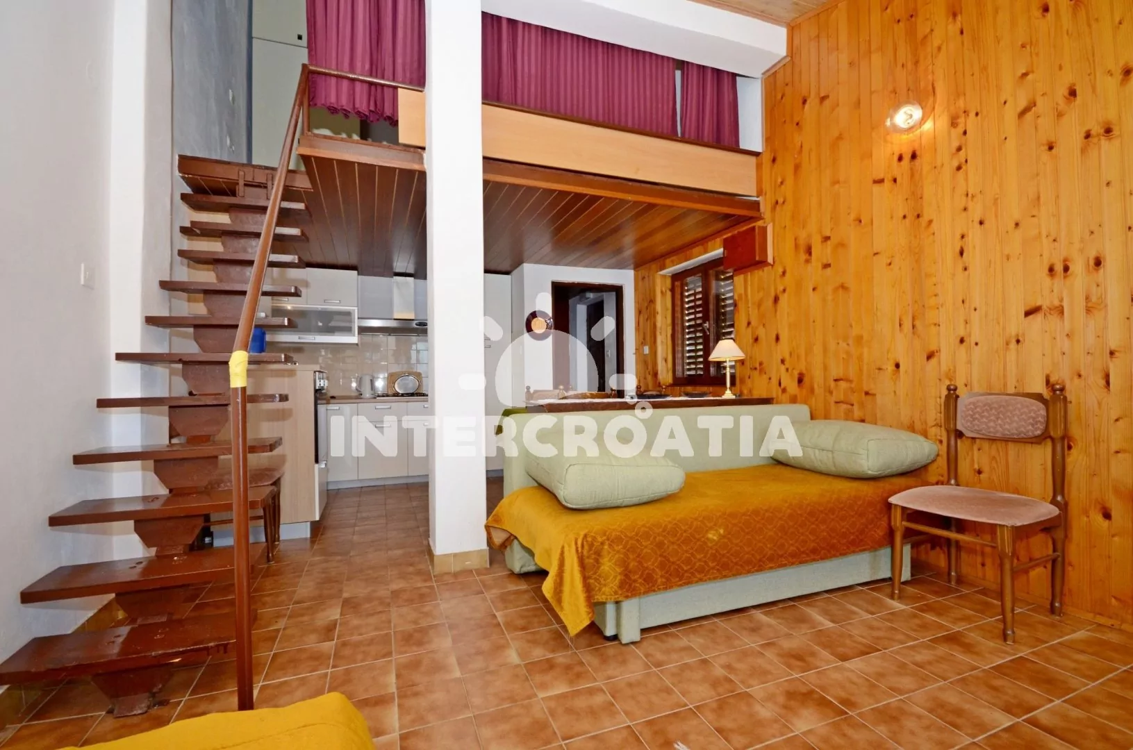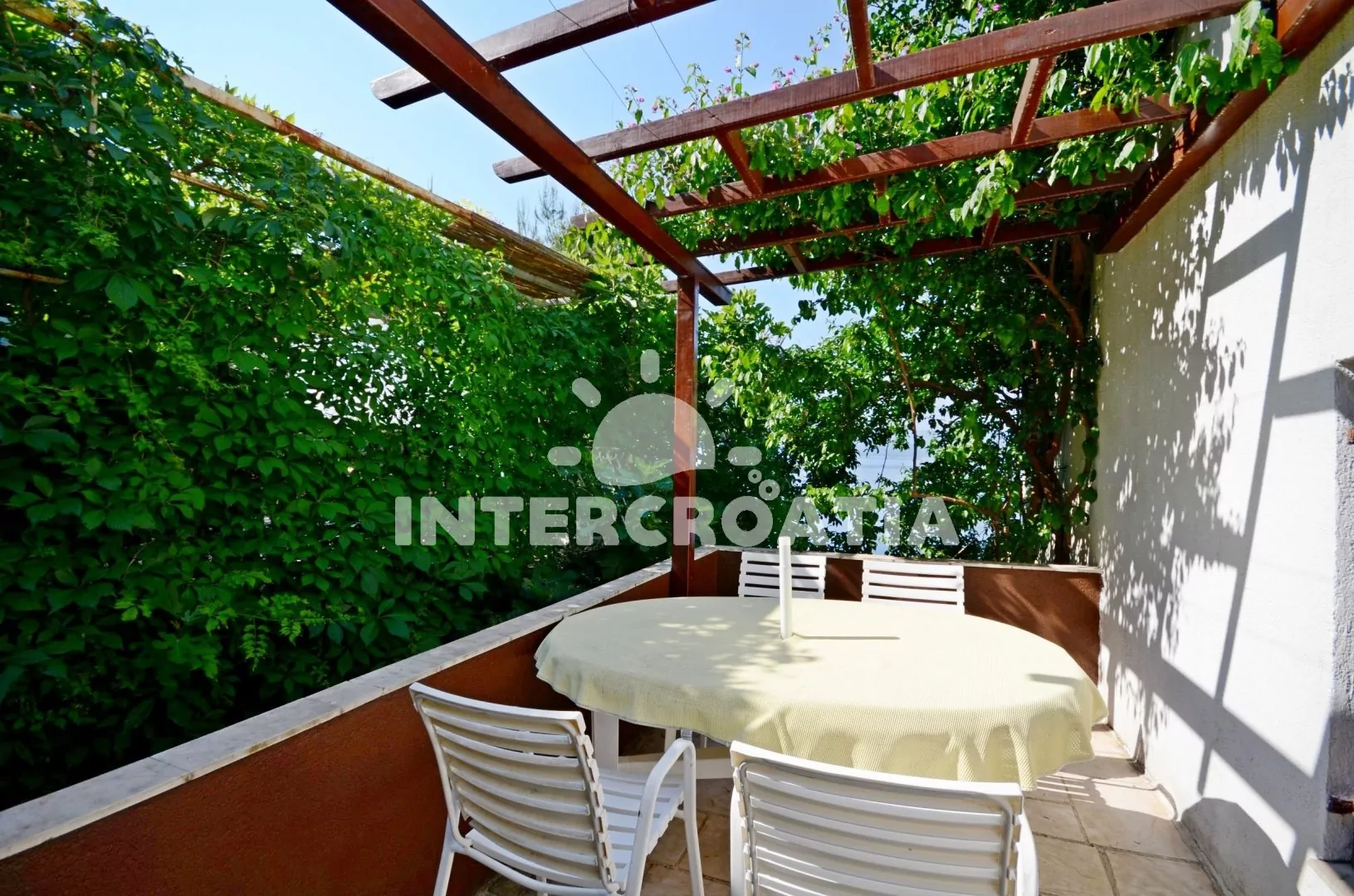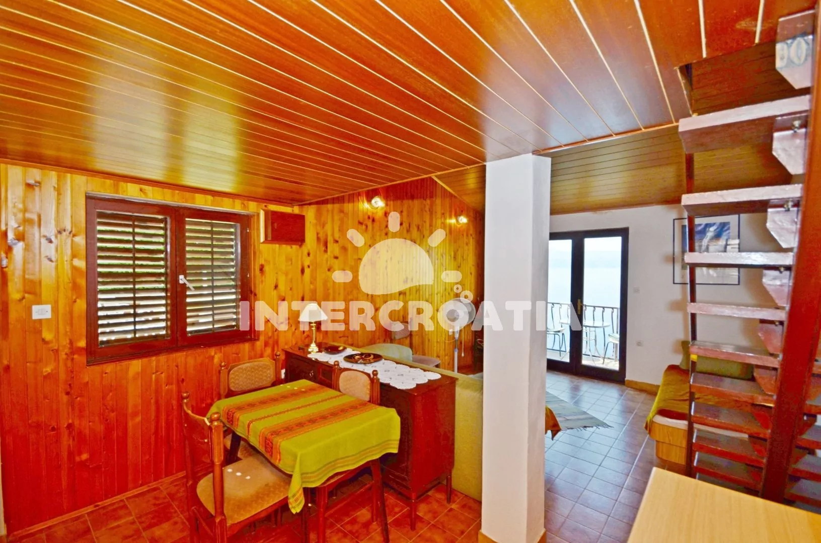 Vybavený studiový apartmán (40 m2) s terasou, balkonem a výhledem na moře, nacházející se v 1. patře domu. Vstup, obývací místnost spojená s kuchyní. Kuchyňská linka s varnou deskou (plyn), digestoří, troubou, lednicí s mrazákem a nádobím. V kuchyni jídelní stůl pro 3 osoby. Obývací pokoj s pohovkou (rozložitelná na extra lůžko pro 2 osoby) a televizí. V podkroví ložnice s dvoulůžkem. Koupelna se sprchovým koutem, umyvadlem a wc. Hosté mají k dispozici terasu s posezením a balkon. Parkování 150m - 300 m od domu.