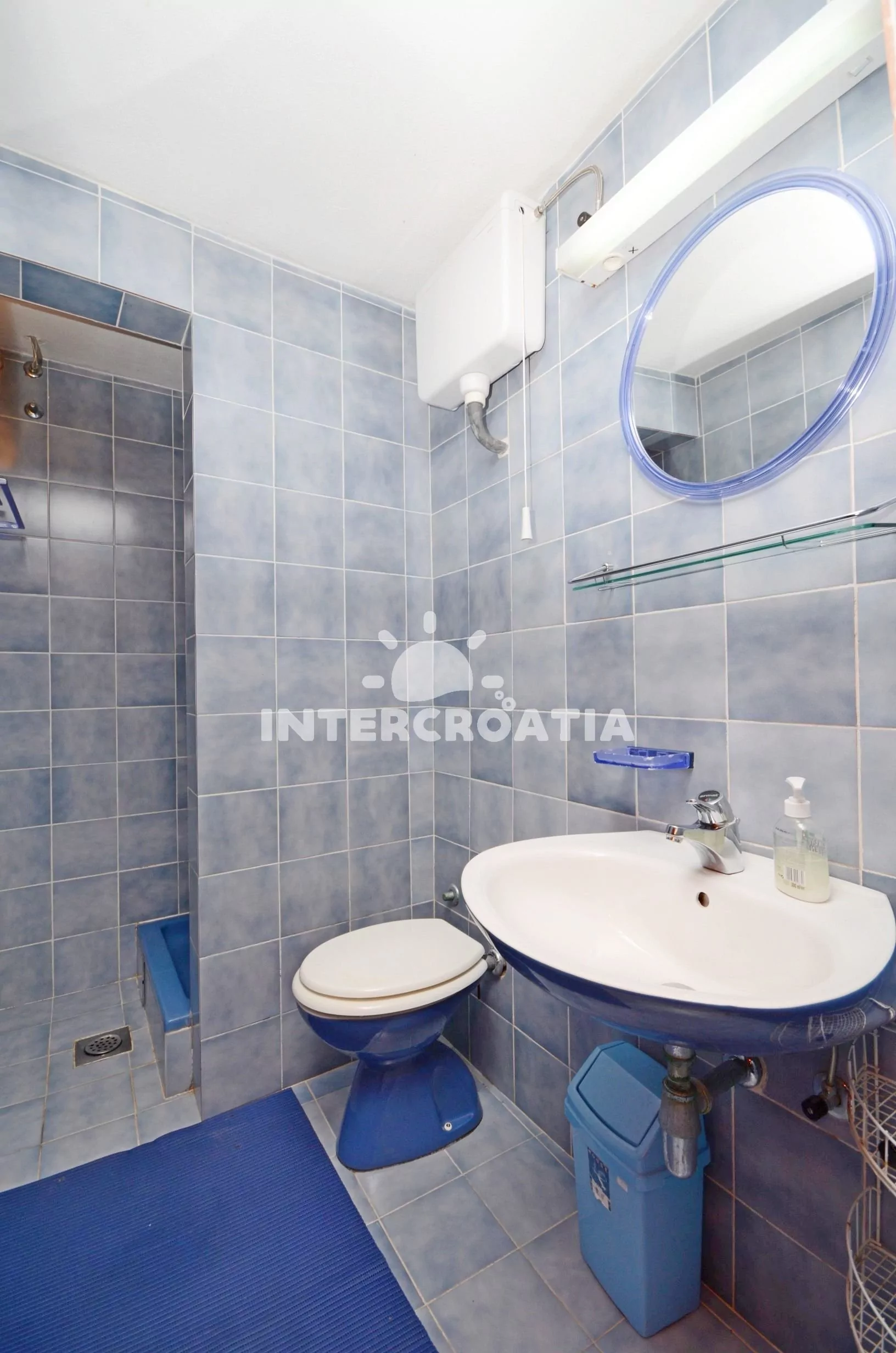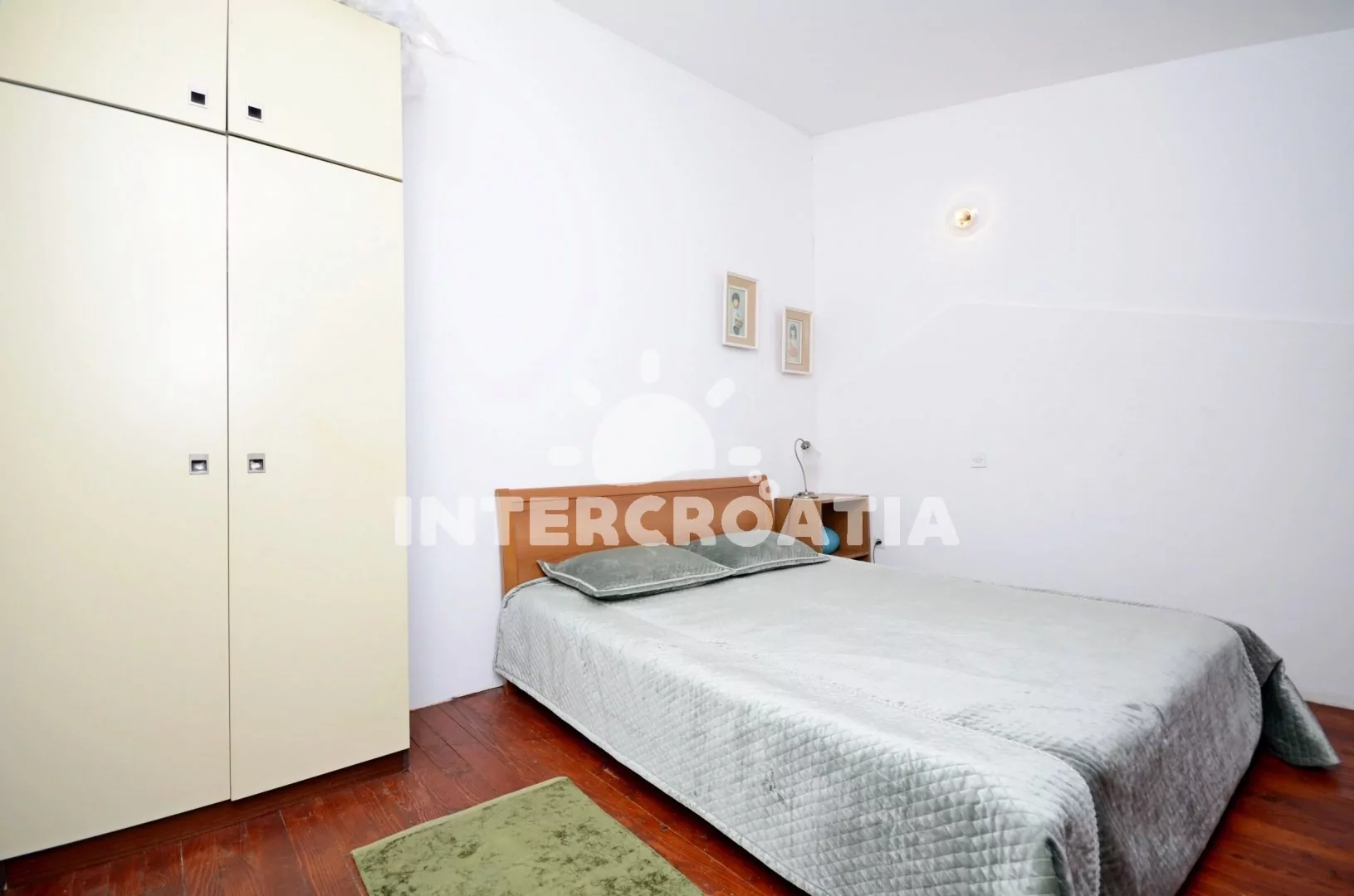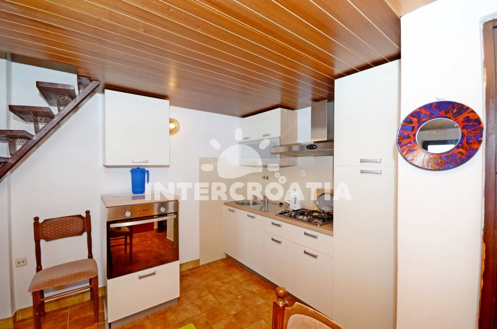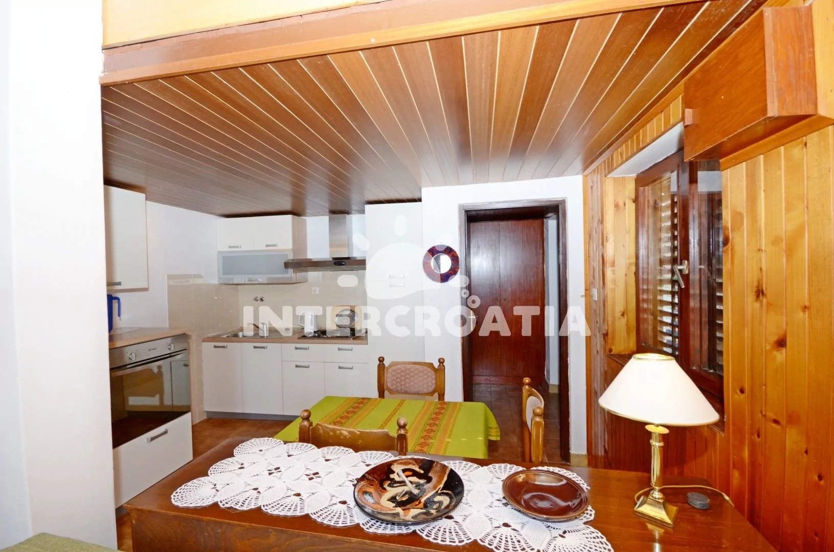 Vybavený studiový apartmán (40 m2) s terasou, balkonem a výhledem na moře, nacházející se v 1. patře domu. Vstup, obývací místnost spojená s kuchyní. Kuchyňská linka s varnou deskou (plyn), digestoří, troubou, lednicí s mrazákem a nádobím. V kuchyni jídelní stůl pro 3 osoby. Obývací pokoj s pohovkou (rozložitelná na extra lůžko pro 2 osoby) a televizí. V podkroví ložnice s dvoulůžkem. Koupelna se sprchovým koutem, umyvadlem a wc. Hosté mají k dispozici terasu s posezením a balkon. Parkování 150m - 300 m od domu.