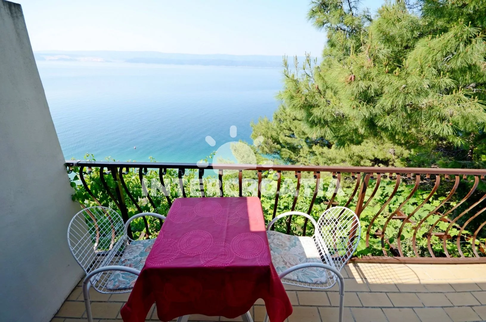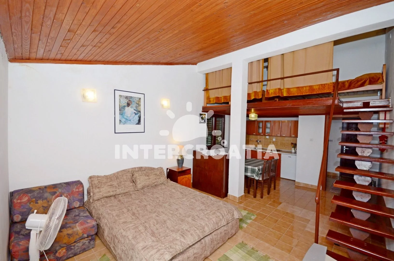Apartmán (40 m2) typu studio s balkonem a výhledem na moře se nachází v 1. patře domu. Vstup, obývací místnost spojená s kuchyní. Kuchyňská linka s dvouplotýnkovým vařičem, lednicí s mrazákem a nádobím. V kuchyni jídelní stůl pro 4 osoby. Obývací pokoj s pohovkou, dvoulůžkem a televizí. V podkroví ložnice s dvěma jednolůžky. Koupelna se sprchovým koutem, umyvadlem a wc. Hosté mají k dispozici balkon s posezením. Parkování 150m - 300 m od domu.