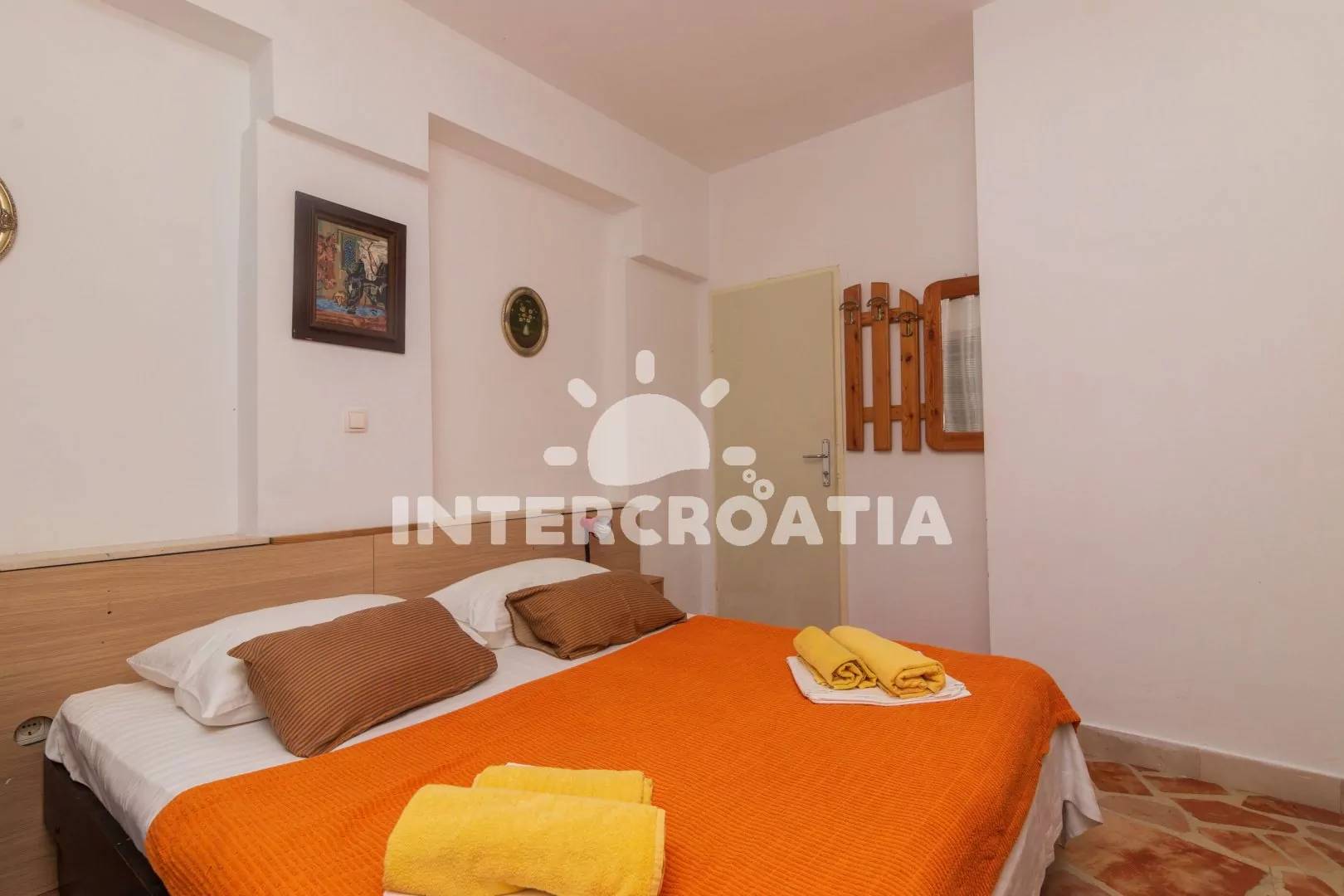 Apartmán (50 m2) s lodžií a výhledem na moře se nachází v přízemí domu. Apartmán má 2 ložnice a je vhodný pro 4 až 5 osob. Obývací pokoj je spojený s kuchyní. Kuchyňská linka je vybavena sklokeramickou varnou deskou, digestoří, vestavěnou troubou, rychlovarnou konvicí, kávovarem, nádobím a lednicí s mrazákem (mikrovlnná trouba na požádání). Obývací pokoj s jídelním stolem, sedací soupravou s pohovkou (rozložitelná na extra lůžko pro 1 osobu), televizí se satelitním programem, klimatizací a vstupem na terasu. První i druhá ložnice je vybavena vždy s jedním dvoulůžkem. Koupelna se sprchovým koutem, umyvadlem a wc. Hostům je k dispozici parkování u objektu zdarma.