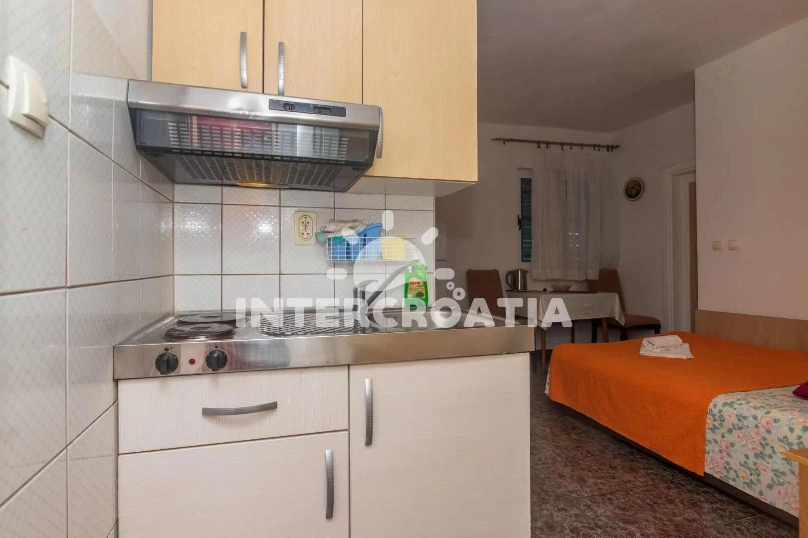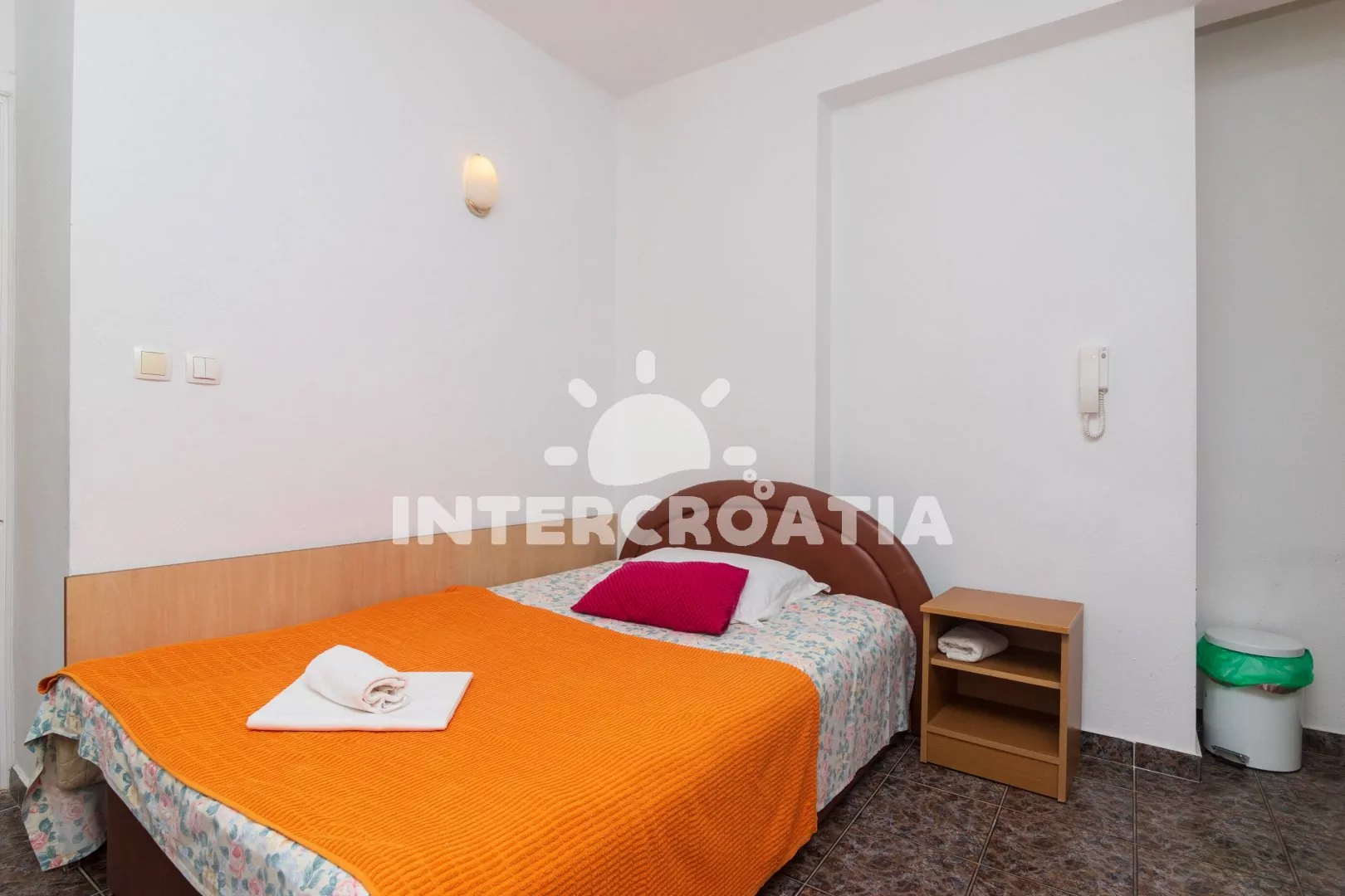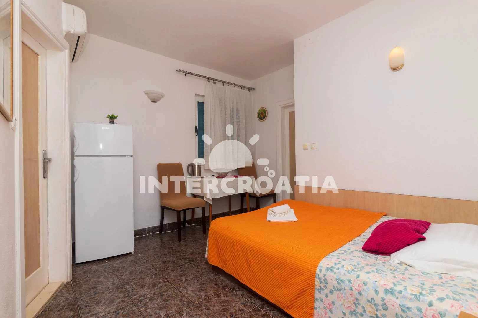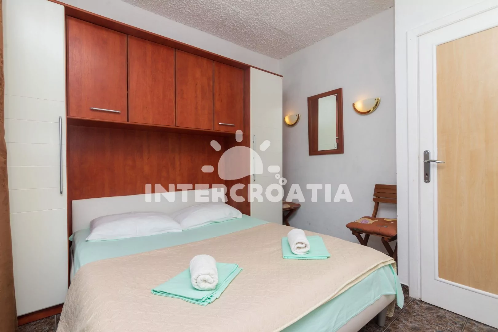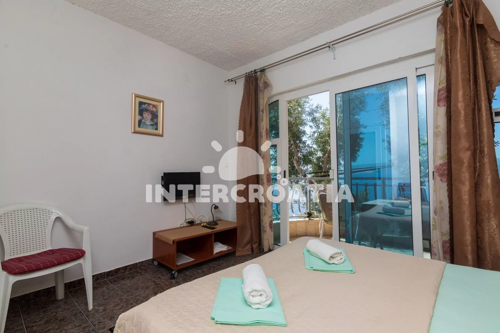 Apartmán (35 m2) s lodžií a výhledem na moře se nachází v přízemí vily. Apartmán má 1 ložnici a je vhodný pro 2 až 4 osoby. Obývací místnost je spojena s kuchyní. Kuchyňská linka je vybavena dvouplotýnkovým vařičem, digestoří, rychlovarnou konvicí, nádobím a lednicí s mrazákem, (mikrovlnná trouba na požádání). Obývací místnost s jídelním stolem, přistýlkou (extra lůžko pro 2 osoby) a klimatizací. Ložnice s dvoulůžkem, televizí se satelitním programem a vstupem na balkon. Koupelna se sprchovým koutem, umyvadlem a wc. Hostům je k dispozici parkování u objektu zdarma.