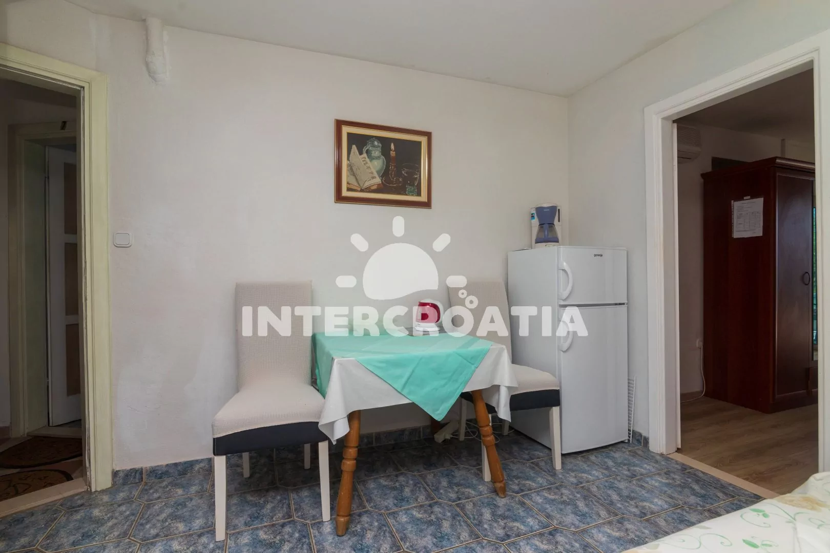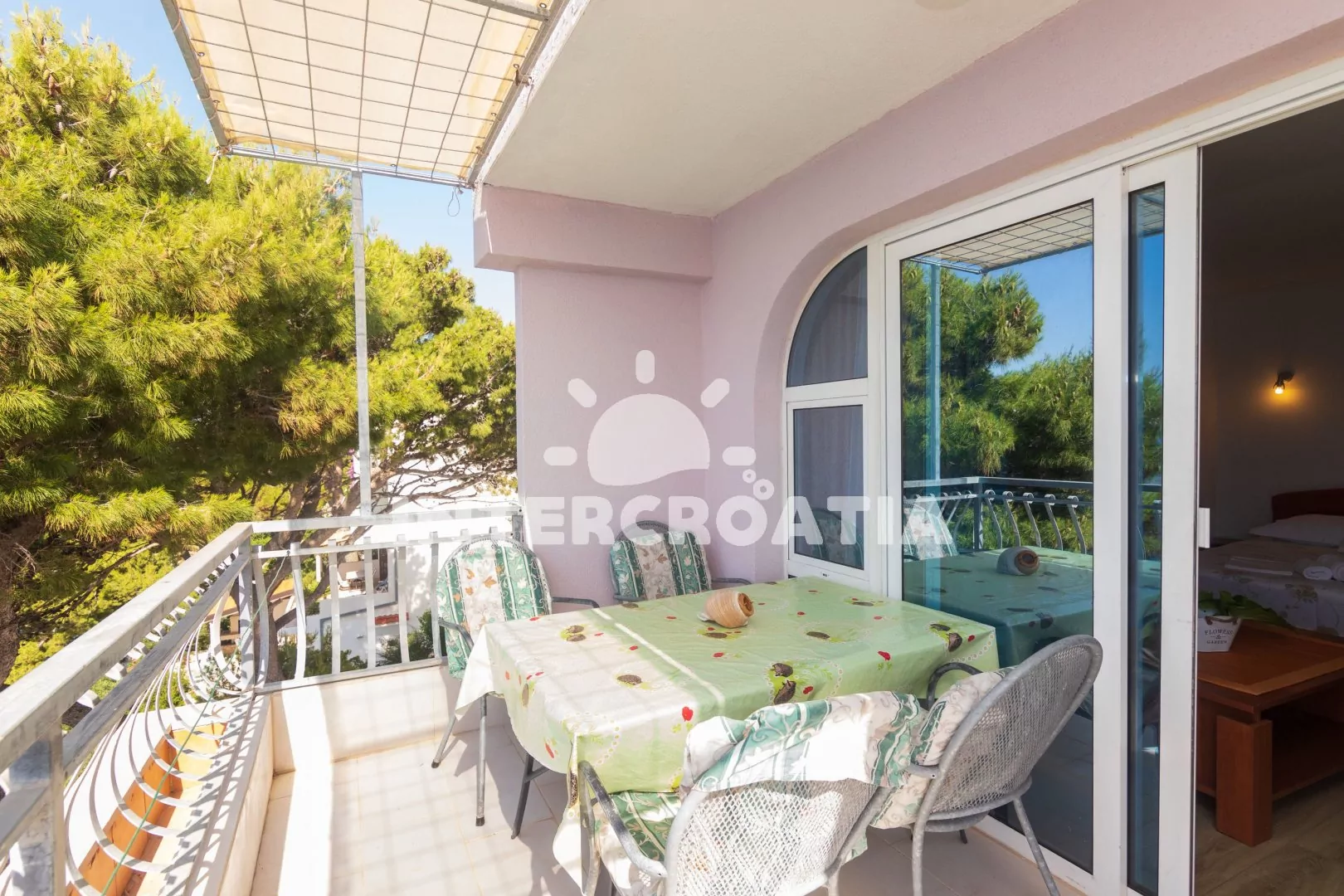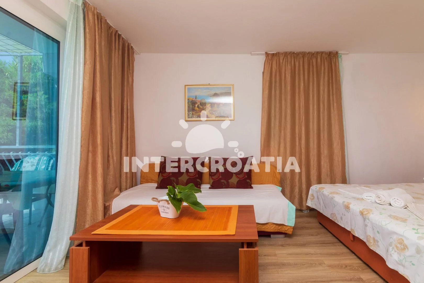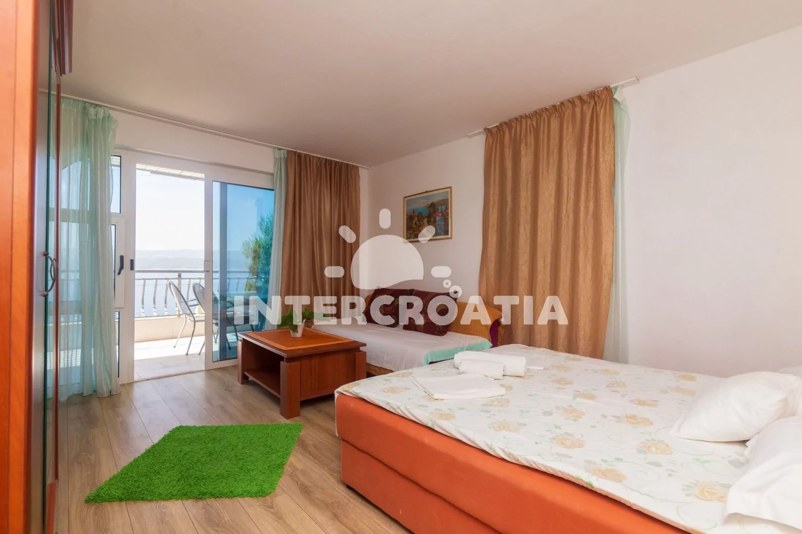 Apartmán (45 m2) s terasou a výhledem na moře se nachází ve 2. patře domu. Apartmán má 1 ložnici a je vhodný pro 2 až 4 osoby. Obývací místnost je spojena s kuchyní. Kuchyňská linka je vybavena dvouplotýnkovým vařičem, rychlovarnou konvicí, nádobím a lednicí s mrazákem, (mikrovlnná trouba na požádání). Obývací místnost s jídelním stolem a přistýlkou (extra lůžko pro 2 osoby). Ložnice s dvoulůžkem, pohovkou, televizí se satelitním programem, klimatizací a vstupem na terasu. Koupelna se sprchovým koutem, umyvadlem a wc. Hostům je k dispozici parkování u objektu zdarma.