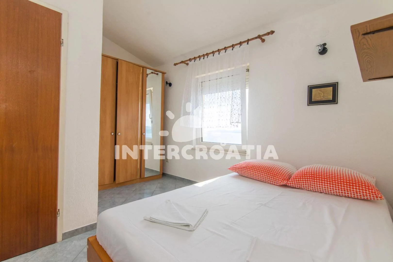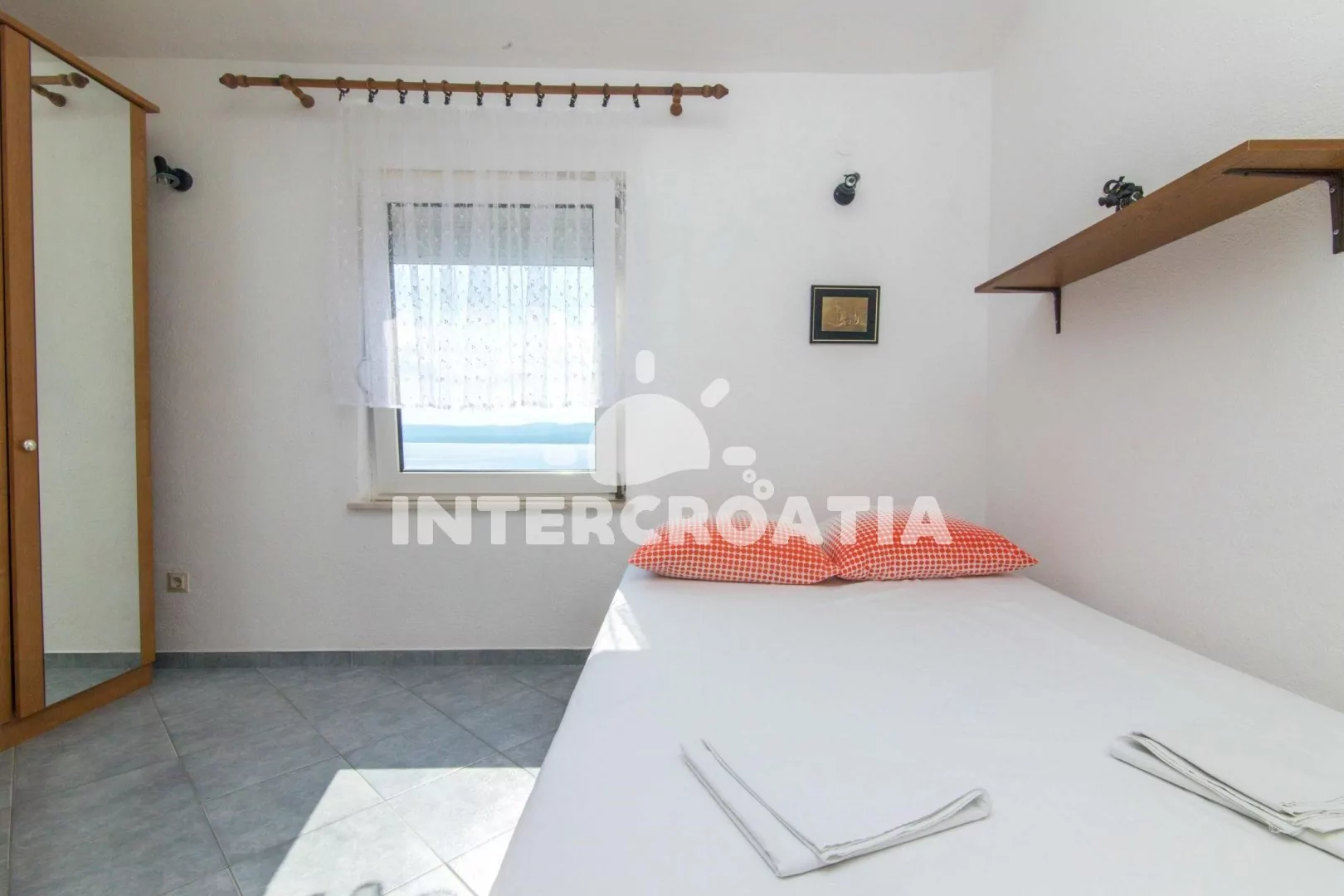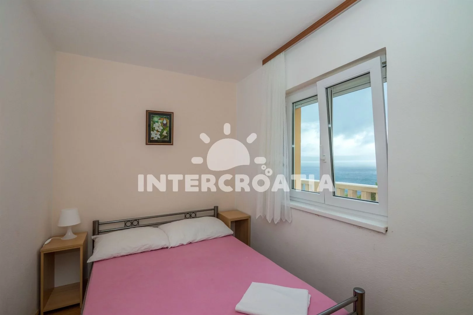Apartmán (61 m2) s terasou, posezením a výhledem na moře se nachází v 1. patře domu. Apartmán má 2 ložnice, 2 koupelny a je vhodný pro 4 osoby. Obývací pokoj je spojený s kuchyní. Kuchyňská linka je vybavena dvouplotýnkovým vařičem, digestoří, mikrovlnnou troubou, kávovarem, toustovačem, nádobím a lednicí s mrazákem. Obývací pokoj s pohovkou, televizí se satelitním programem, rádiem a vstupem na terasu. První ložnice s dvoulůžkem a vstupem na terasu. Druhá ložnice rovněž s dvoulůžkem. První i druhá koupelna se sprchovým koutem, umyvadlem a wc. Hostům je k dispozici parkování u objektu zdarma.
