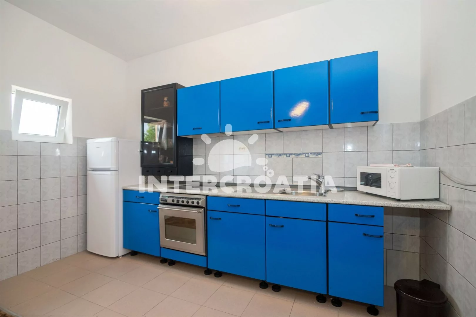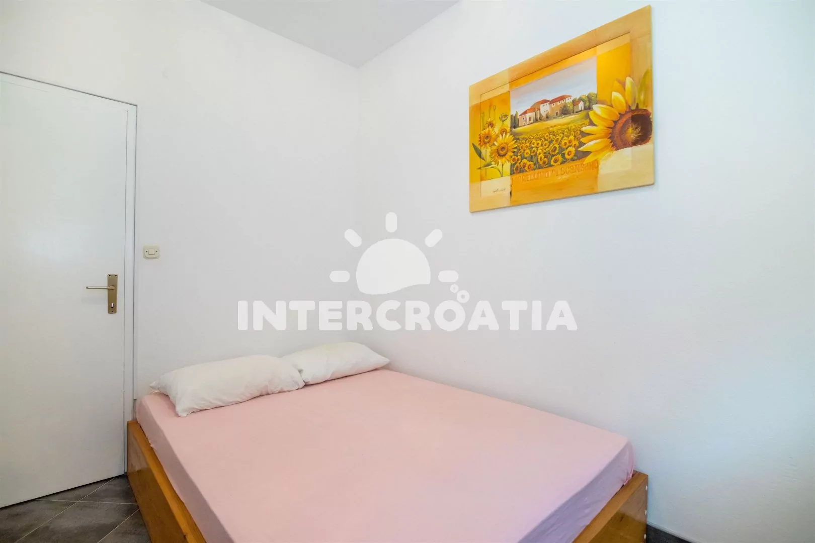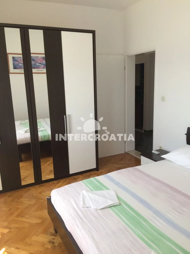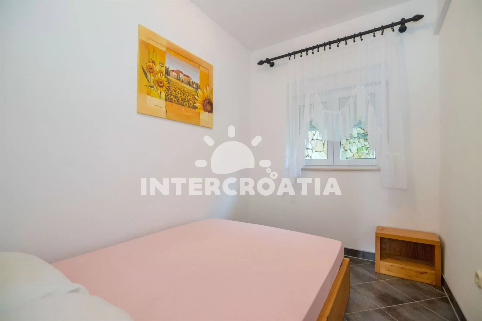 Apartmán (71 m2) s terasou, posezením a výhledem na moře se nachází v přízemí domu. Apartmán má 2 ložnice a je vhodný pro 4 osoby. Obývací pokoj je spojený s kuchyní. Kuchyňská linka je vybavena sklokeramickou varnou deskou, vestavěnu troubou, rychlovarnou konvicí, mikrovlnnou troubou, kávovarem, toustovačem, nádobím a lednicí s mrazákem. Obývací pokoj s jídelním stolem, pohovkou, televizí se satelitním programem, rádiem a klimatizací. První i druhá ložnice je vybavena vždy s jedním dvoulůžkem. Koupelna se sprchovým koutem a umyvadlem. Dále samostatné wc s umyvadlem. Hostům je k dispozici parkování u objektu zdarma.