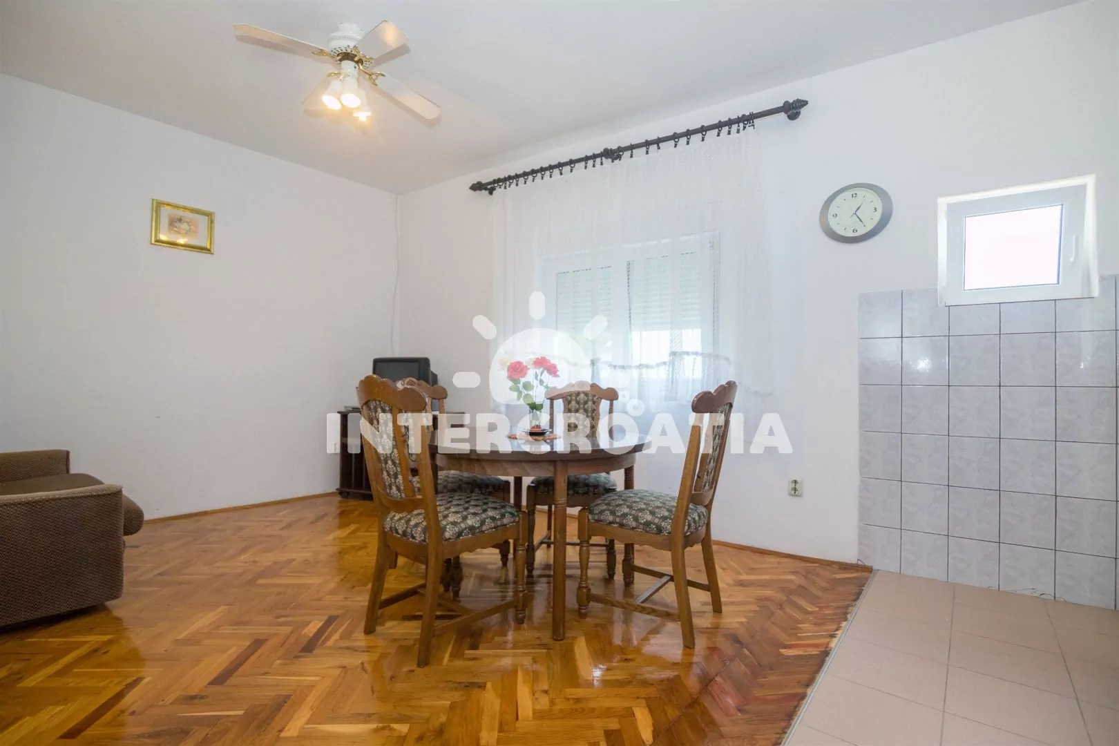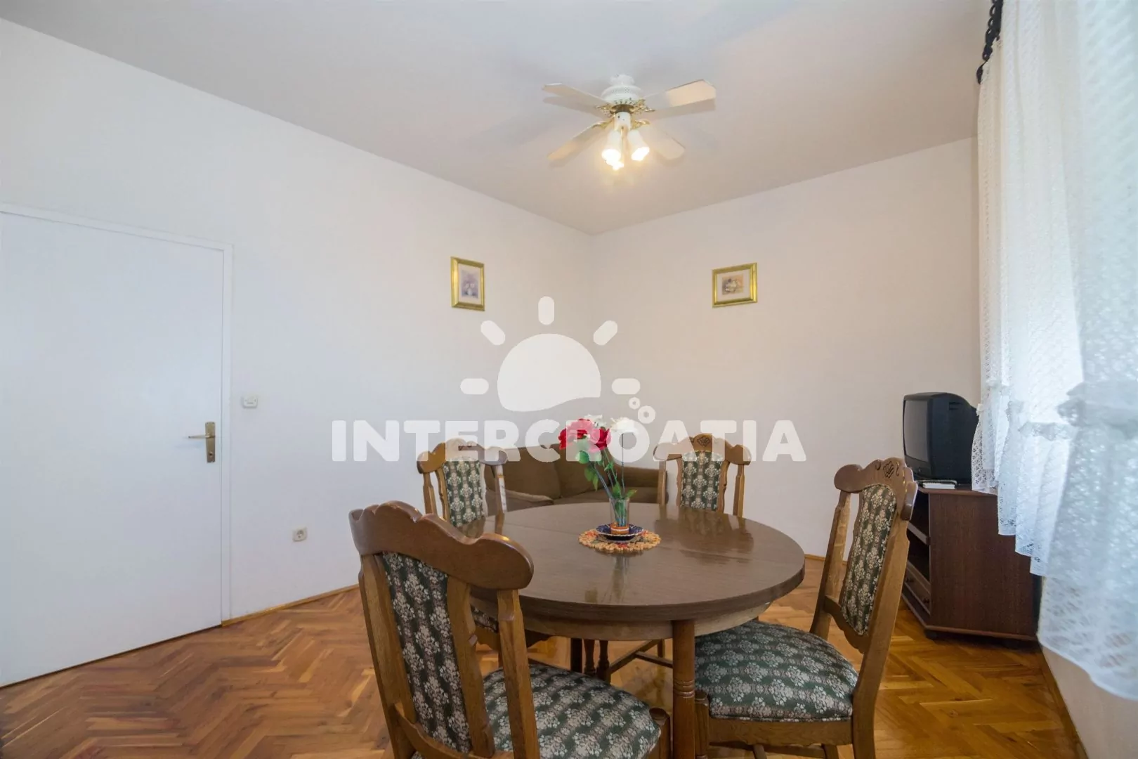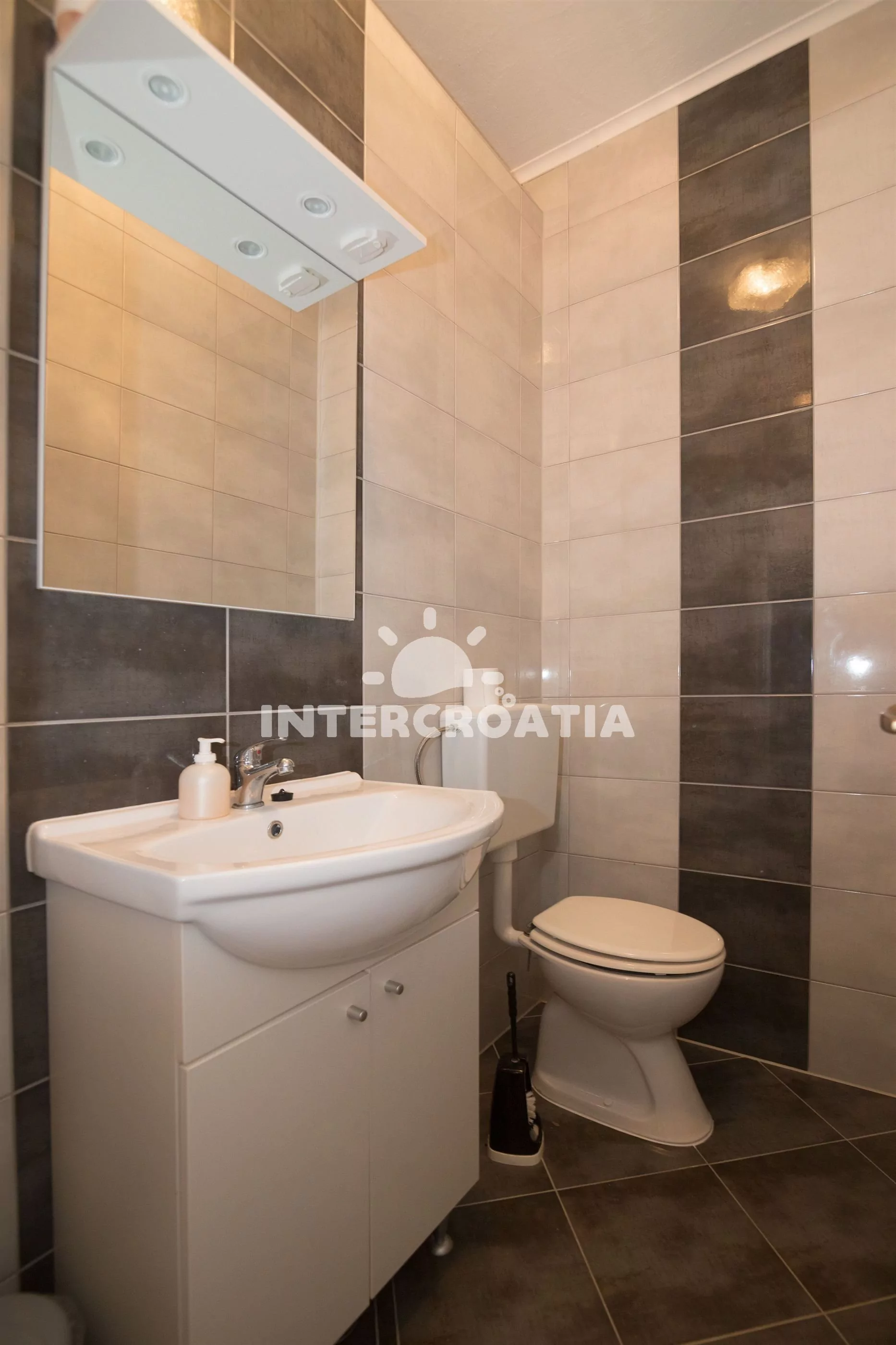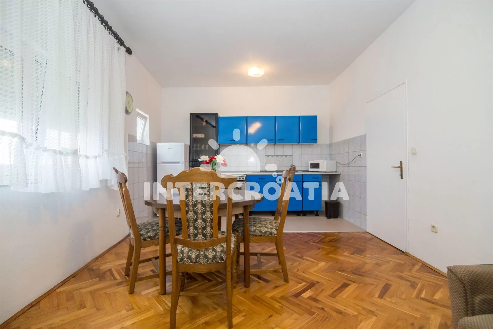 Apartmán (71 m2) s terasou, posezením a výhledem na moře se nachází v přízemí domu. Apartmán má 2 ložnice a je vhodný pro 4 osoby. Obývací pokoj je spojený s kuchyní. Kuchyňská linka je vybavena sklokeramickou varnou deskou, vestavěnu troubou, rychlovarnou konvicí, mikrovlnnou troubou, kávovarem, toustovačem, nádobím a lednicí s mrazákem. Obývací pokoj s jídelním stolem, pohovkou, televizí se satelitním programem, rádiem a klimatizací. První i druhá ložnice je vybavena vždy s jedním dvoulůžkem. Koupelna se sprchovým koutem a umyvadlem. Dále samostatné wc s umyvadlem. Hostům je k dispozici parkování u objektu zdarma.