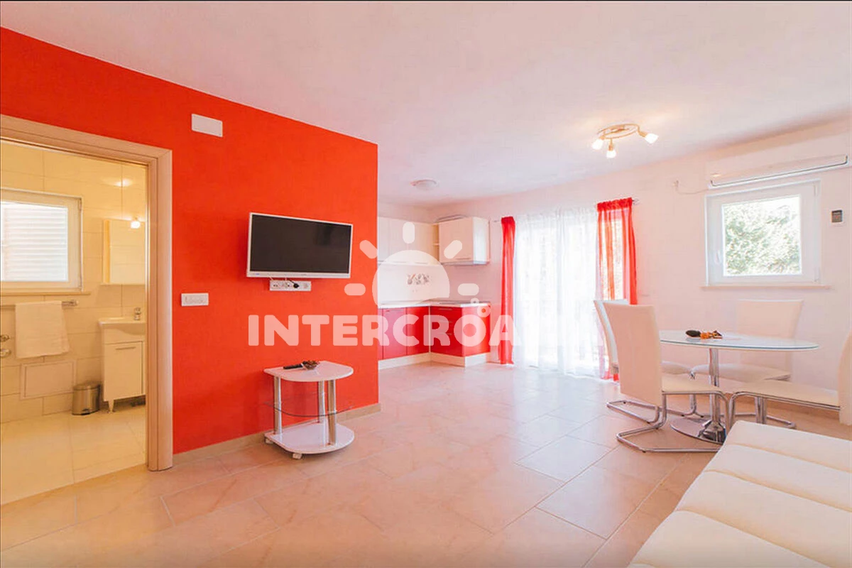 Apartmán (33 m2) s terasou, venkovním posezením a výhledem na moře se nachází ve 2. patře domu. Apartmán má 1 ložnici a je vhodný pro až 3 osoby. Obývací pokoj je spojený s kuchyní. Kuchyňská linka je vybavena dvouplotýnkovým vařičem, digestoří, rychlovarnou konvicí, mikrovlnnou troubou, nádobím a lednicí s mrazákem. Obývací pokoj s jídelním stolem, pohovkou (rozložitelná na extra lůžko pro 1 osobu), televizí, klimatizací a vstupem na terasu. Ložnice s dvoulůžkem. Koupelna se sprchovým koutem, umyvadlem, pračkou, fénem a wc. Hostům je k dispozici parkování u objektu zdarma.