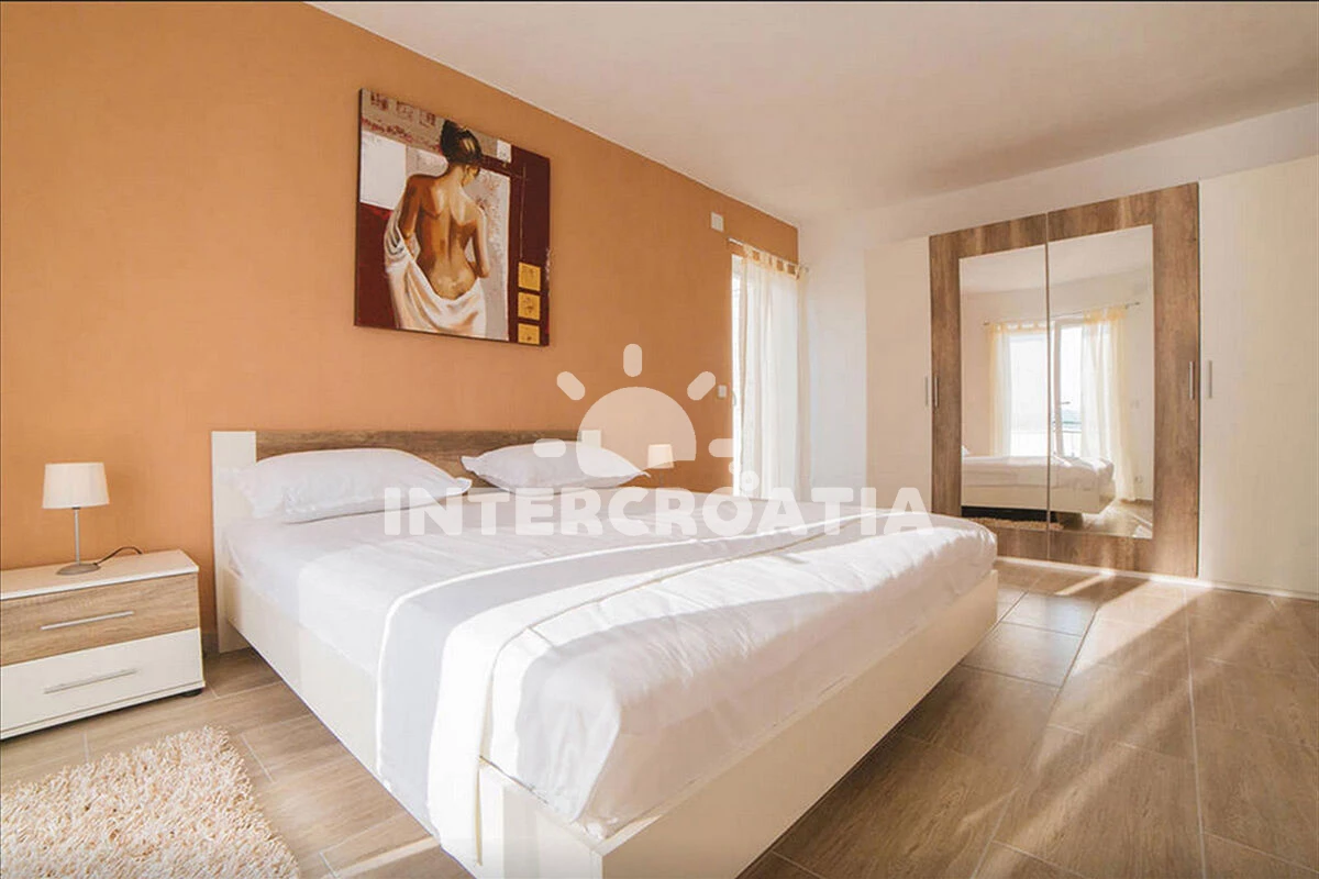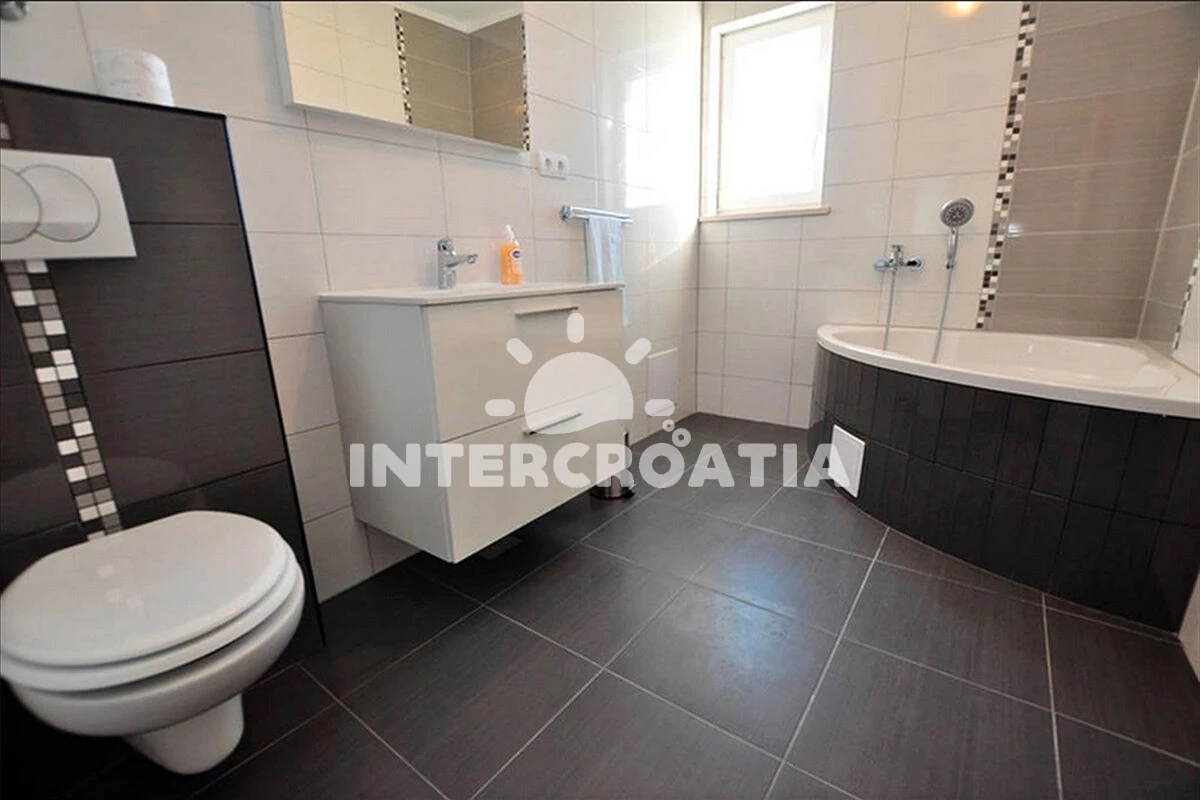 Apartmán (40 m2) s balkonem, venkovním posezením a výhledem na moře se nachází ve 2. patře domu. Apartmán má 1 ložnici a je vhodný pro až 3 osoby. Obývací pokoj je spojený s kuchyní. Kuchyňská linka je vybavena dvouplotýnkovým vařičem, digestoří, rychlovarnou konvicí, mikrovlnnou troubou, nádobím a lednicí s mrazákem. Obývací pokoj s jídelním stolem, pohovkou (rozložitelná na extra lůžko pro 1 osobu), televizí, klimatizací a vstupem na balkon. Ložnice s dvoulůžkem. Koupelna s vanou, umyvadlem, pračkou, fénem a wc. Hostům je k dispozici parkování u objektu zdarma.