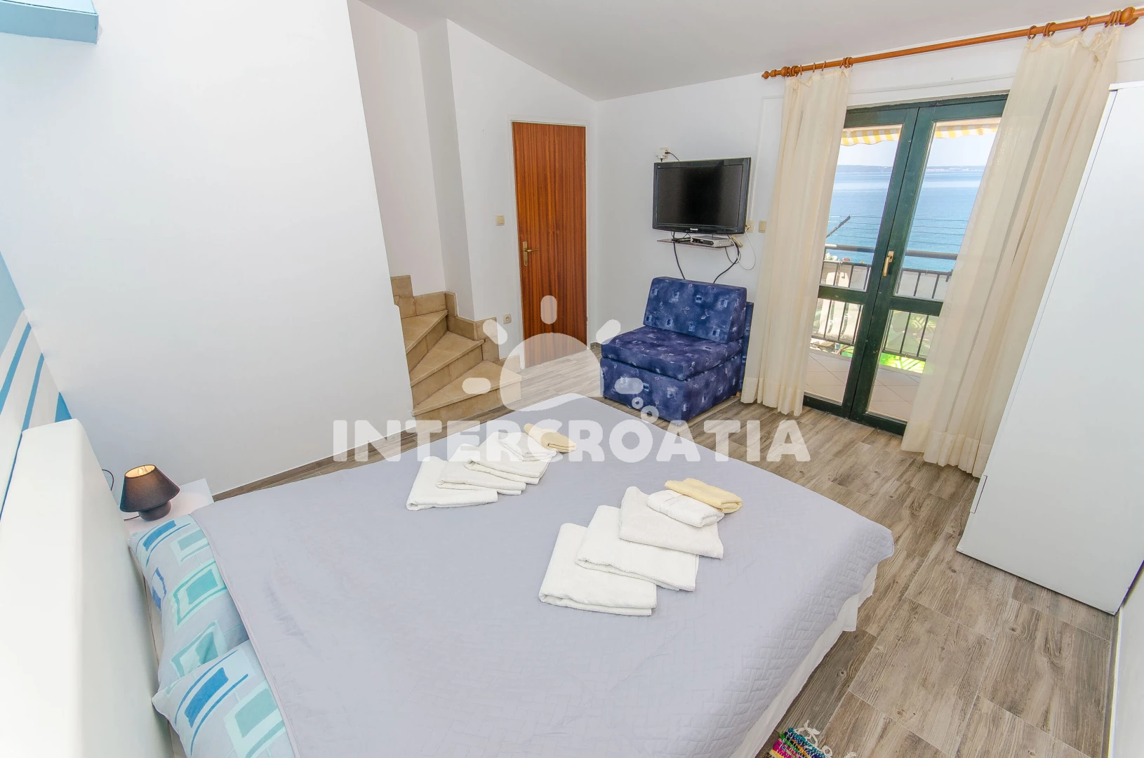 Apartmán (50 m2) s balkonem, s terasou, a výhledem na moře. Nachází se ve dvou patrech objektu. Apartmán má 1 ložnici a je vhodný pro až 8 osob. Kuchyňská linka je vybavena varnou deskou, toustovačem, kávovarem, troubou, mikrovlnnou troubou, rychlovarnou konvicí, nádobím, lednicí, mrazákem. K dispozici televize se satelitním programem, žehlička. První koupelna se sprchovým koutem, umyvadlem, fénem a WC. Druhá koupelna se sprchovým koutem, umyvadlem, fénem a WC.