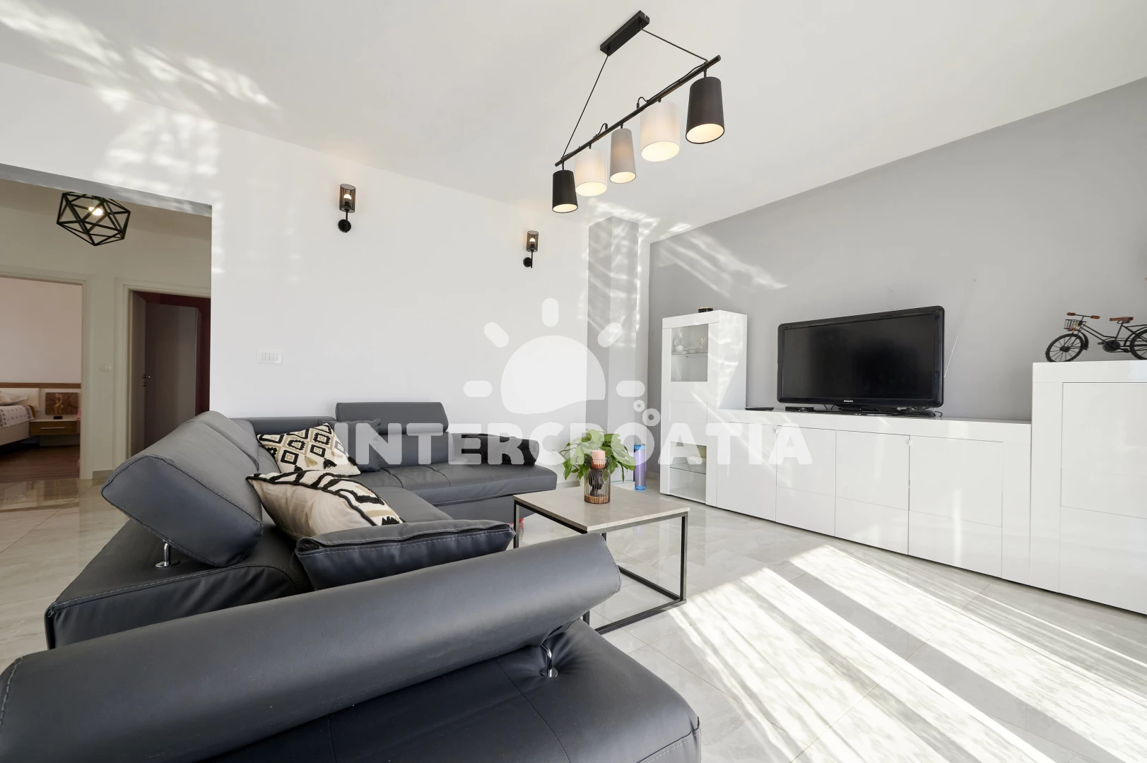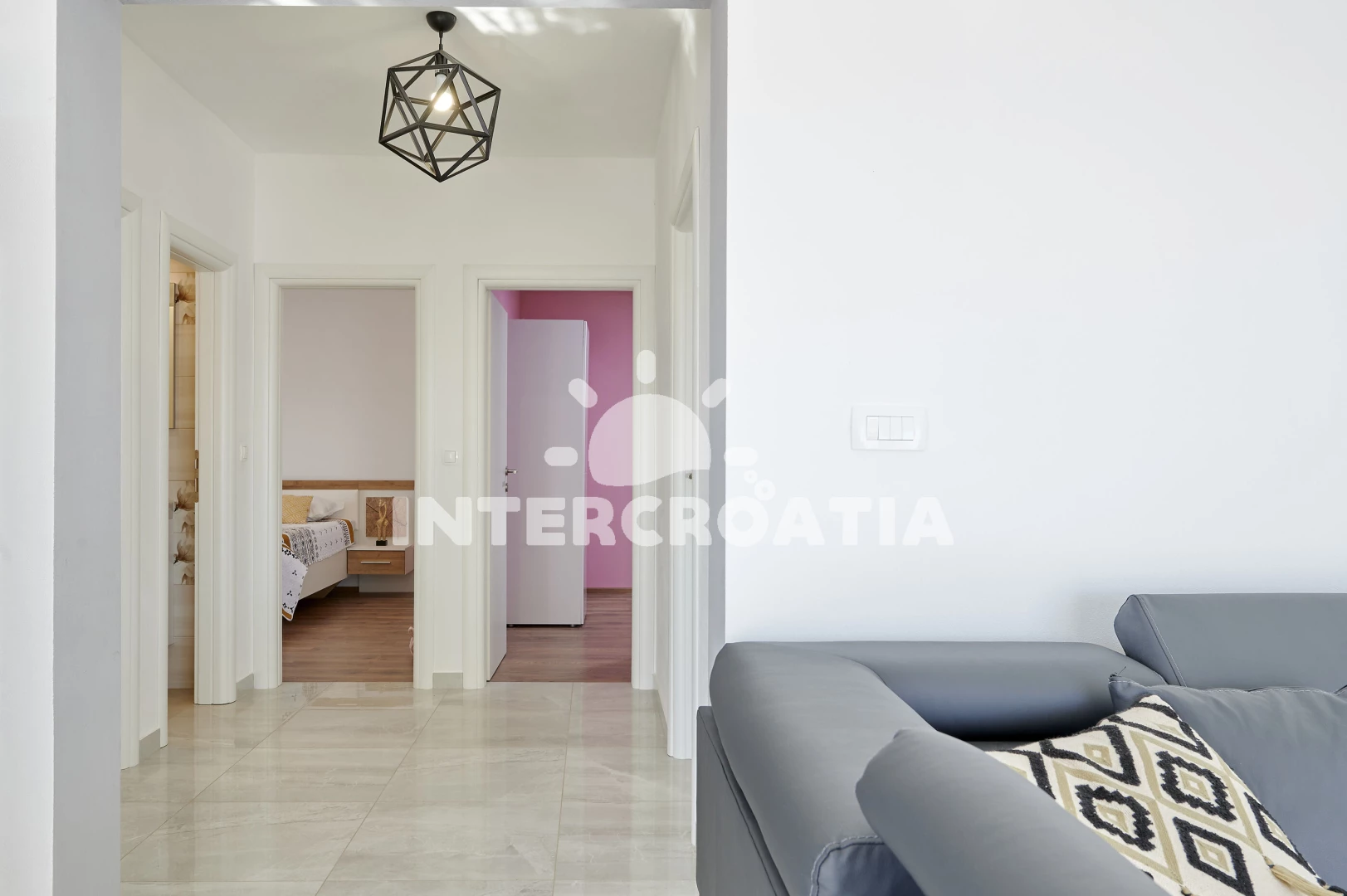 Apartmán (91 m2) s balkonem, a výhledem na moře. Nachází se ve 2. patře objektu. Apartmán má 2 ložnice a je vhodný pro až 5 osob. Kuchyňská linka je vybavena varnou deskou, kávovarem, troubou, toustovačem, myčkou na nádobí, mikrovlnnou troubou, rychlovarnou konvicí, nádobím, lednicí, mrazákem. V obývací místnosti je rozložitelná pohovka (extra lůžko pro 1 osobu). K dispozici televize se satelitním programem, žehlička. První ložnice s dvoulůžkem. Druhá ložnice s dvoulůžkem. Koupelna se sprchovým koutem, umyvadlem, fénem a WC. Dále samostatné WC.