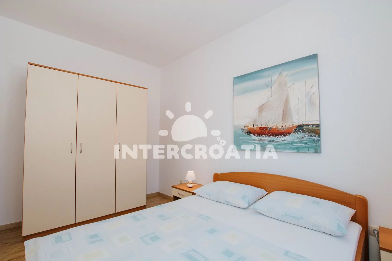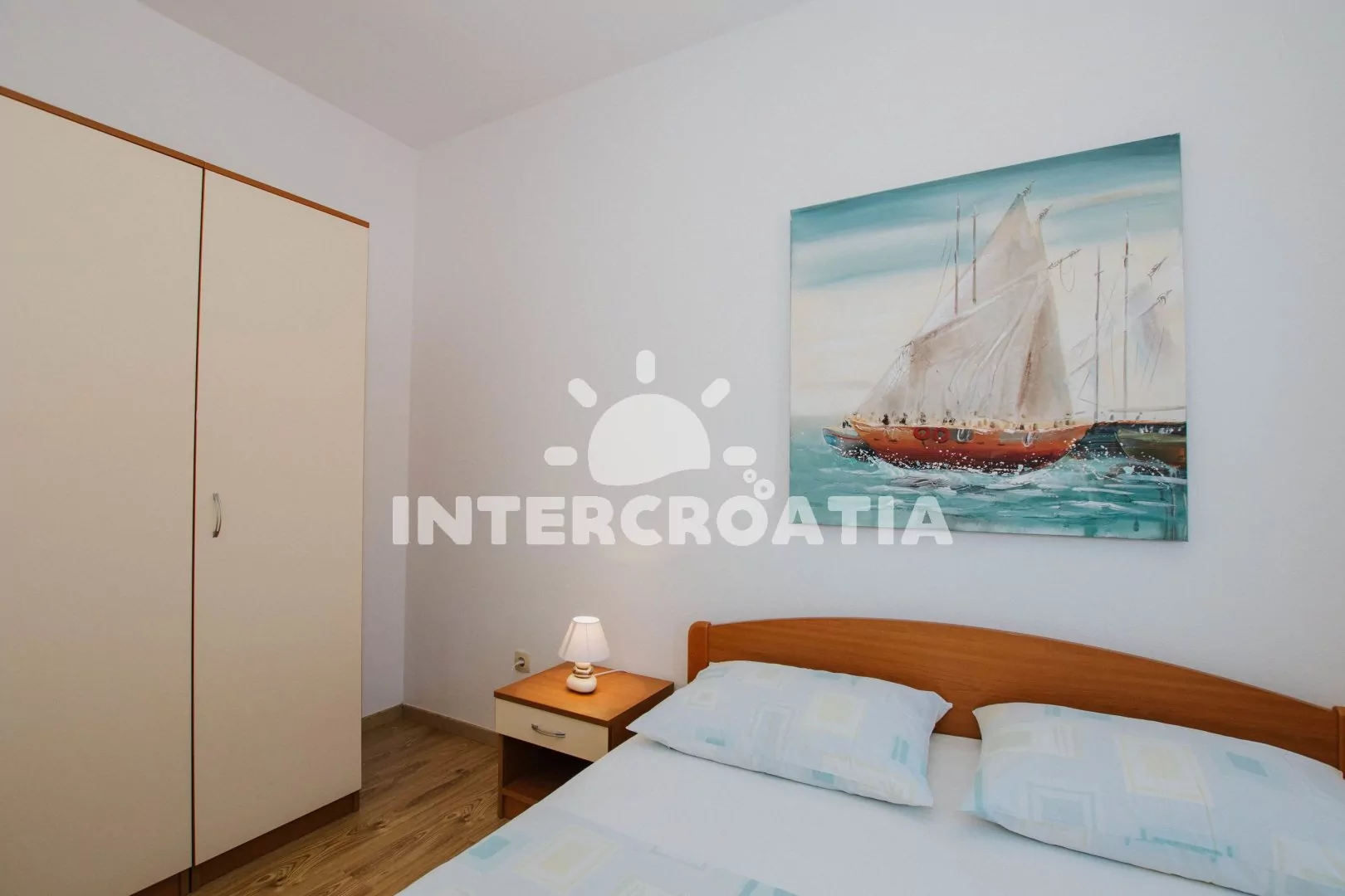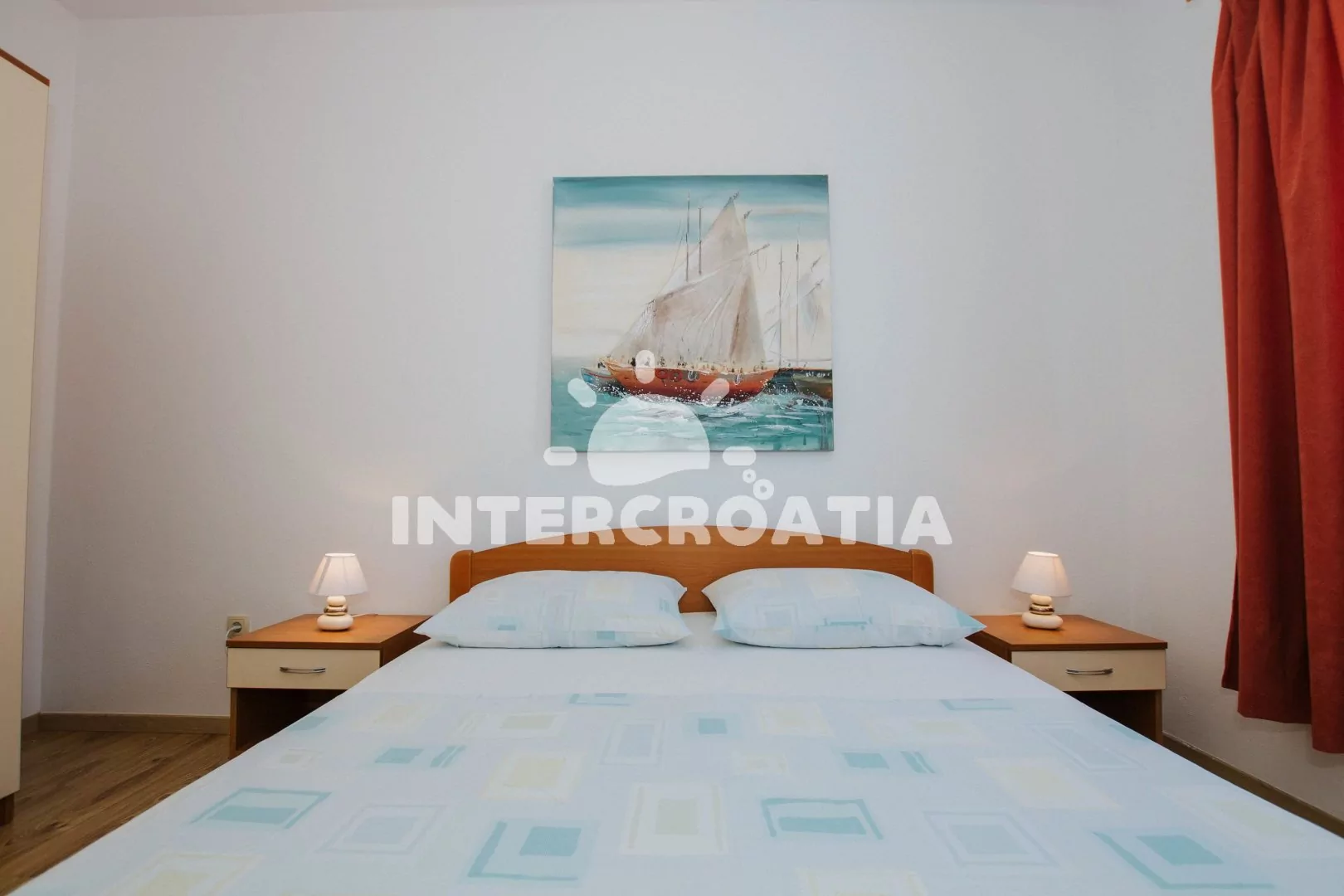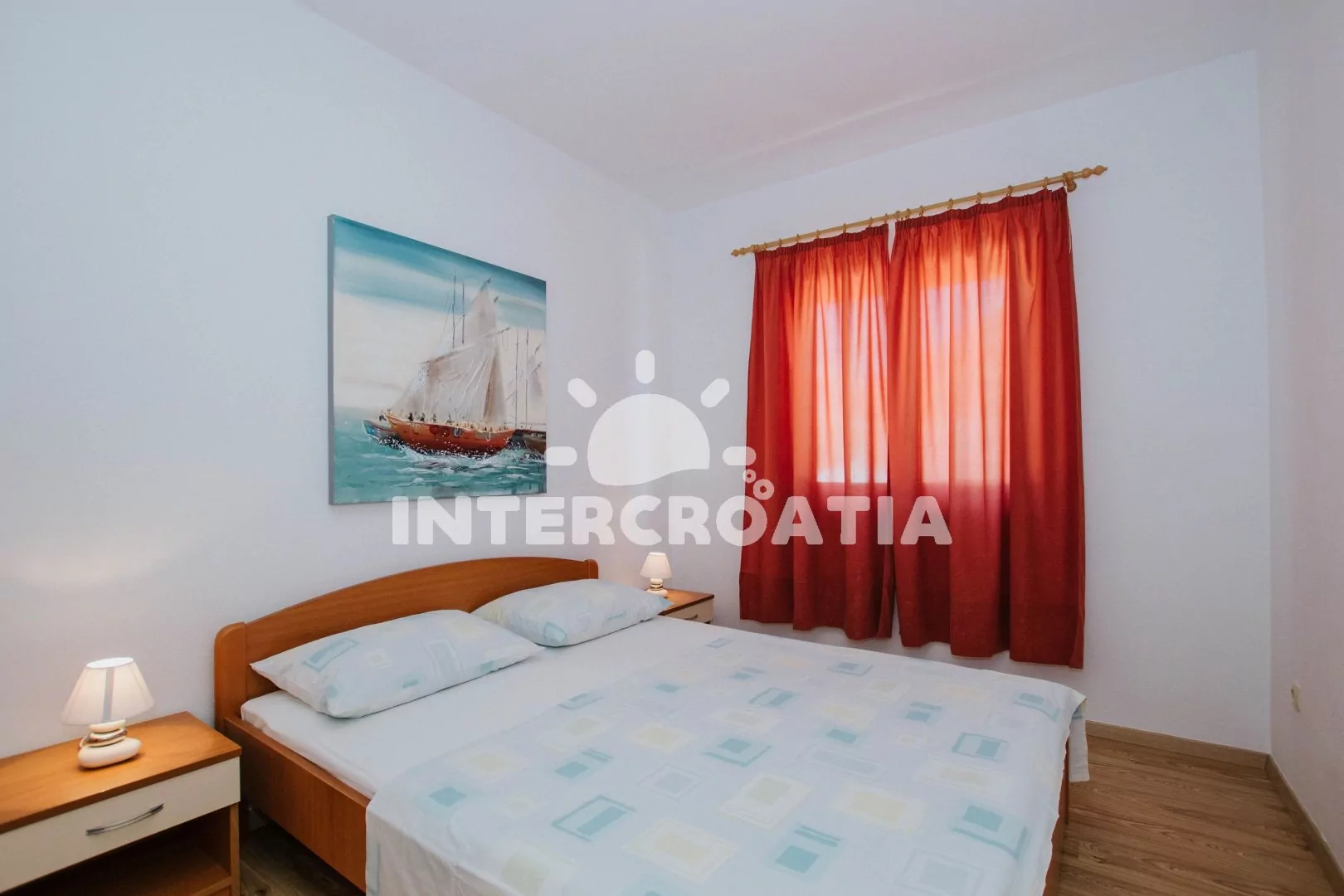 Komfortně zařízený apartmán v prvním patře domu je vhodný pro 2 až 4 osoby, disponuje balkonem s posezením a výhledem na moře. Obývací pokoj je spojený s kuchyní. Kuchyňská linka se sporákem, troubou, rychlovarnou konvicí, kávovarem, nádobím a lednicí s mrazákem. Obývací pokoj s jídelním stolem pro 6 osob, sedací soupravou, rozložitelnou pohovkou (extra lůžko pro 2 osoby), televizí se satelitním programem, vstupem na balkon a klimatizací. Ložnice je vybavena jedním dvoulůžkem. Koupelna se sprchovým koutem, umyvadlem a wc. Hosté mají k dispozici parkování u objektu zdarma.