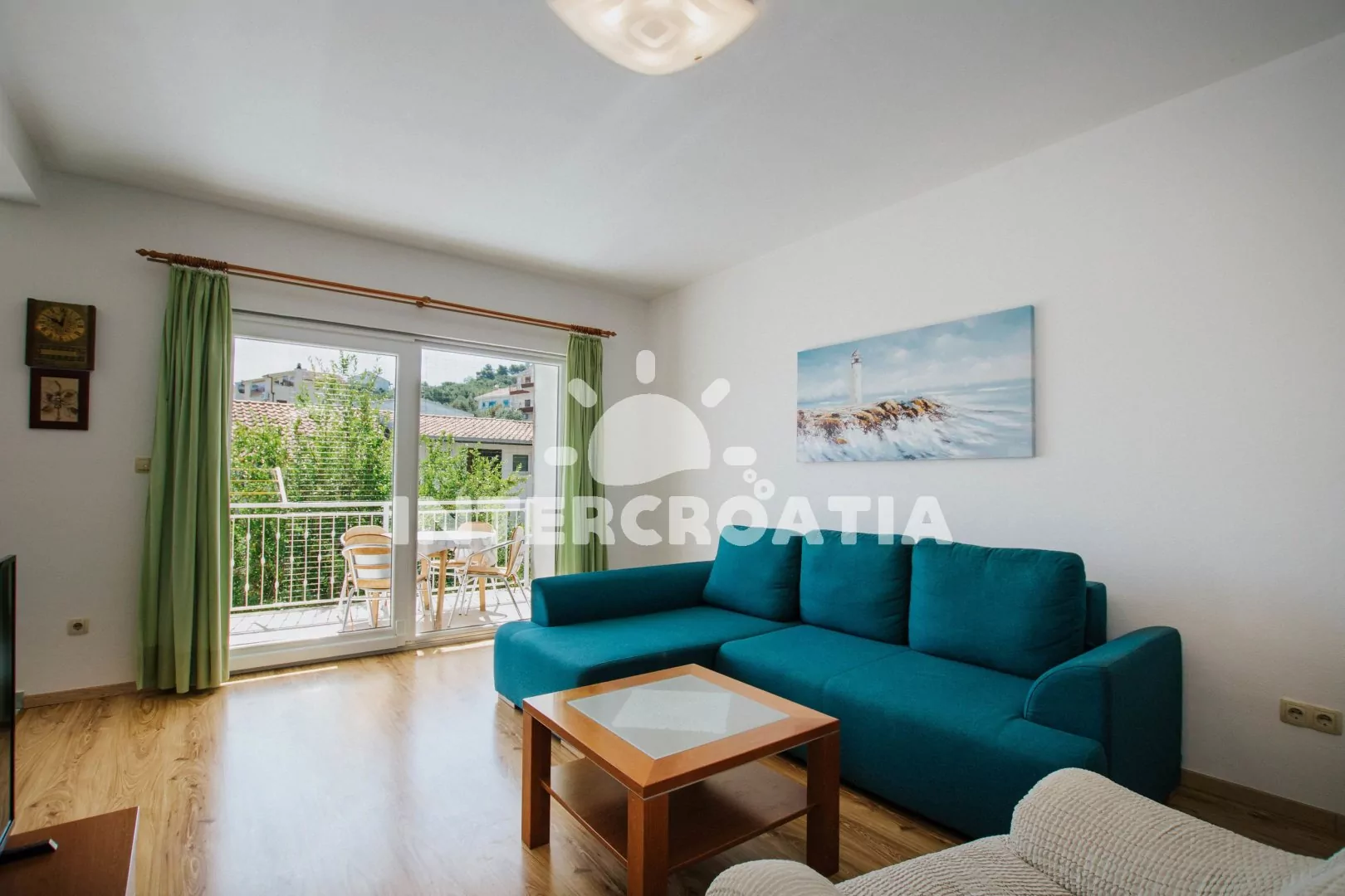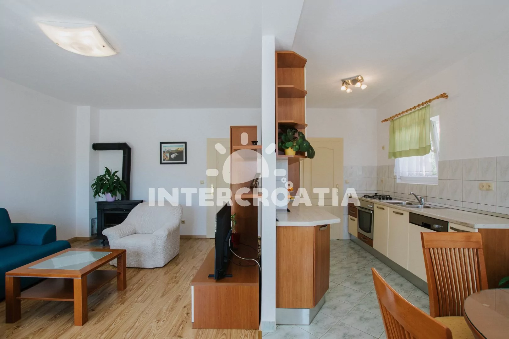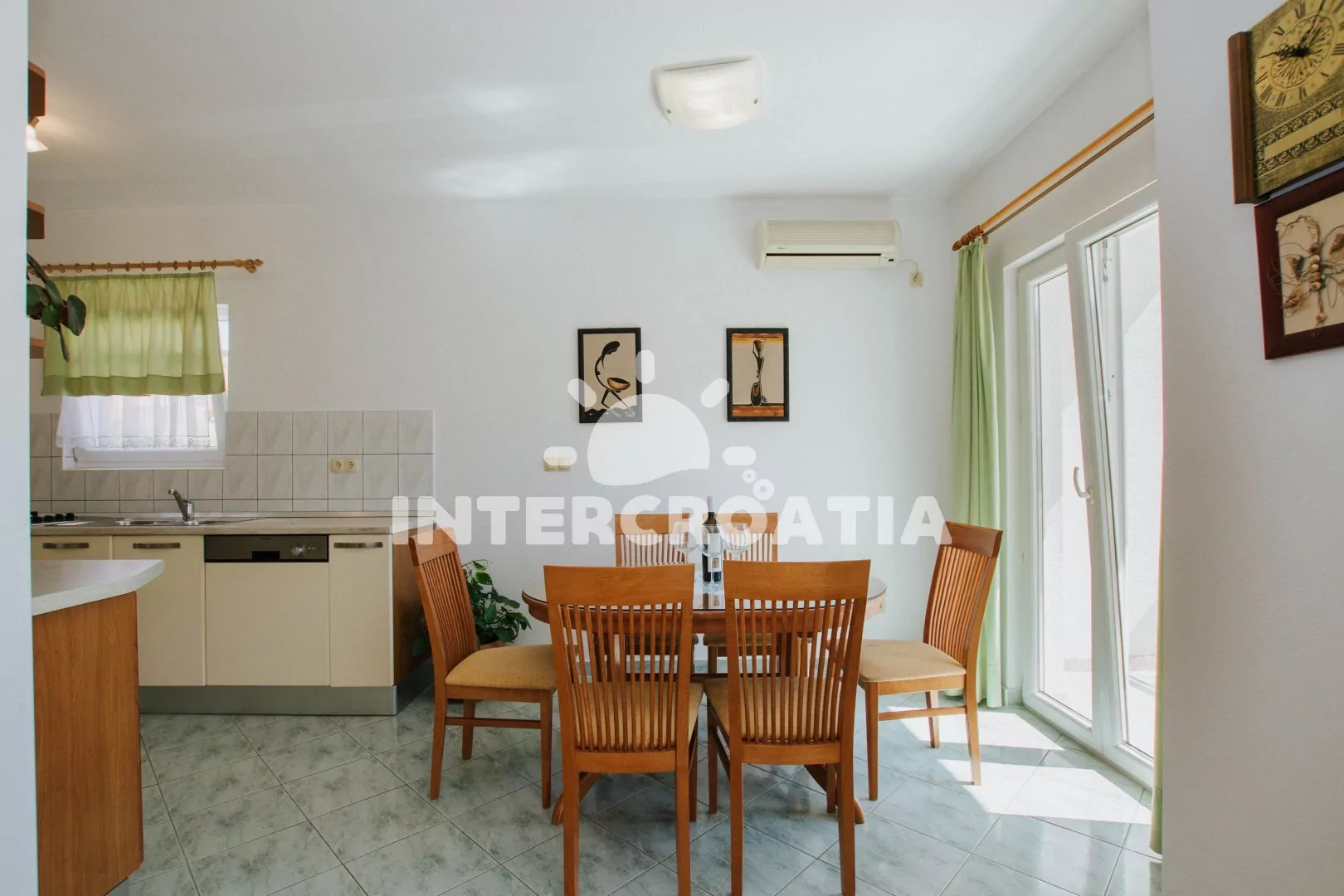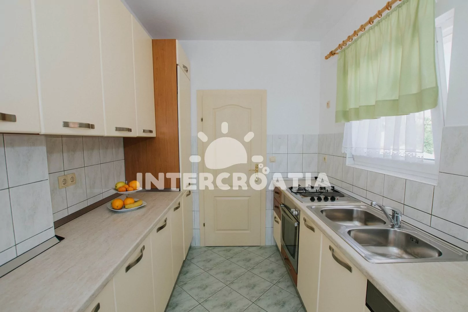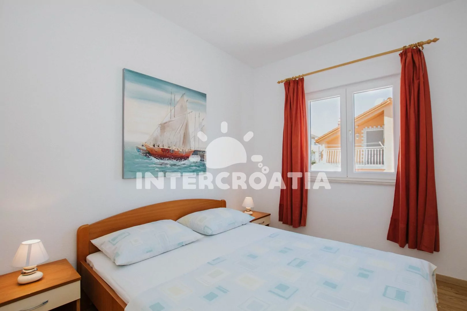 Komfortně zařízený apartmán v prvním patře domu je vhodný pro 2 až 4 osoby, disponuje balkonem s posezením a výhledem na moře. Obývací pokoj je spojený s kuchyní. Kuchyňská linka se sporákem, troubou, rychlovarnou konvicí, kávovarem, nádobím a lednicí s mrazákem. Obývací pokoj s jídelním stolem pro 6 osob, sedací soupravou, rozložitelnou pohovkou (extra lůžko pro 2 osoby), televizí se satelitním programem, vstupem na balkon a klimatizací. Ložnice je vybavena jedním dvoulůžkem. Koupelna se sprchovým koutem, umyvadlem a wc. Hosté mají k dispozici parkování u objektu zdarma.