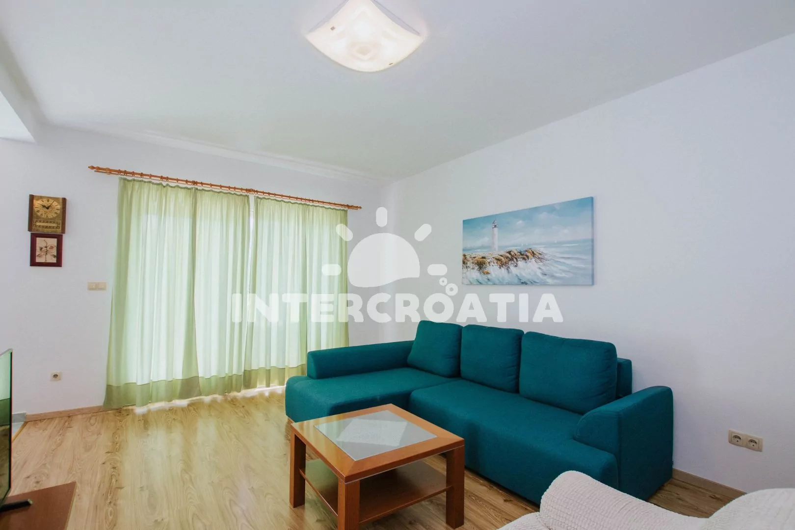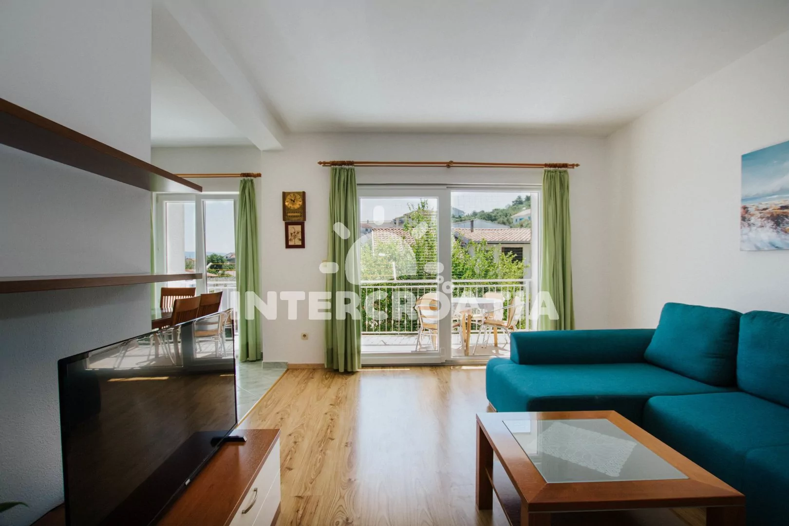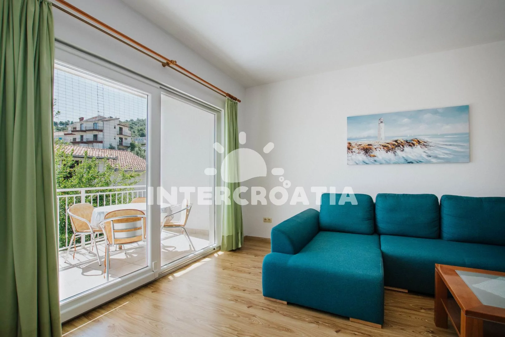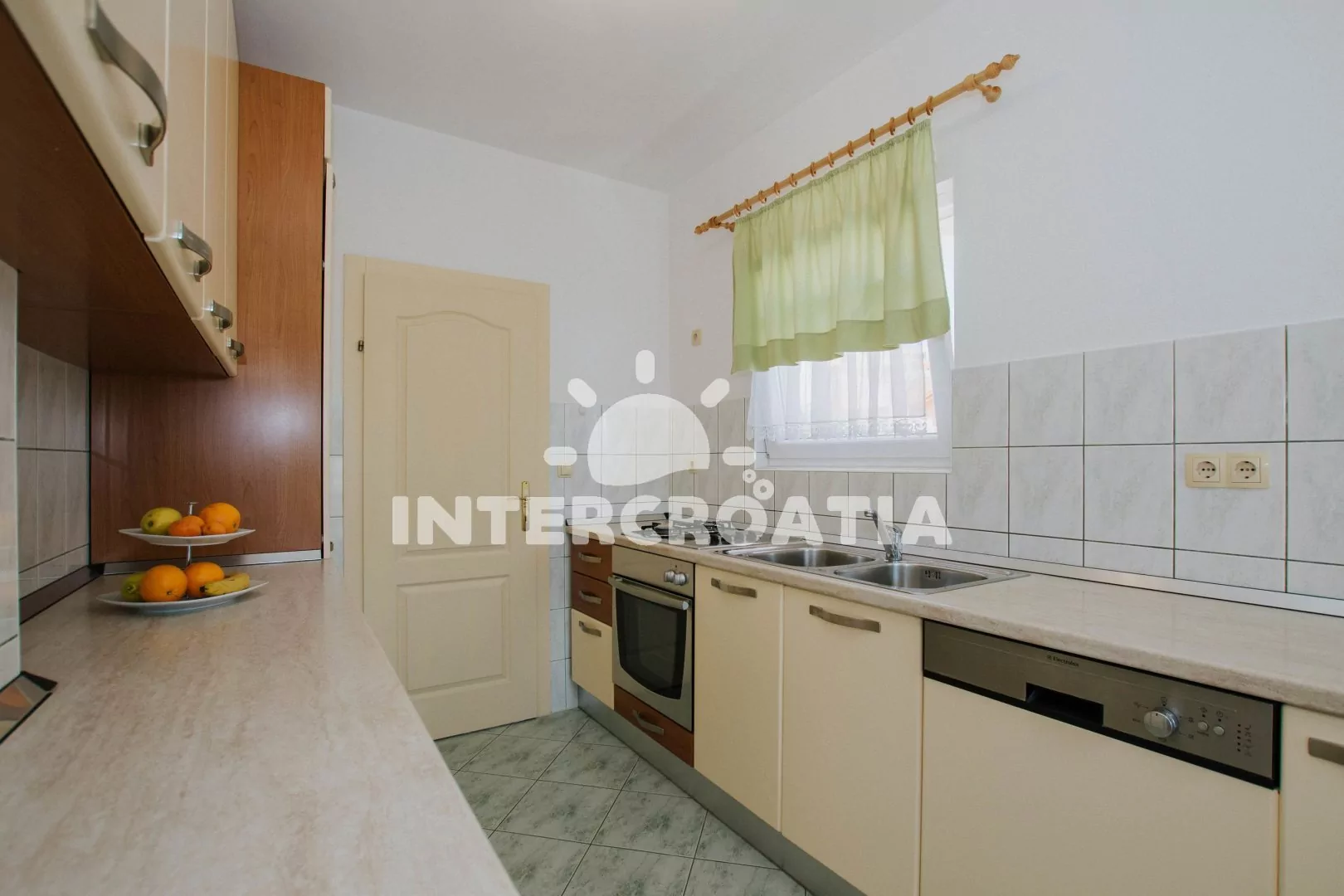 Komfortně zařízený apartmán v prvním patře domu je vhodný pro 2 až 4 osoby, disponuje balkonem s posezením a výhledem na moře. Obývací pokoj je spojený s kuchyní. Kuchyňská linka se sporákem, troubou, rychlovarnou konvicí, kávovarem, nádobím a lednicí s mrazákem. Obývací pokoj s jídelním stolem pro 6 osob, sedací soupravou, rozložitelnou pohovkou (extra lůžko pro 2 osoby), televizí se satelitním programem, vstupem na balkon a klimatizací. Ložnice je vybavena jedním dvoulůžkem. Koupelna se sprchovým koutem, umyvadlem a wc. Hosté mají k dispozici parkování u objektu zdarma.