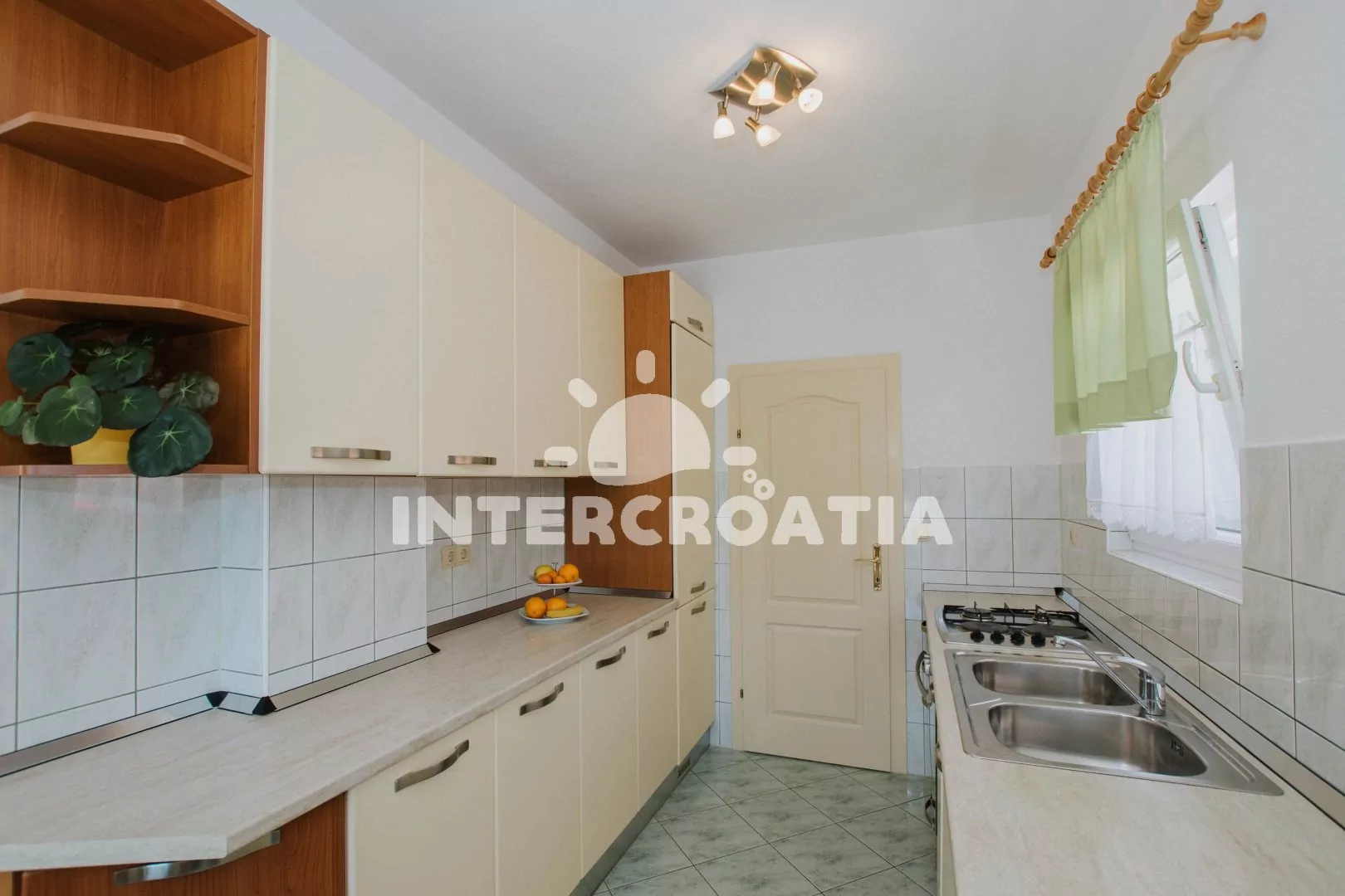 Komfortně zařízený apartmán v prvním patře domu je vhodný pro 2 až 4 osoby, disponuje balkonem s posezením a výhledem na moře. Obývací pokoj je spojený s kuchyní. Kuchyňská linka se sporákem, troubou…