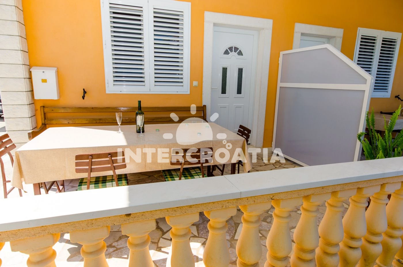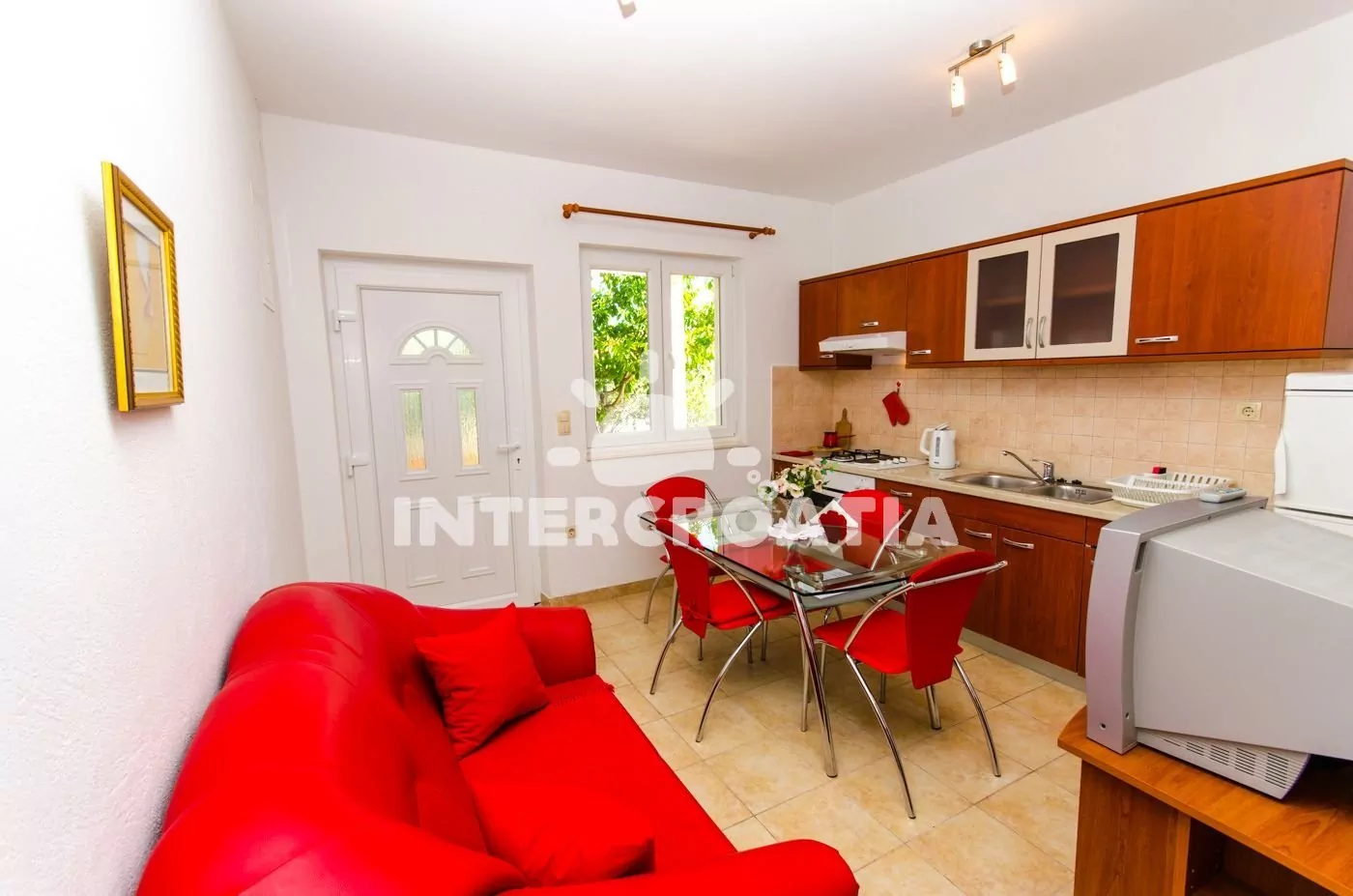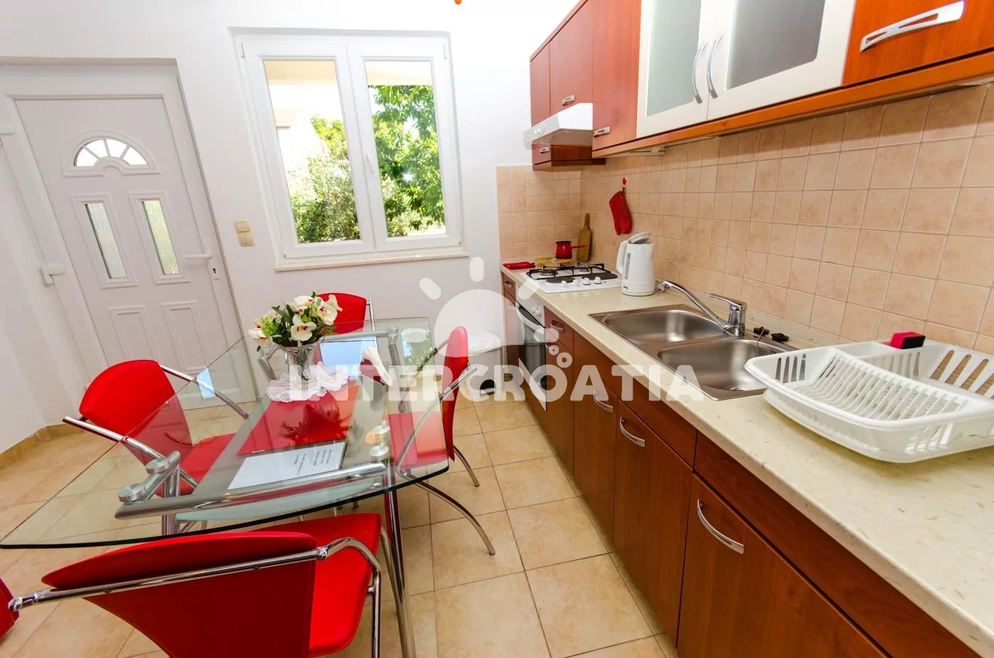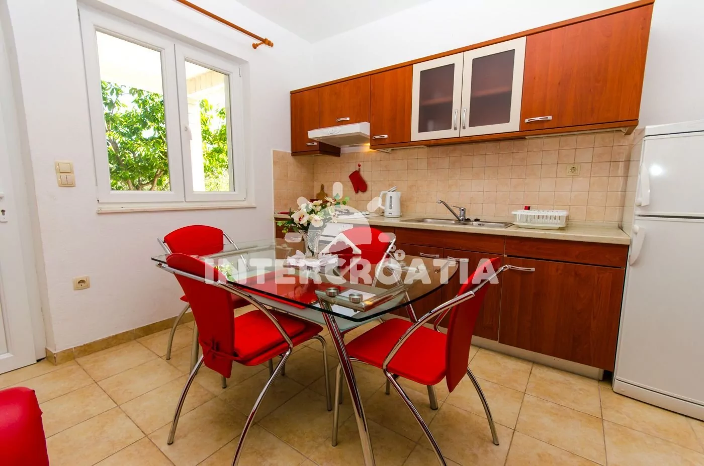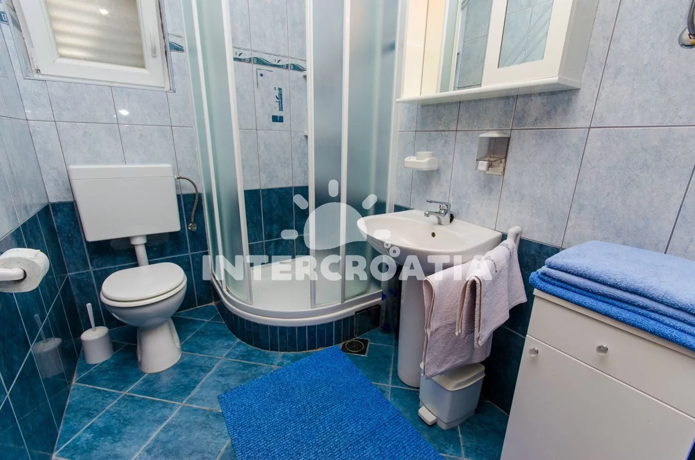 Vzdálenosti: Moře 200 m, pláž (oblázková) 400 m, centrum 300 m, market 200 m, pošta 500 m, lékárna 1 km, nemocnice 1 km, restaurace 100 m, směnárna 500 m, banka 1 km, muzeum 500 m, přístav 200 m, půjčovna kol 500 m, bar 100 m, čerpací stanice 3 km, trajekt (Split) 25 km, letiště (Split) 7 km.