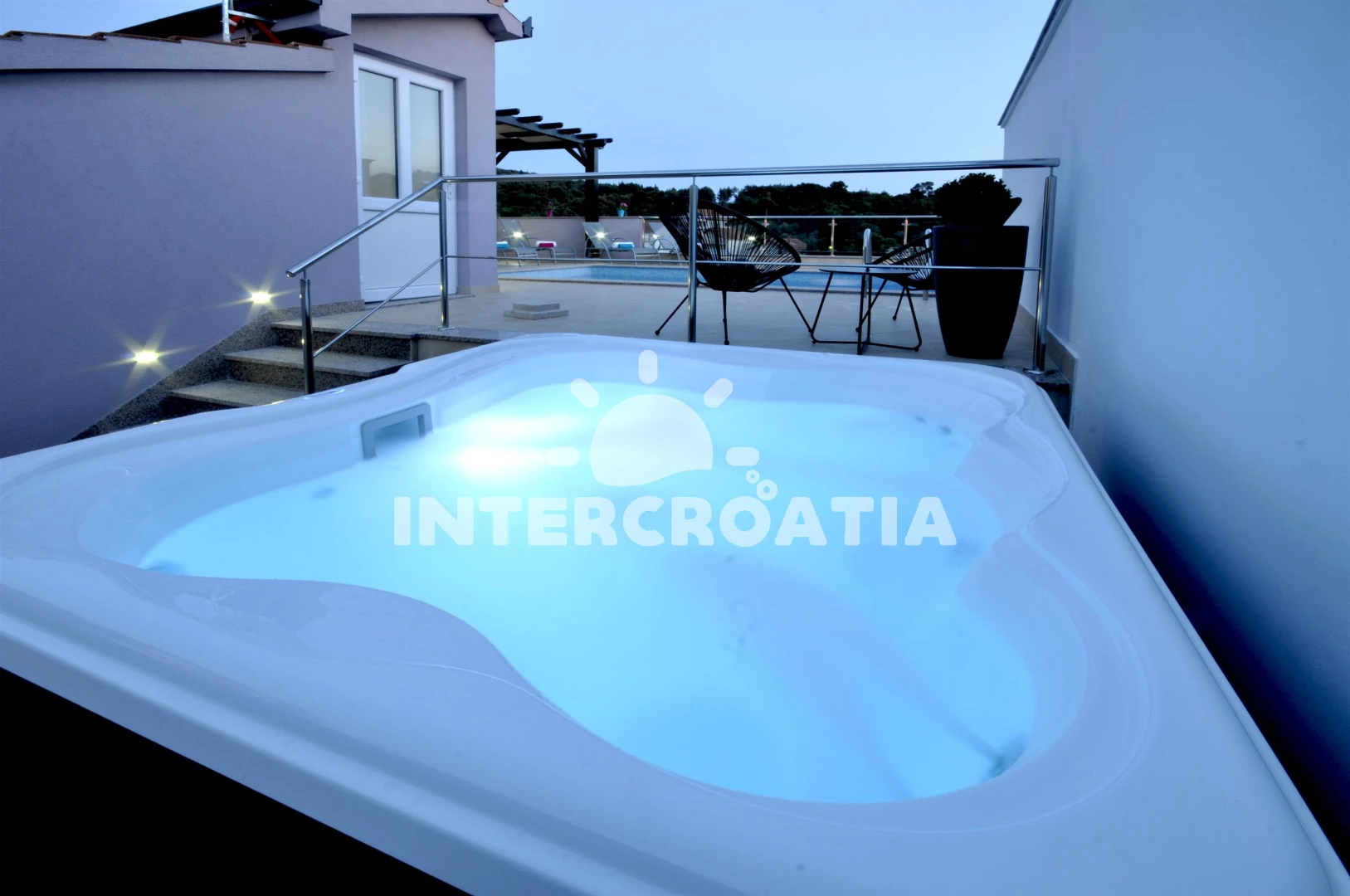Vila se nachází 800 m od moře a pláže. Pláž je oblázková a betonové desky. Vila disponuje bazénem s lehátky pro ubytované hosty. K dispozici vířivka. U objektu je k dispozici společná zahrada s posezením a grilem. Parkování je před domem.